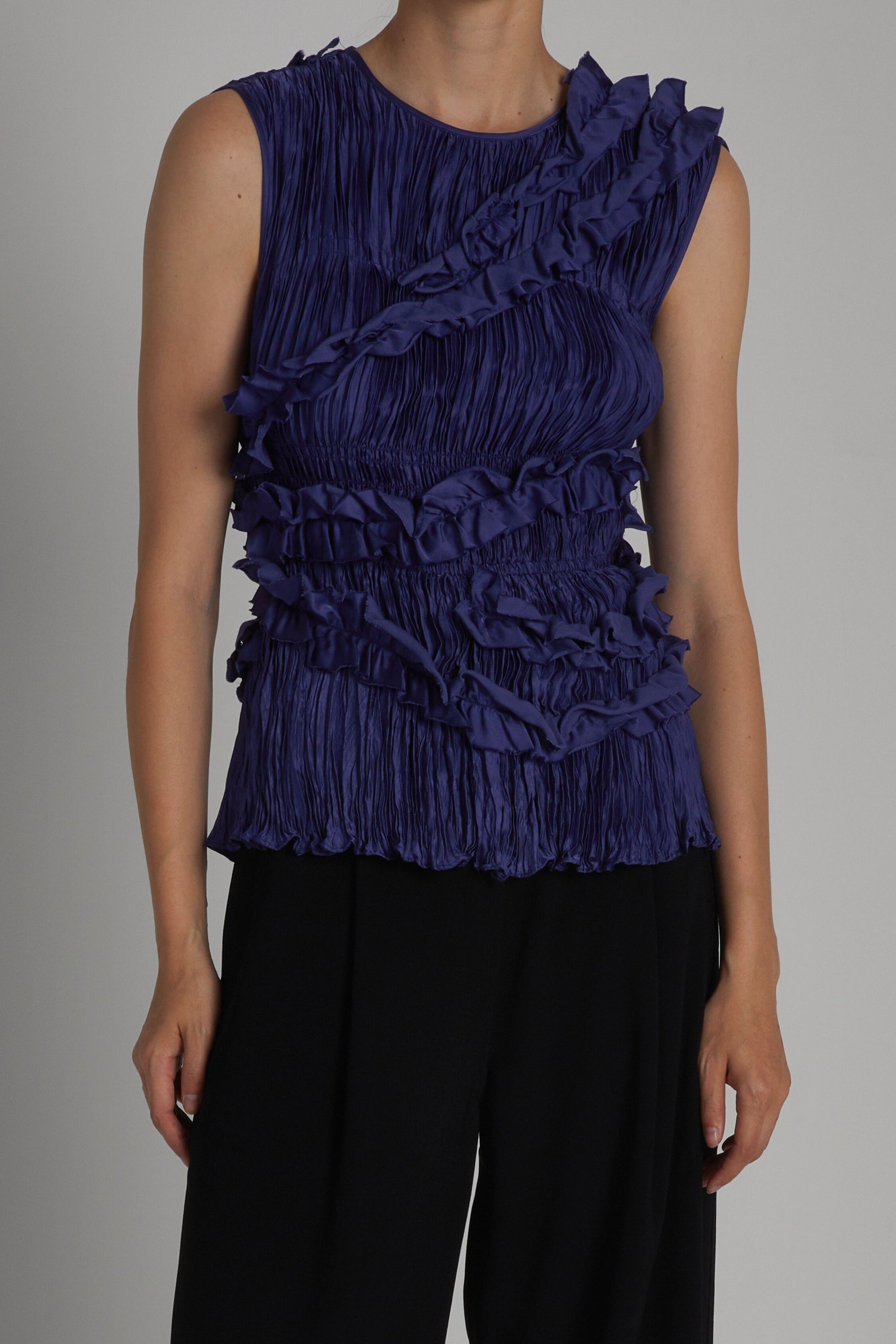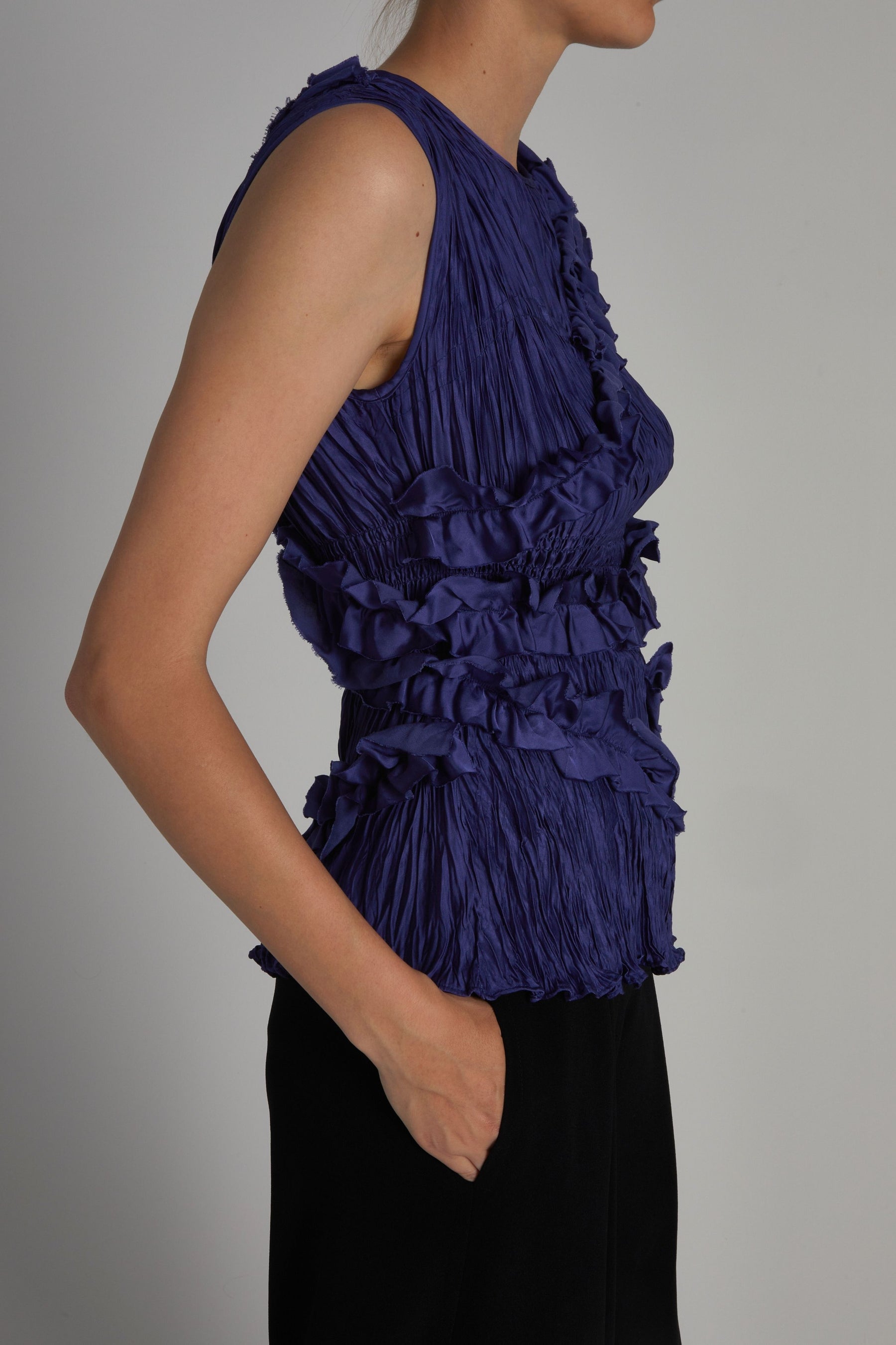 The Wells Sleeveless Blouse in midnight is a versatile addition to your wardrobe. The ruffled viscose fabric (also sustainable) adds a stylish statement while the light weight and easy fabrication make it comfortable for all-day wear. The light cinch around the bodice ensures a secure fit and pairs nicely with both jeans and trousers.