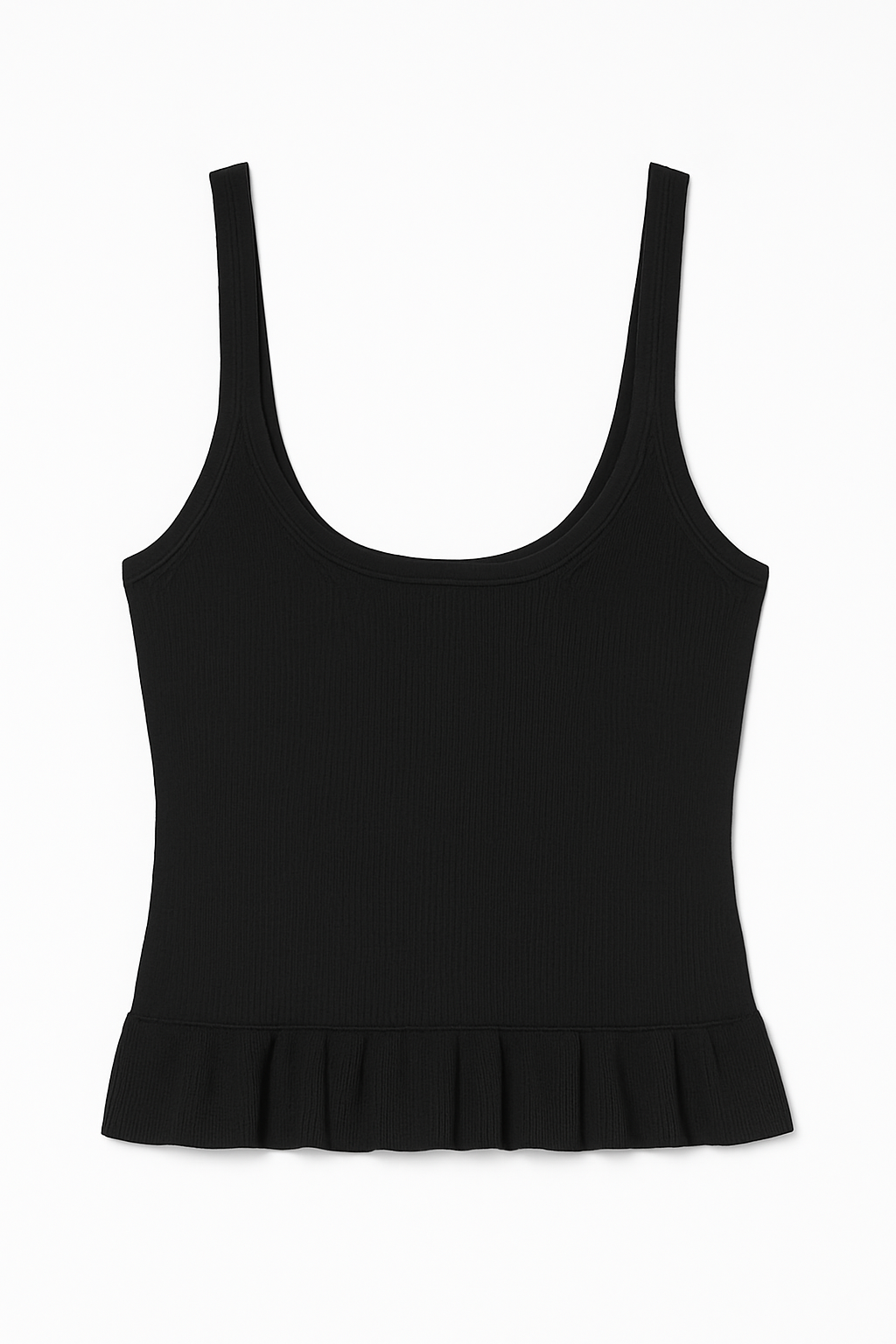 Crafted from 100% fine gauge merino wool, the Eden Ruffle Knit Tank in black offers a refined silhouette with its fitted design and elegant peplum hem. This versatile piece pairs seamlessly with the Tiffany trouser, creating a sophisticated ensemble ideal for both professional and upscale casual settings. The natural breathability and softness of merino wool ensure comfort throughout the day while maintaining a polished appearance.