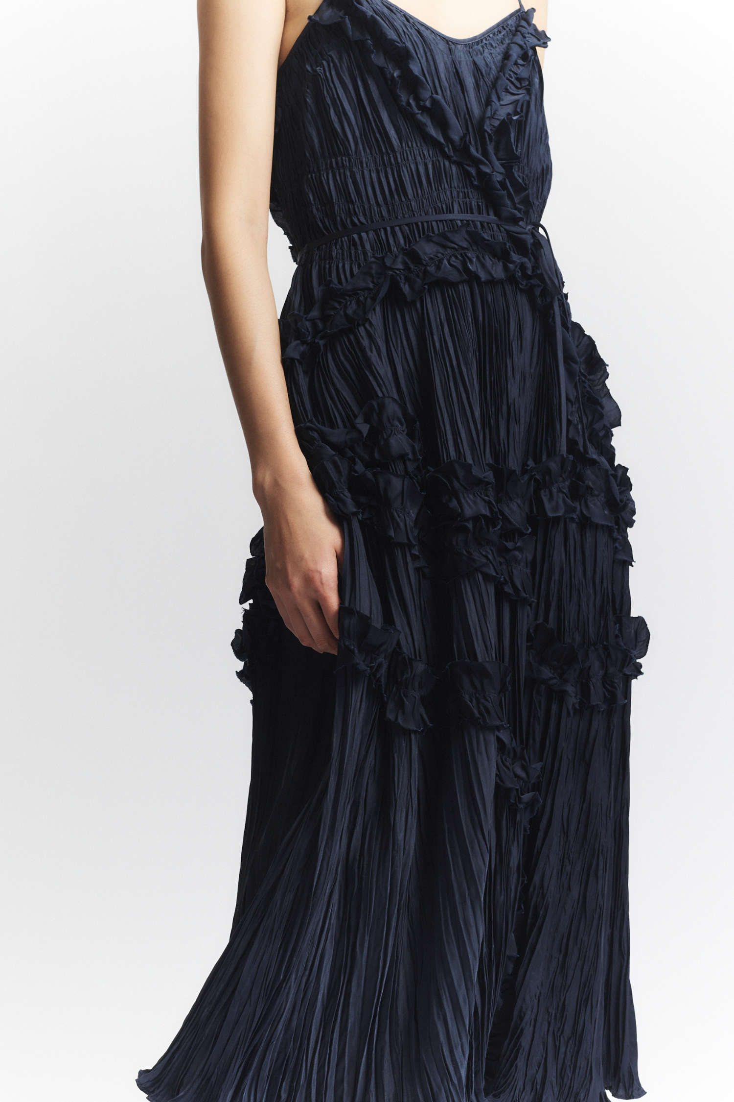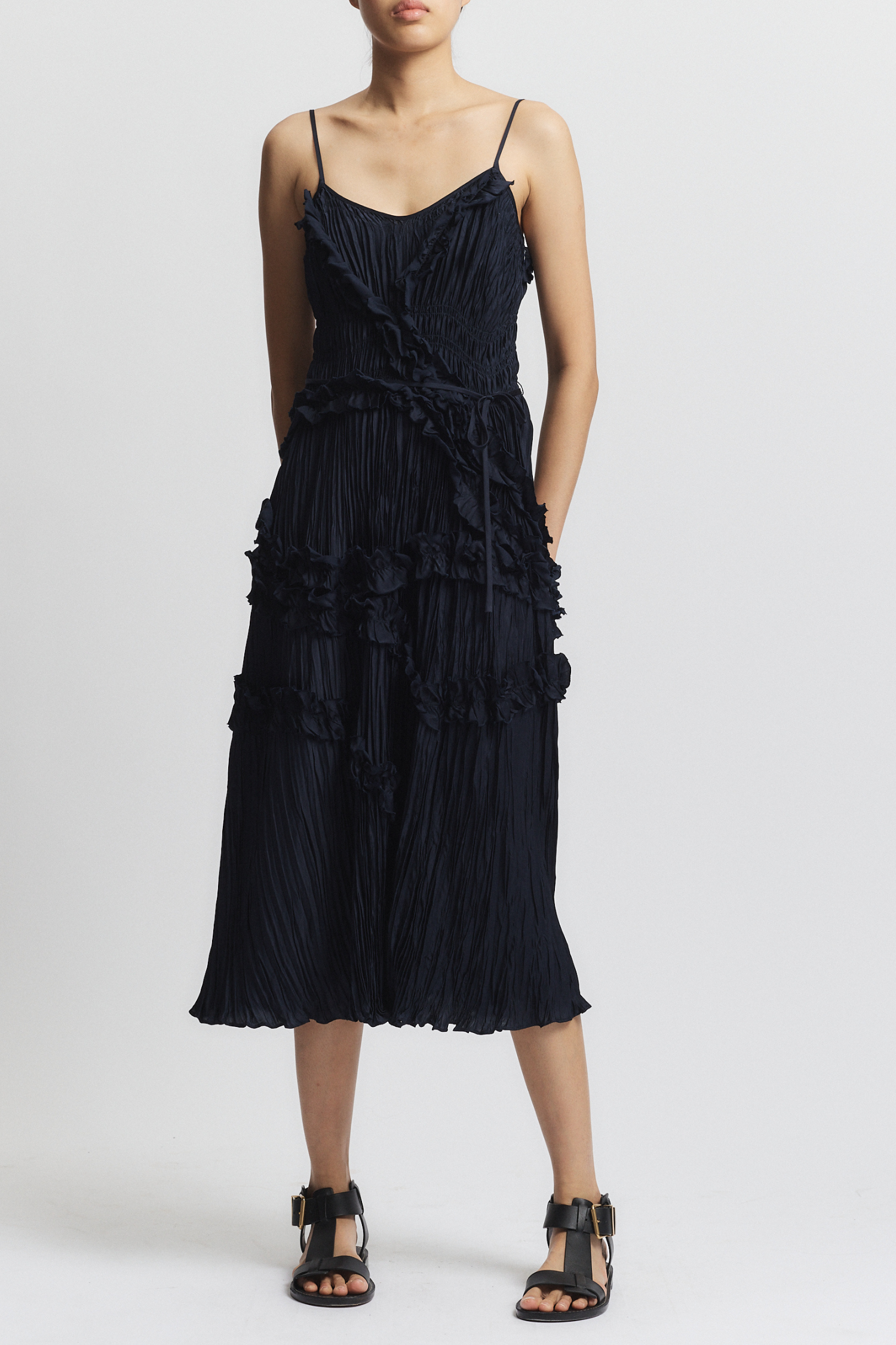 Elevate your style with our Bella Ruched Midi Dress in Navy. The ruched and ruffled viscose fabric adds a feminine touch to this dress, while the sweetheart neckline and adjustable straps allow for a customizable fit. Complete with a removable tie at the waist, this dress is girly, sophisticated, and sure to make a statement.