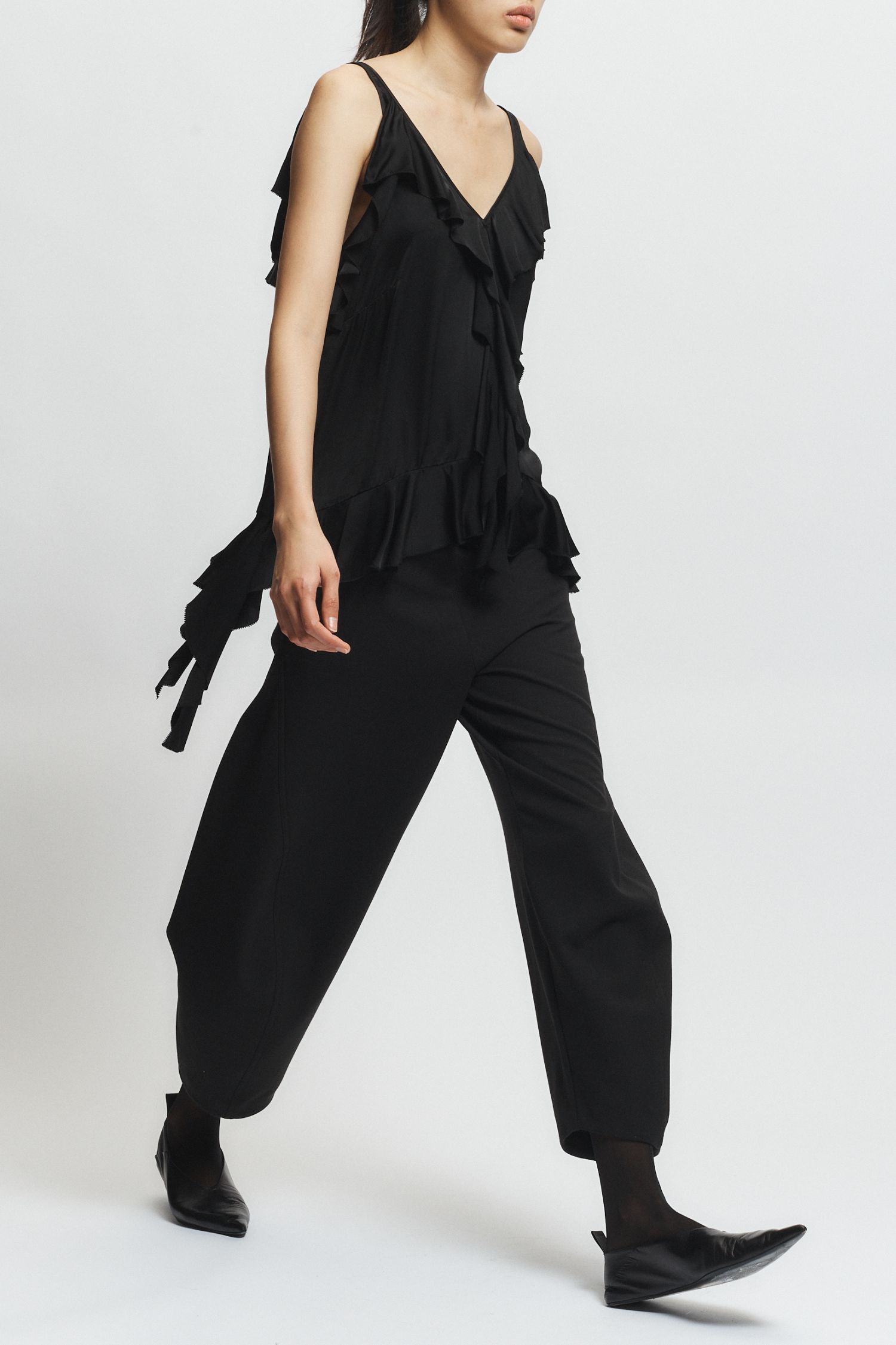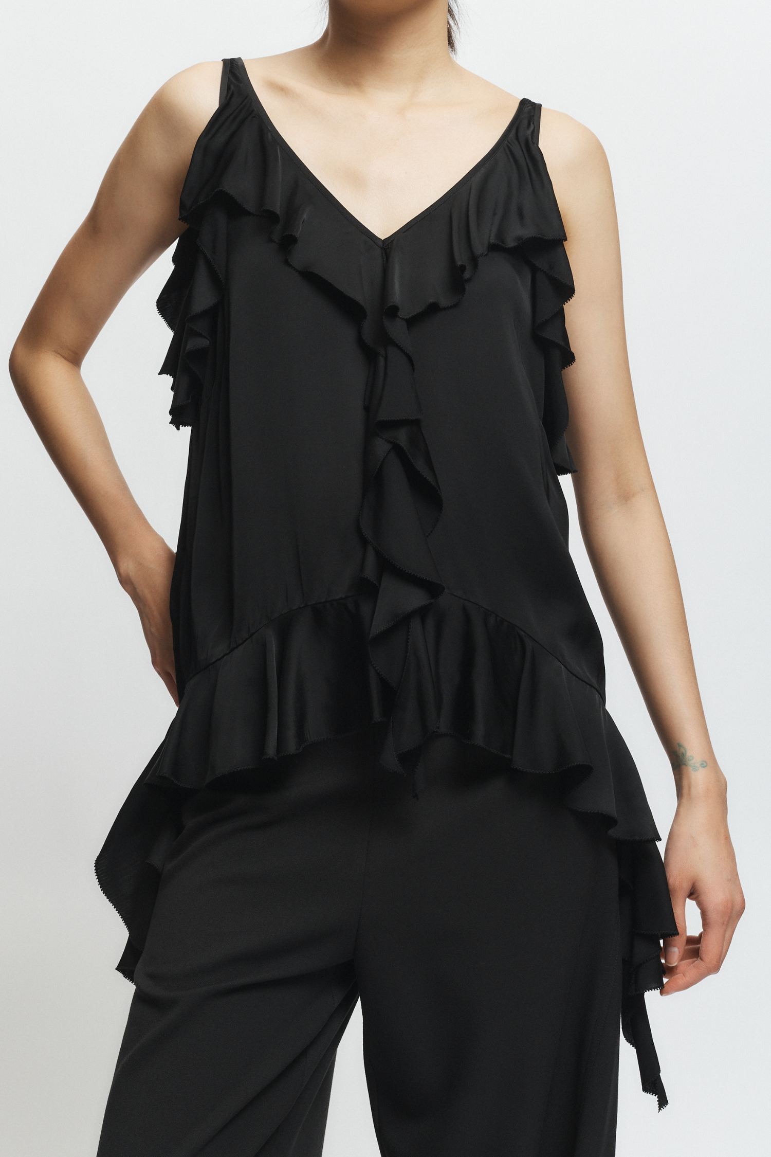 Elevate your wardrobe with the Cade Ruffled Viscose Top in black. Crafted from lightweight viscose, its flowy silhouette and delicate ruffles add refined movement and texture. Perfectly pairs with the Kelce Barrel Trouser in black for a sophisticated, cohesive look ideal for both professional and elegant occasions.