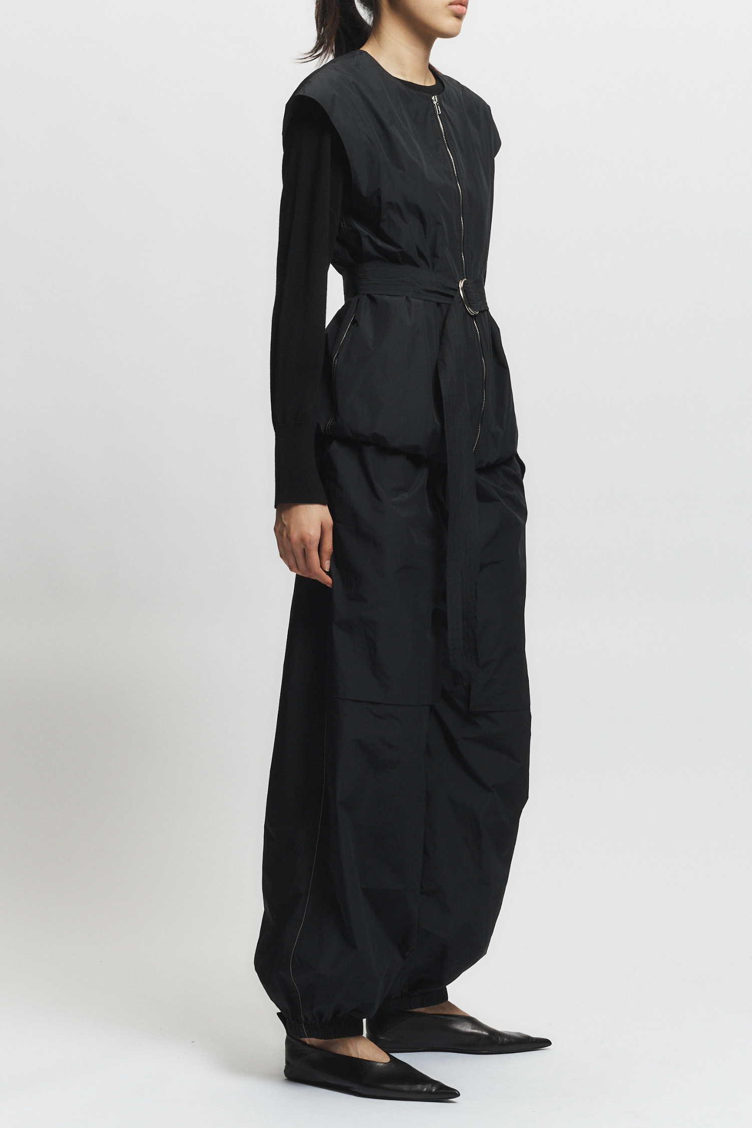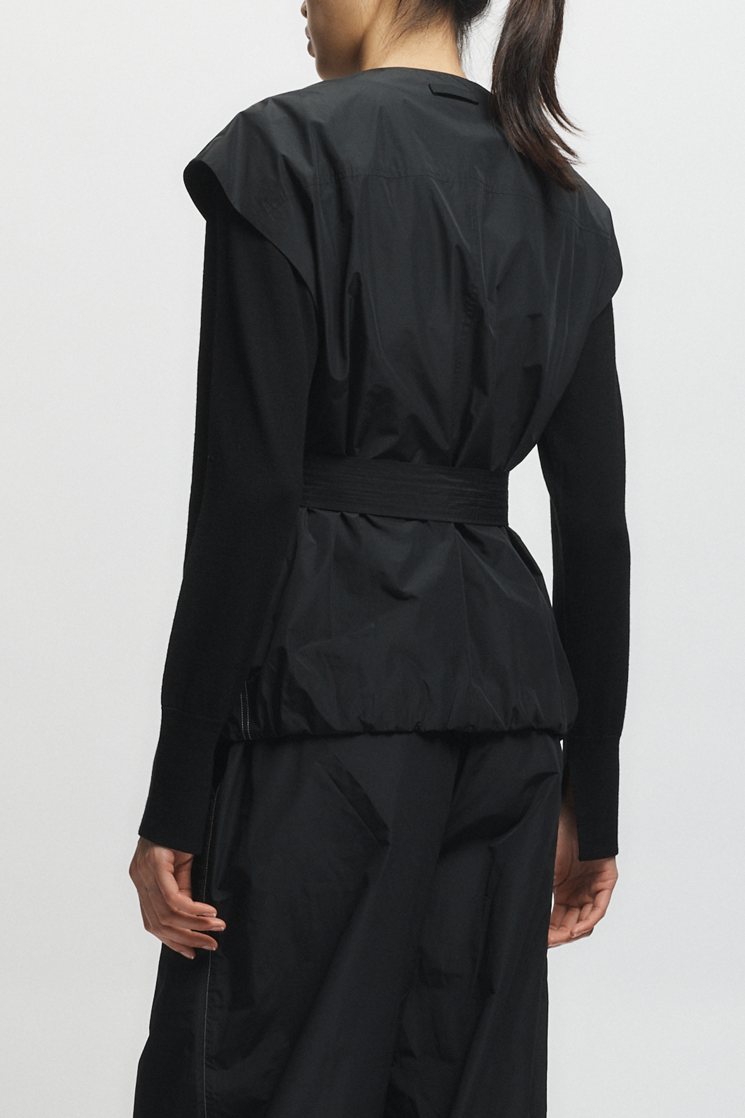 The Elijah Oversized Taffeta Vest in black combines an oversized silhouette with a cinched waist belt, offering both comfort and definition. Pair it seamlessly with the Clyde oversized pant for a balanced, contemporary outfit that emphasizes refined volume and tailored elegance.