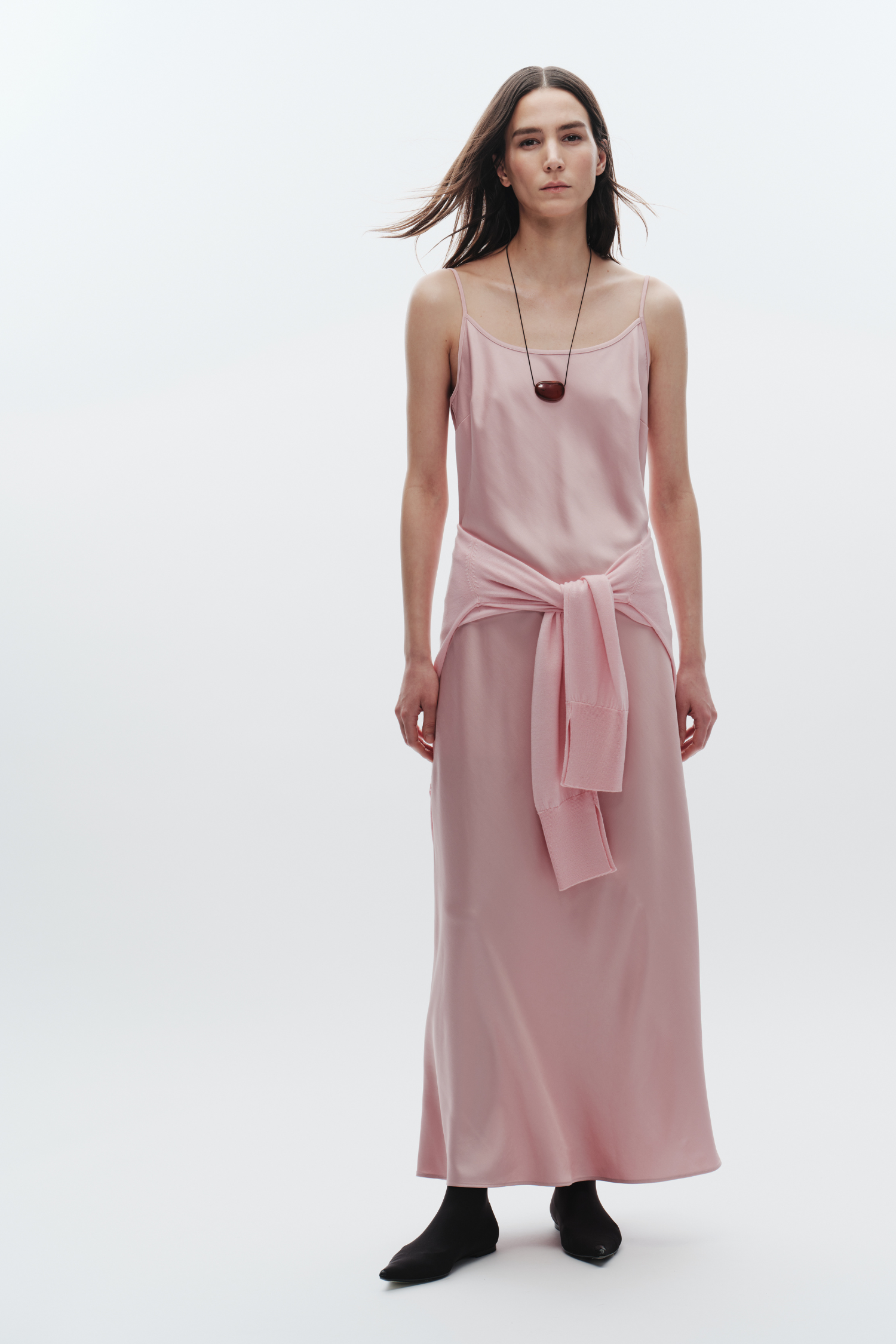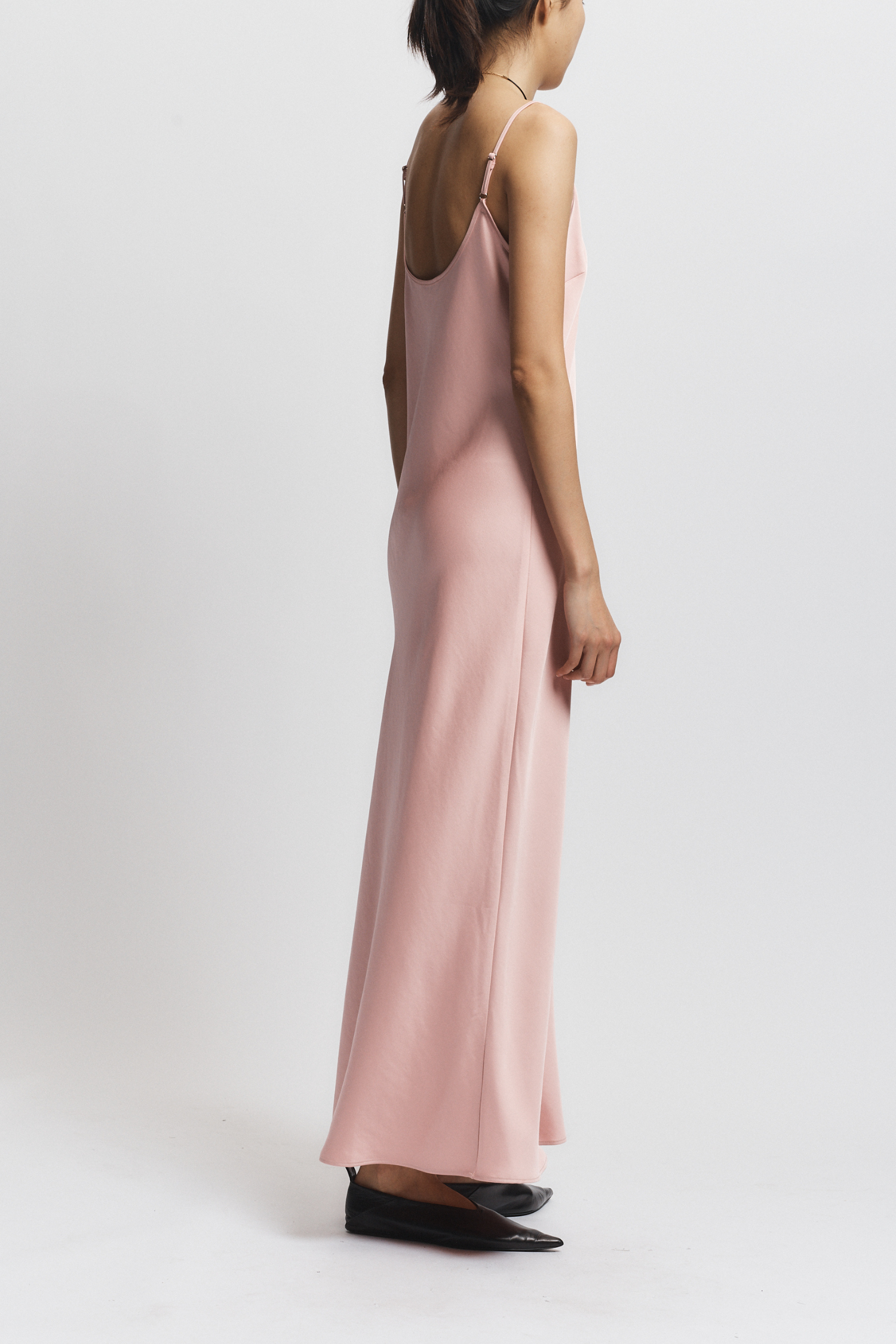 Transform your wardrobe with our versatile Haley Dress in light pink. This full-length slip dress features adjustable straps and can easily transition from day to night. Machine washable for convenience, this dress pairs perfectly with our merino wool sweaters for an effortless look.