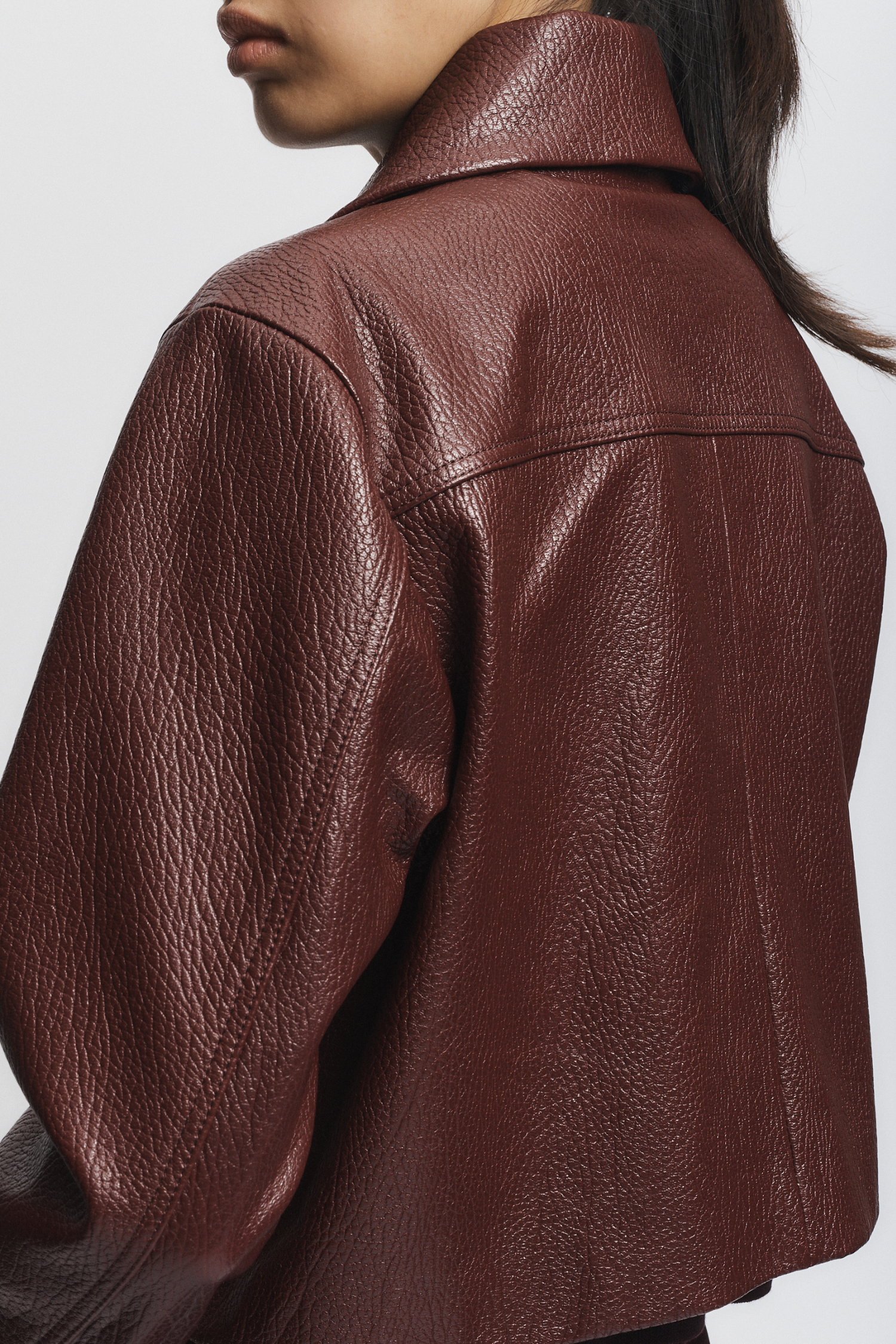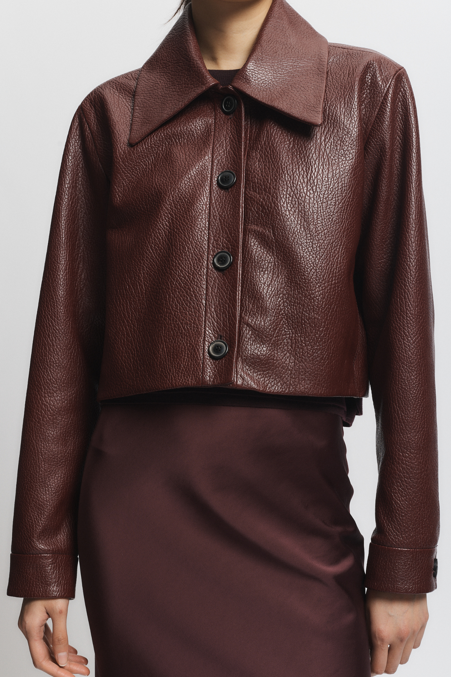 Crafted from premium crinkle leather, this cropped jacket in rich Burgundy offers a sophisticated edge to your wardrobe. Its tailored fit enhances silhouette definition while the textured leather adds depth and character. Ideal for layering, it combines timeless style with expert craftsmanship for a versatile, statement outerwear piece.