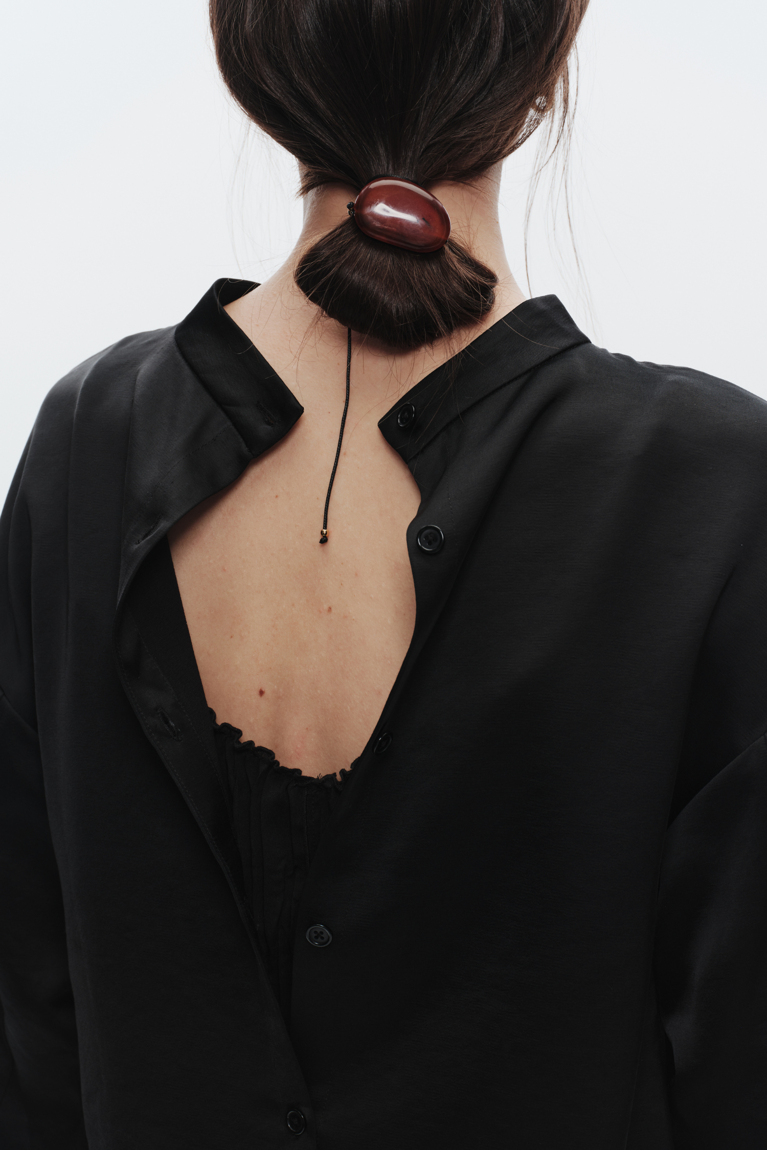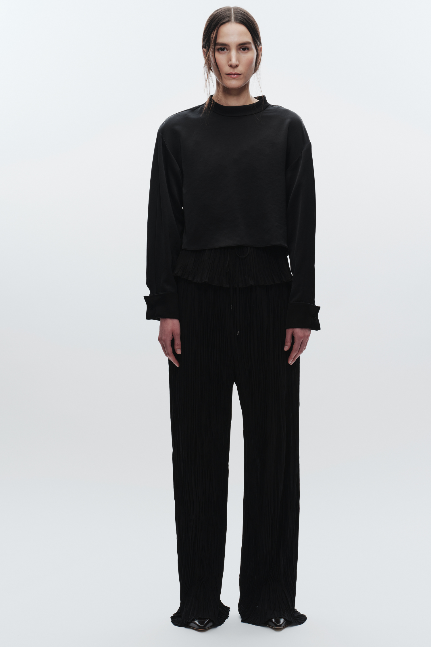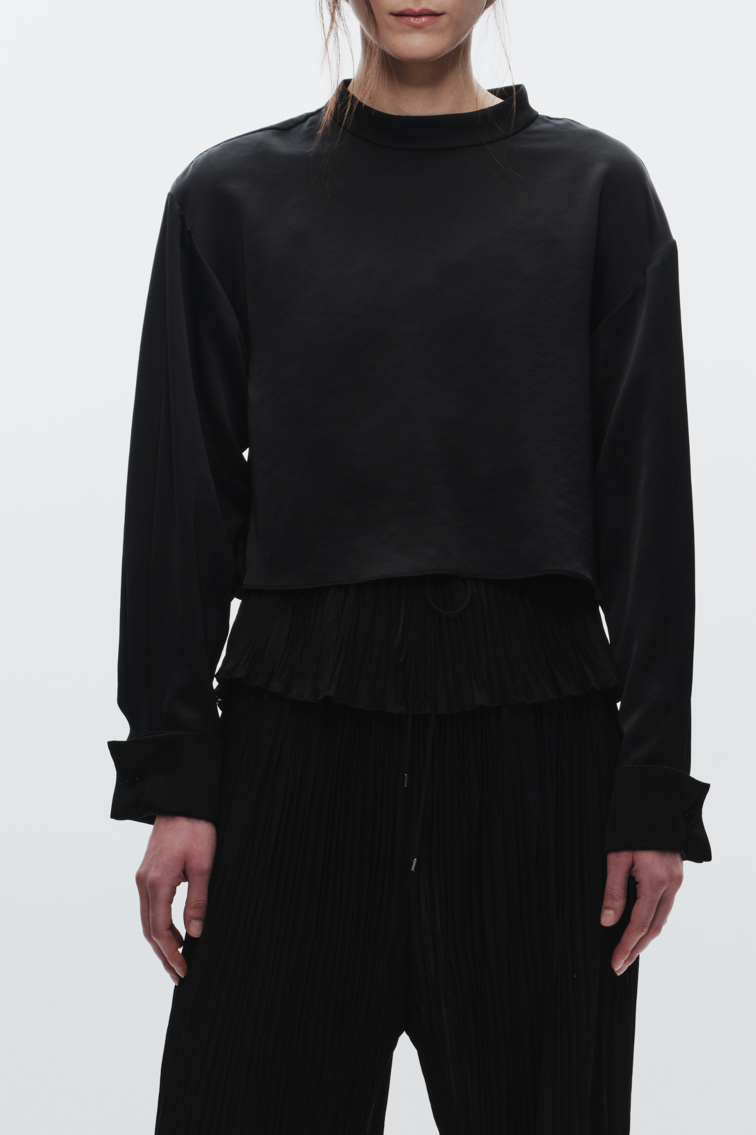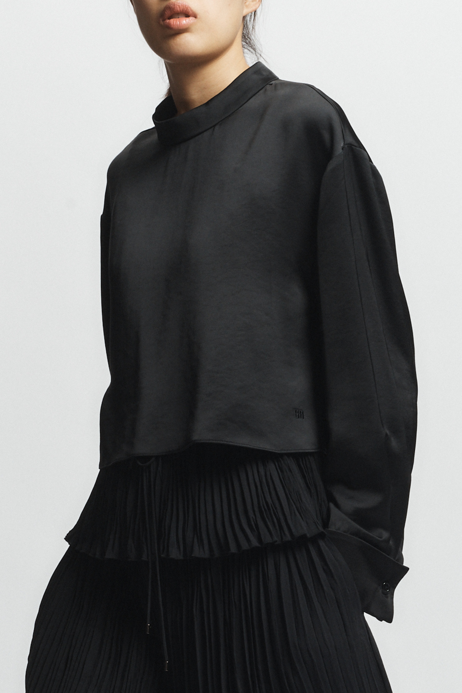 Elevate your wardrobe with the Riggs Mock Neck Charmeuse Top in black. Featuring a sophisticated high neck design, this top offers a sleek silhouette perfect for layering or wearing alone. Crafted from smooth charmeuse fabric, it pairs effortlessly with the Idris semi-sheer skirt in black, creating a refined and modern ensemble ideal for both day and evening occasions.