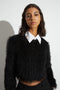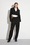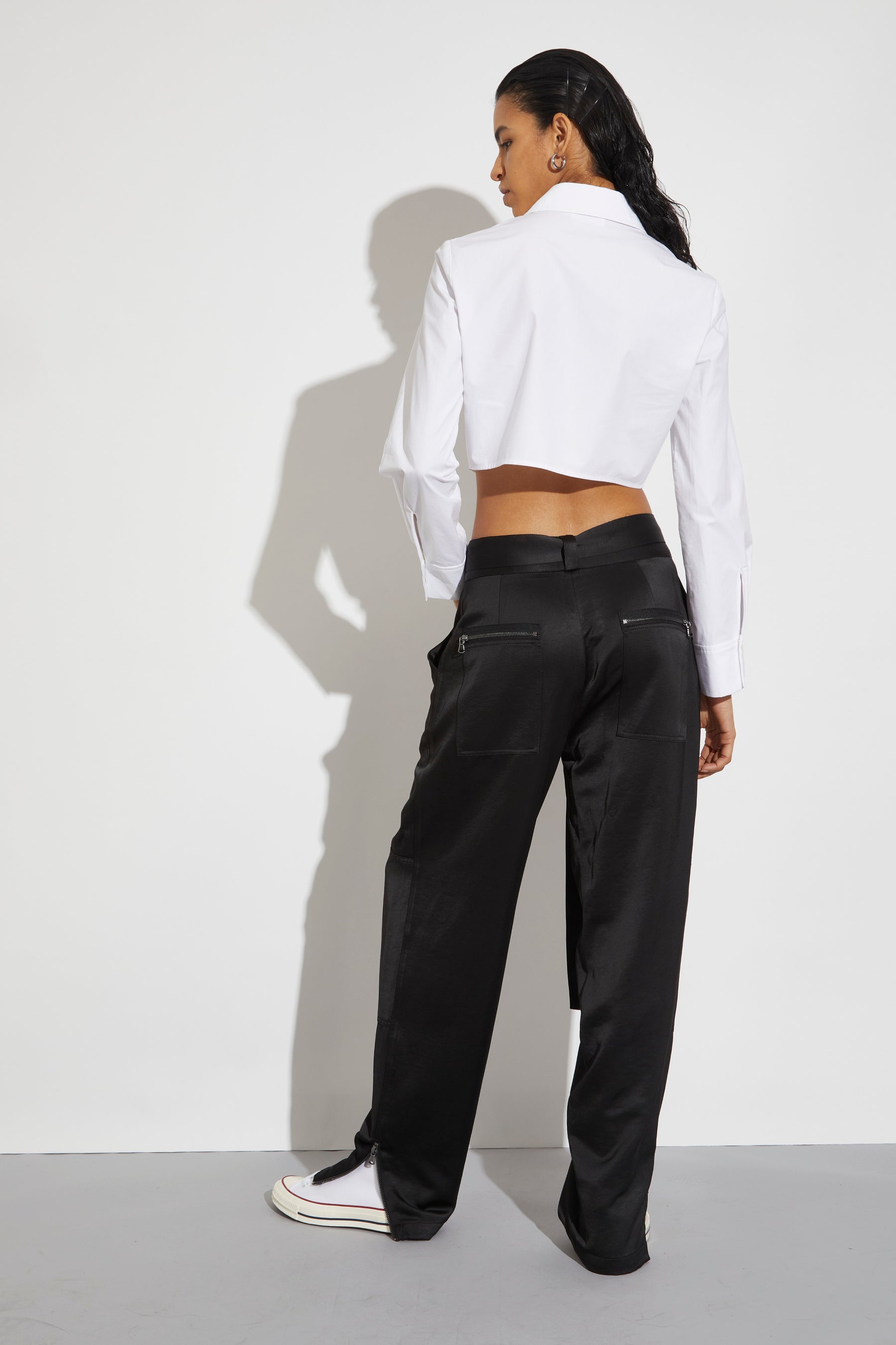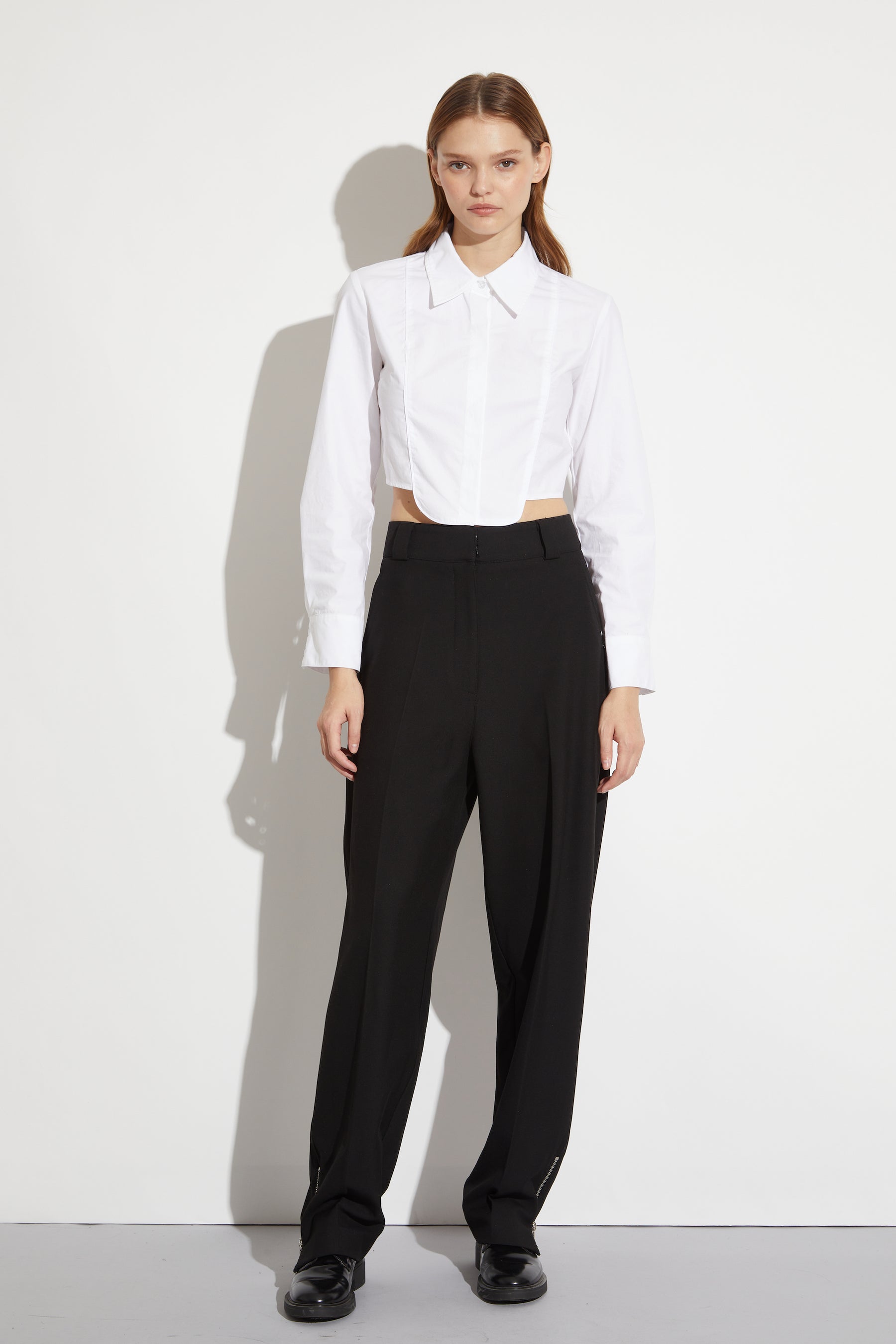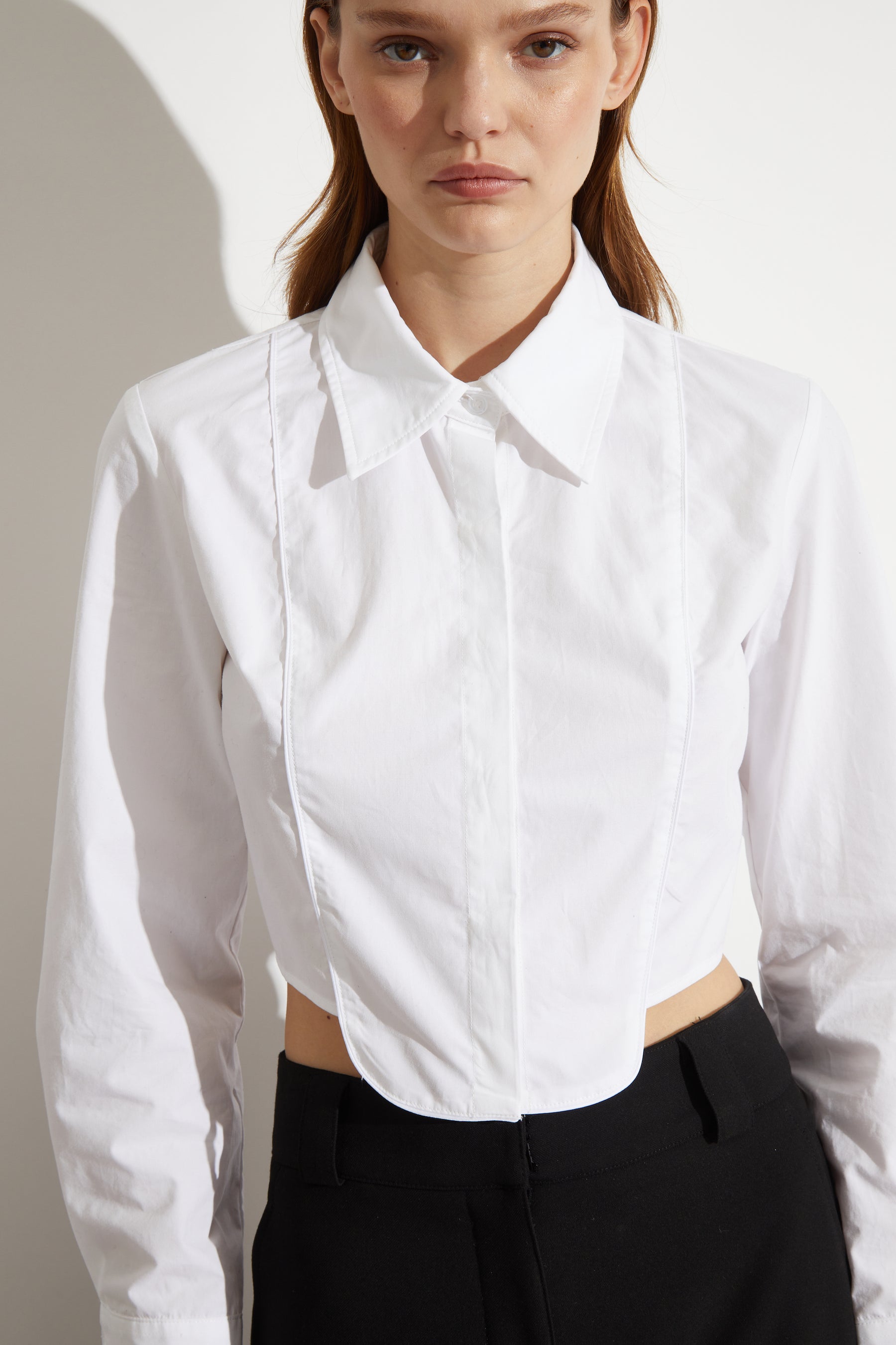 Cropped poplin button-down shirt with tuxedo bib detailing. White satin piping on chest with curved dipped hem. Menswear inspired design with a feminine fit.