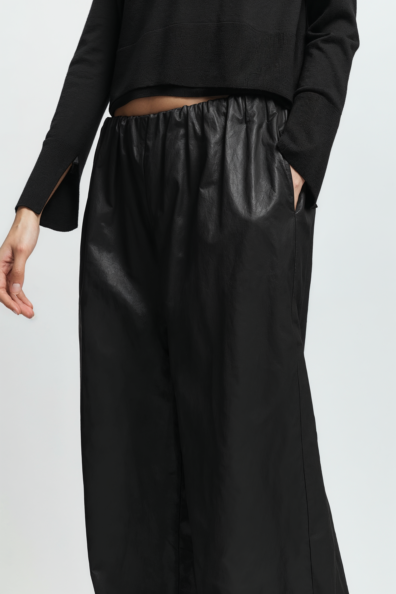 Introducing the Jakob Pull On Pant in Black - a statement pant that effortlessly exudes luxury. The coated twill fabric and soft brushed interior add an elevated texture, while the pull on design offers easy, sophisticated styling. Elevate your wardrobe with this exclusive piece.