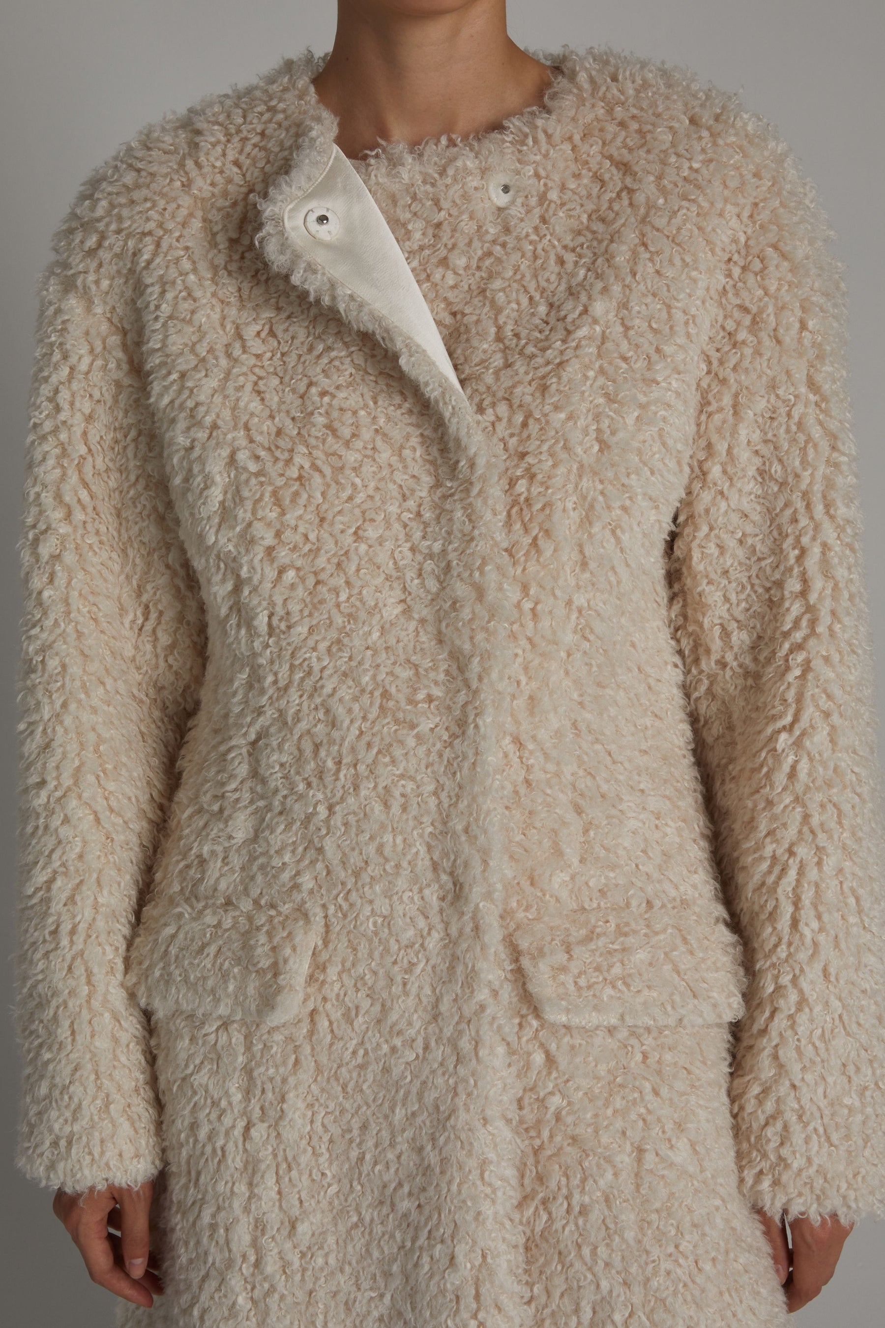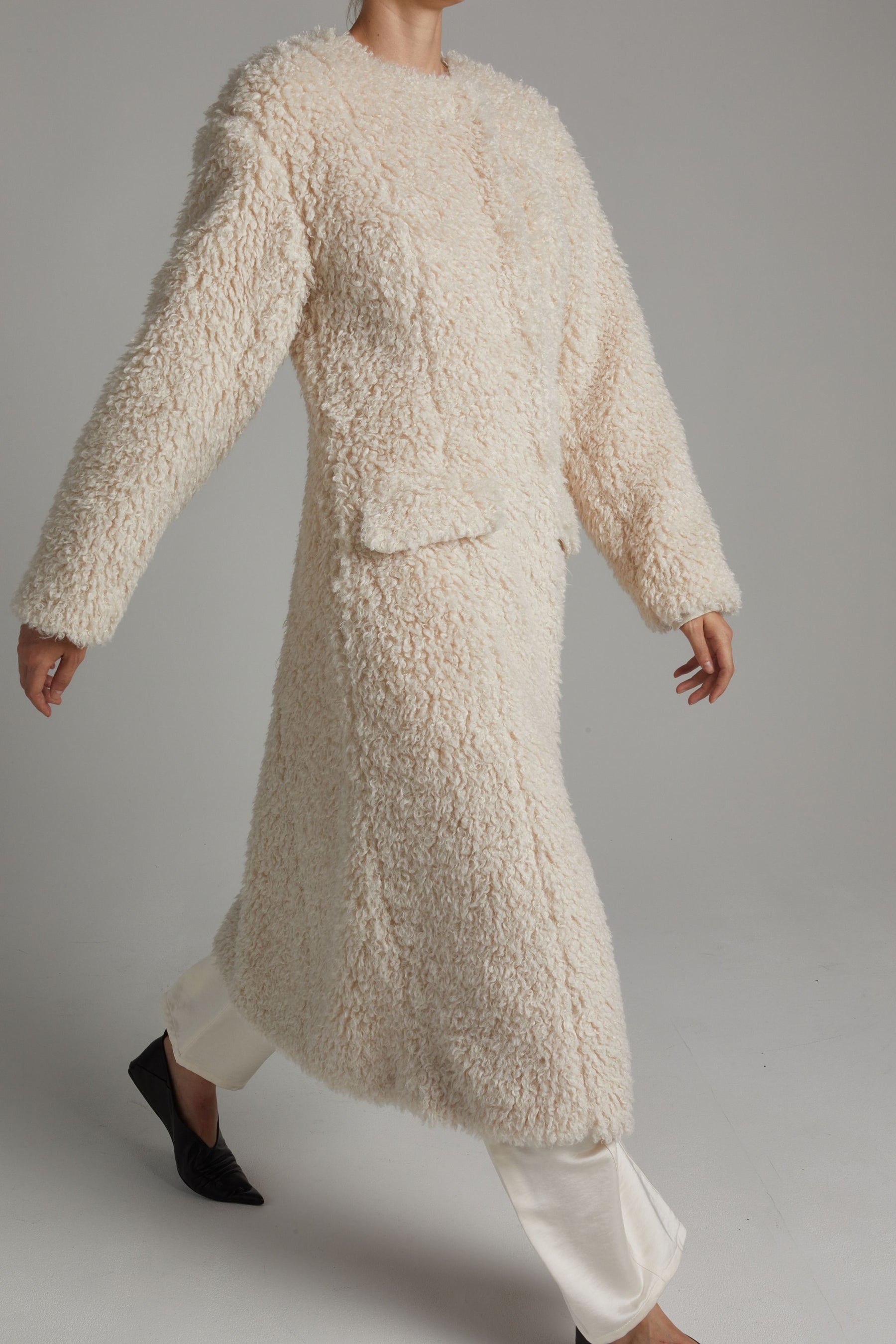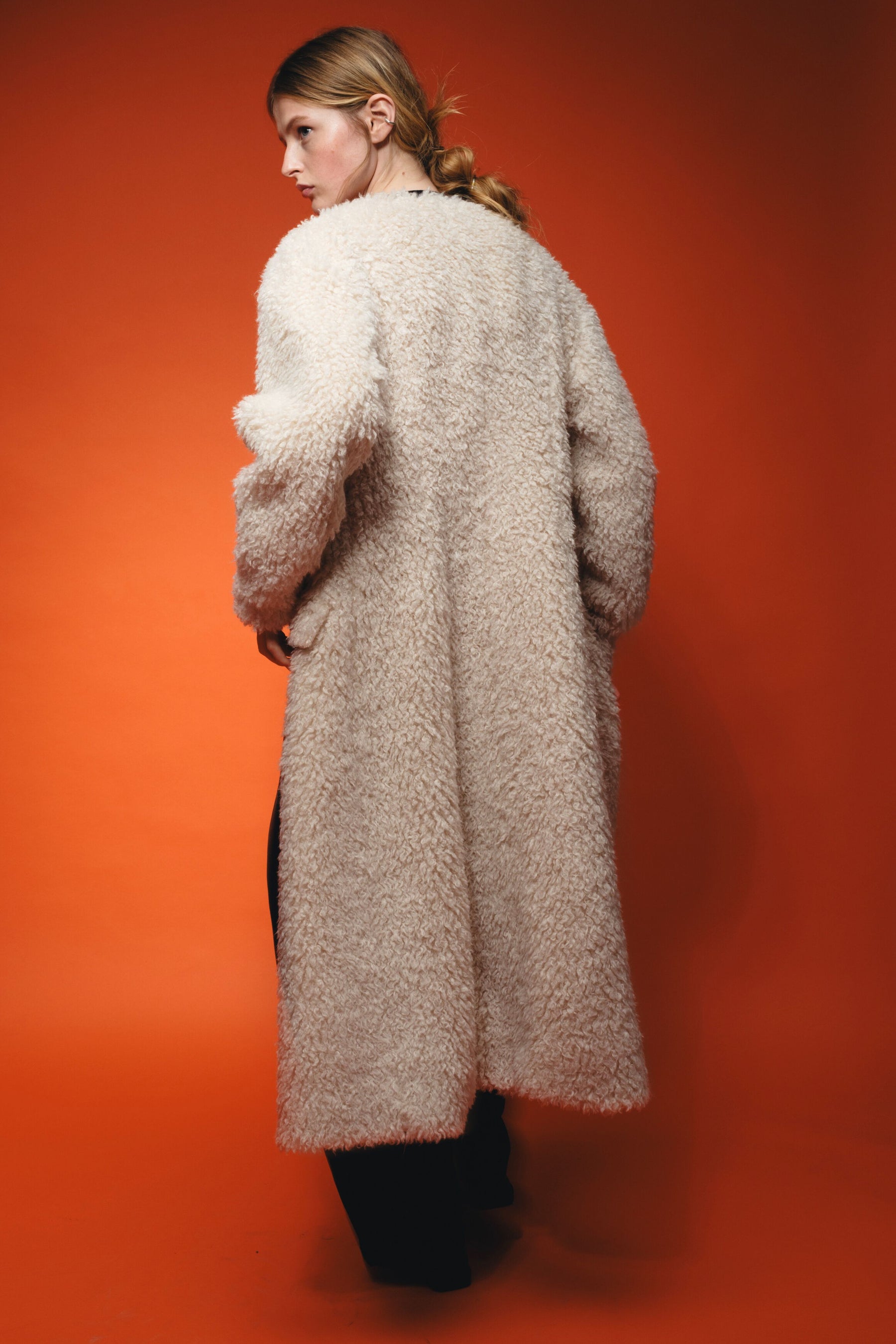 Expertly crafted and designed for both style and comfort, the Jamie Shearling Coat is a must-have for any fashion-forward individual. Made with luxurious faux shearling, this coat features a rich off-white color that exudes sophistication. The fitted seams and hourglass shape create a flattering silhouette, while the interior poly lining and vent at the back ensure maximum comfort. With pockets at the sides and an interior button closure, this coat is both practical and stylish.
