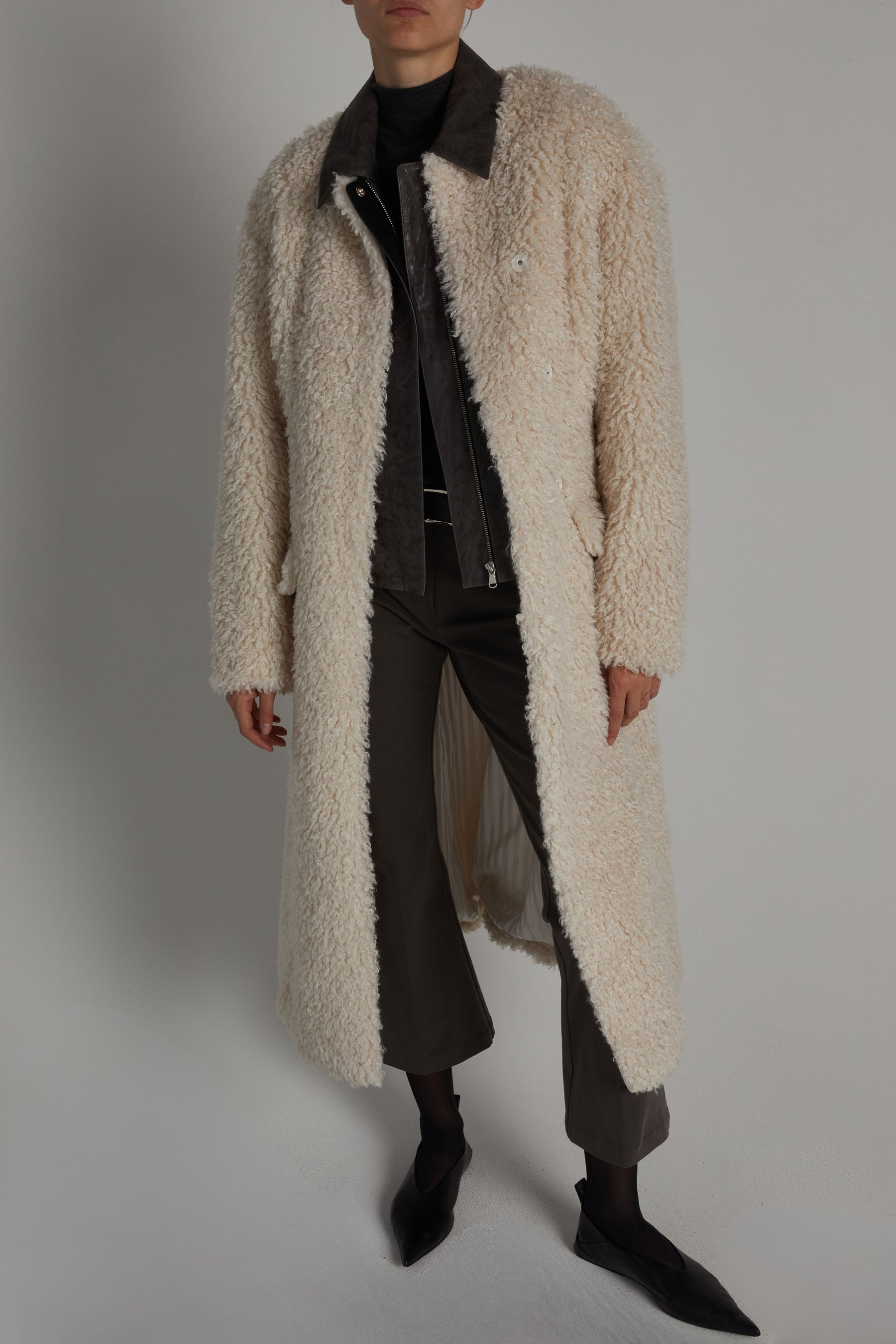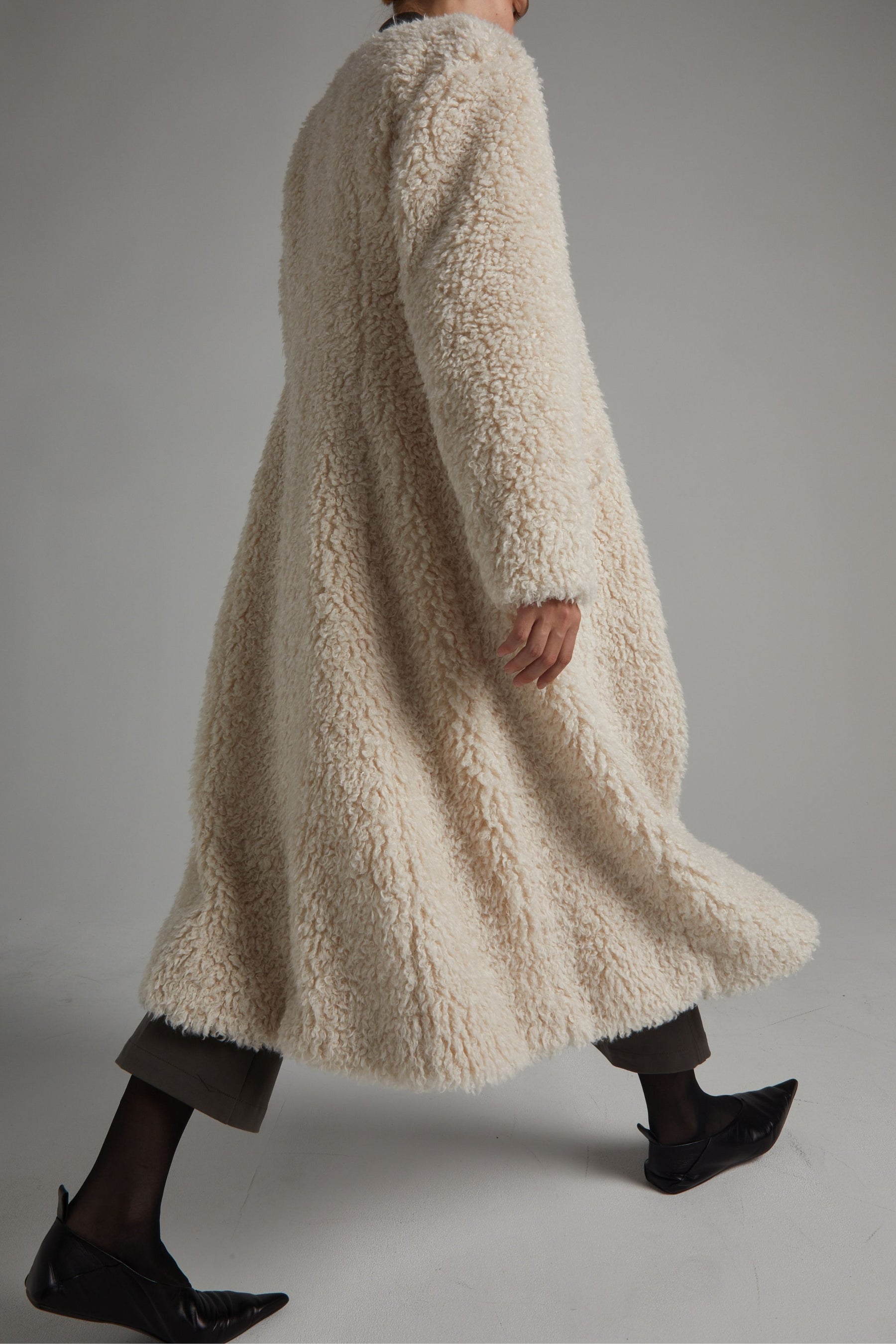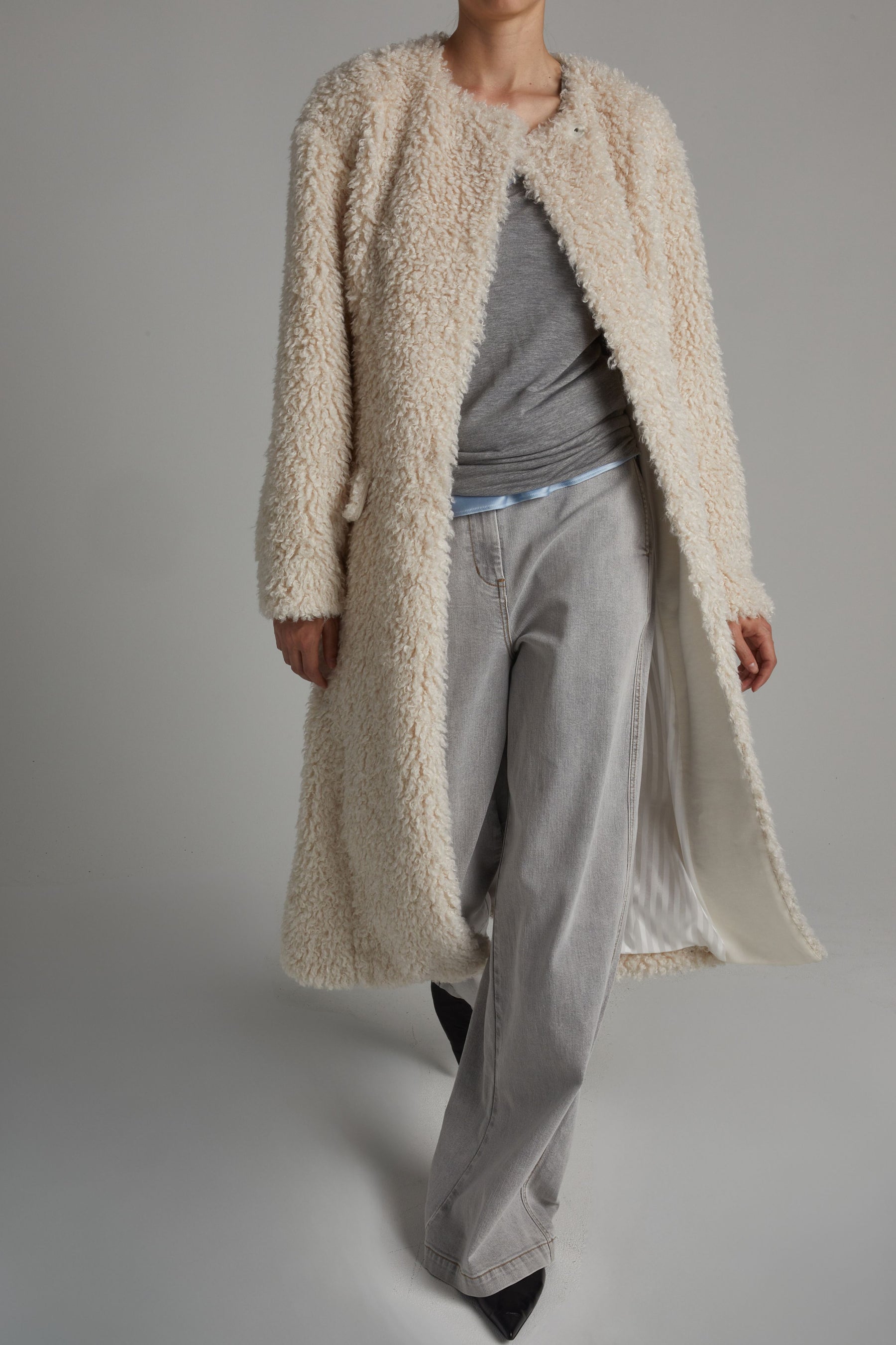 Expertly crafted and designed for both style and comfort, the Jamie Shearling Coat is a must-have for any fashion-forward individual. Made with luxurious faux shearling, this coat features a rich off-white color that exudes sophistication. The fitted seams and hourglass shape create a flattering silhouette, while the interior poly lining and vent at the back ensure maximum comfort. With pockets at the sides and an interior button closure, this coat is both practical and stylish.