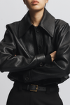 The Lomand Crinkle Leather Jacket in black showcases expertly crafted crinkle leather with a finely detailed collar, combining texture and sophistication. Designed for versatility, it pairs seamlessly with the Kiana Denim Pant, creating a polished yet edgy look ideal for modern wardrobes.