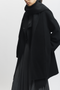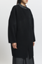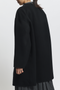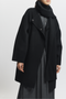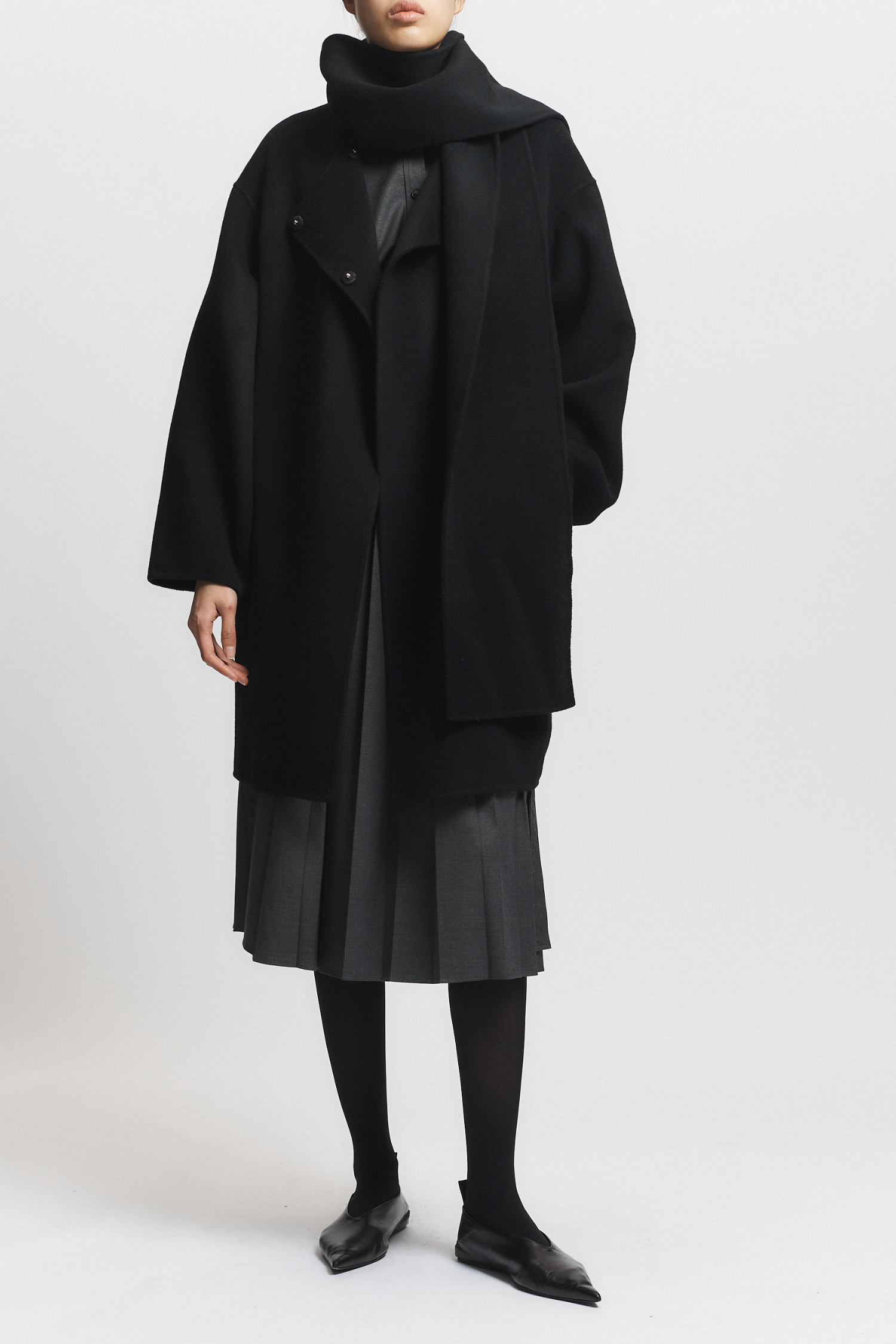 This mid-length black wool coat with an integrated scarf offers refined warmth and timeless style. Crafted from high-quality wool, it provides excellent insulation while maintaining a sleek silhouette. The attached scarf adds versatility and extra protection against cold weather, making it an essential piece for sophisticated layering in cooler seasons.