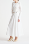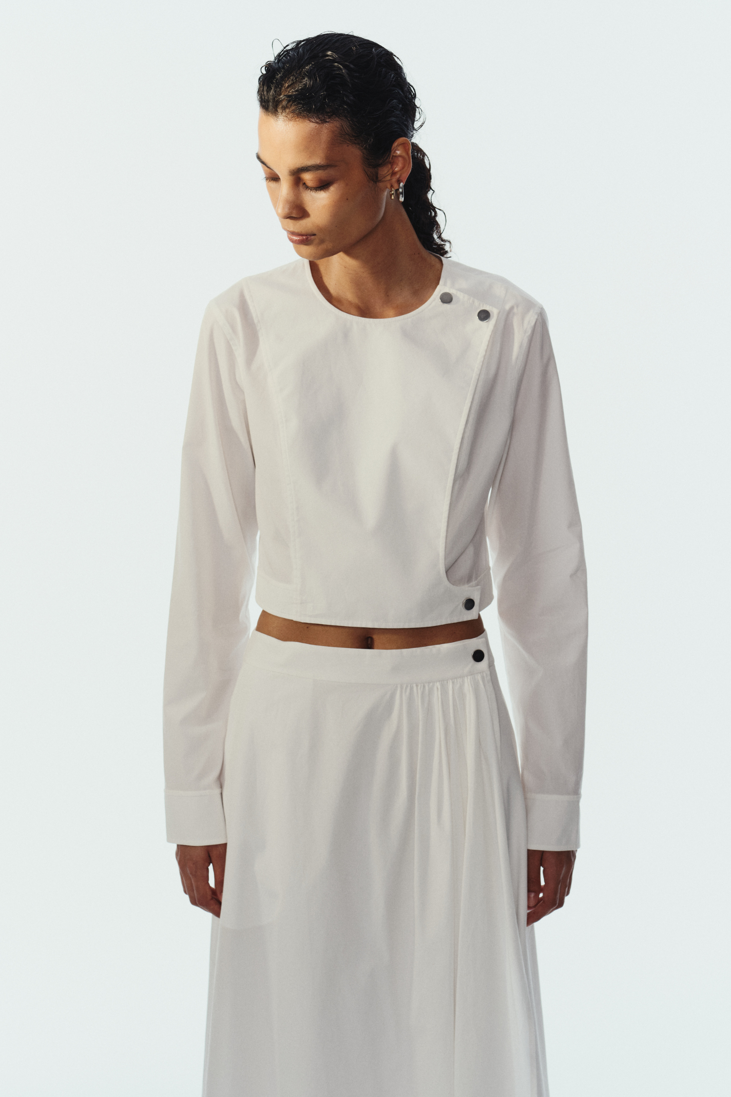 Versatile soft poplin blouse designed to transition seamlessly between standalone top and layering piece. Distinctive fold-over neckline with snap silver hardware at front and hem adds refined detail and functional styling flexibility. The structured yet breathable poplin fabric drapes elegantly, making it an ideal foundation for building layered looks or pairing with the coordinating flora poplin skirt for a cohesive ensemble. A wardrobe essential that rewards creative mixing.