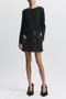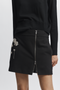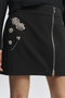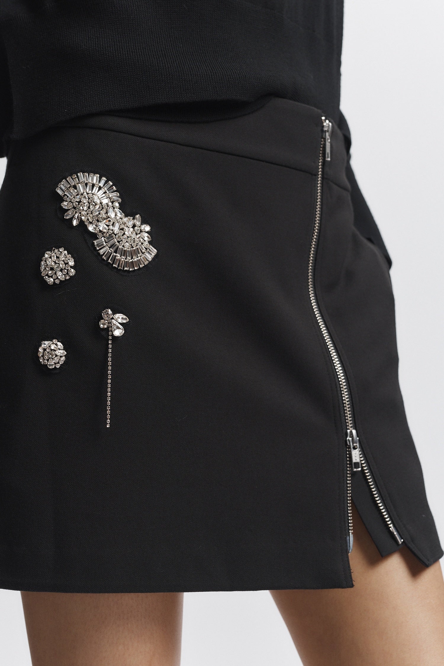The Reign Embellished Mini Skirt in black features luxurious tuxedo suiting fabric accented with refined embellishment details, creating a sophisticated yet contemporary look. Expertly tailored for a sleek fit, it pairs seamlessly with the Elodie layered crewneck to balance structured elegance with casual refinement. Ideal for elevating your wardrobe with versatile, polished style.