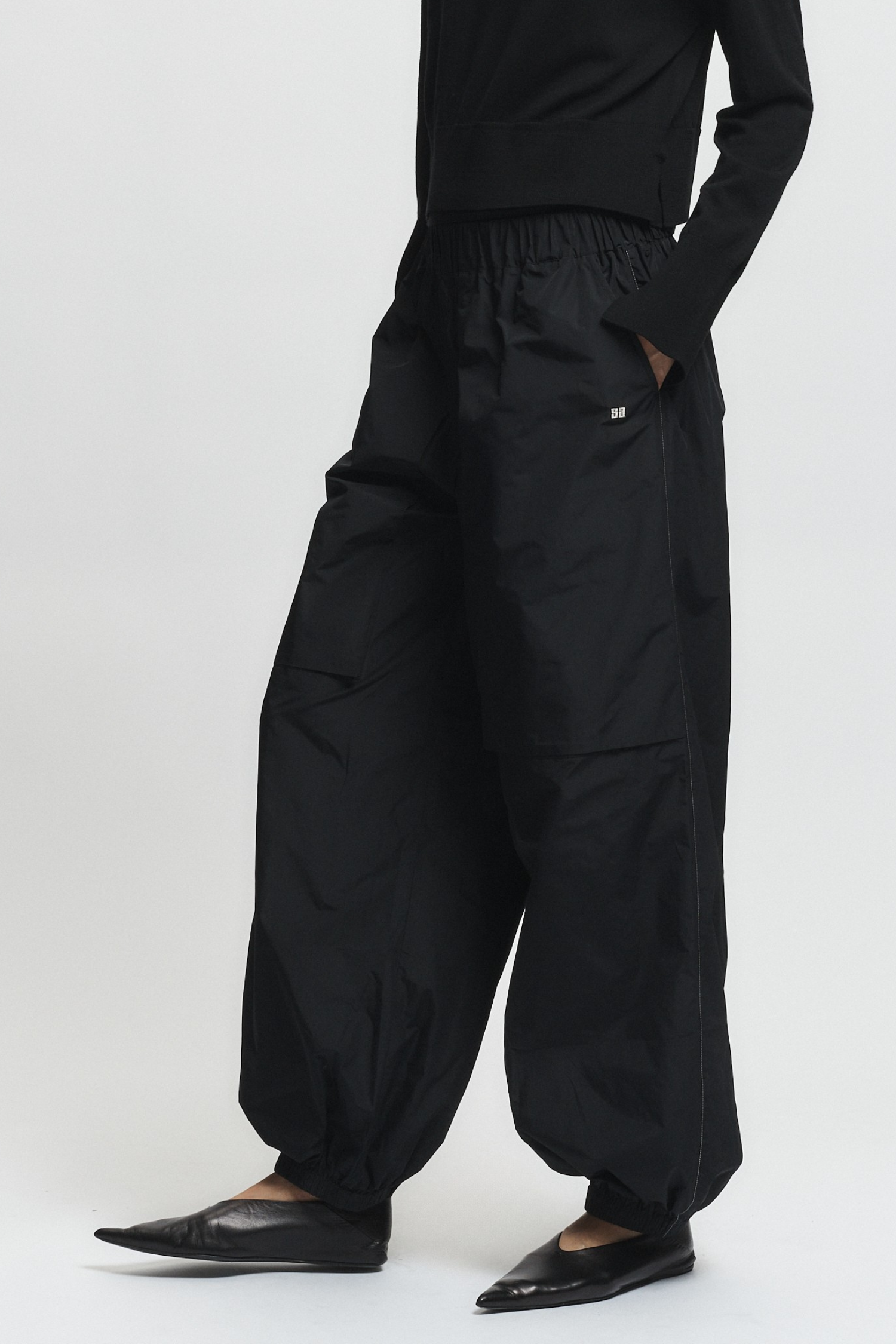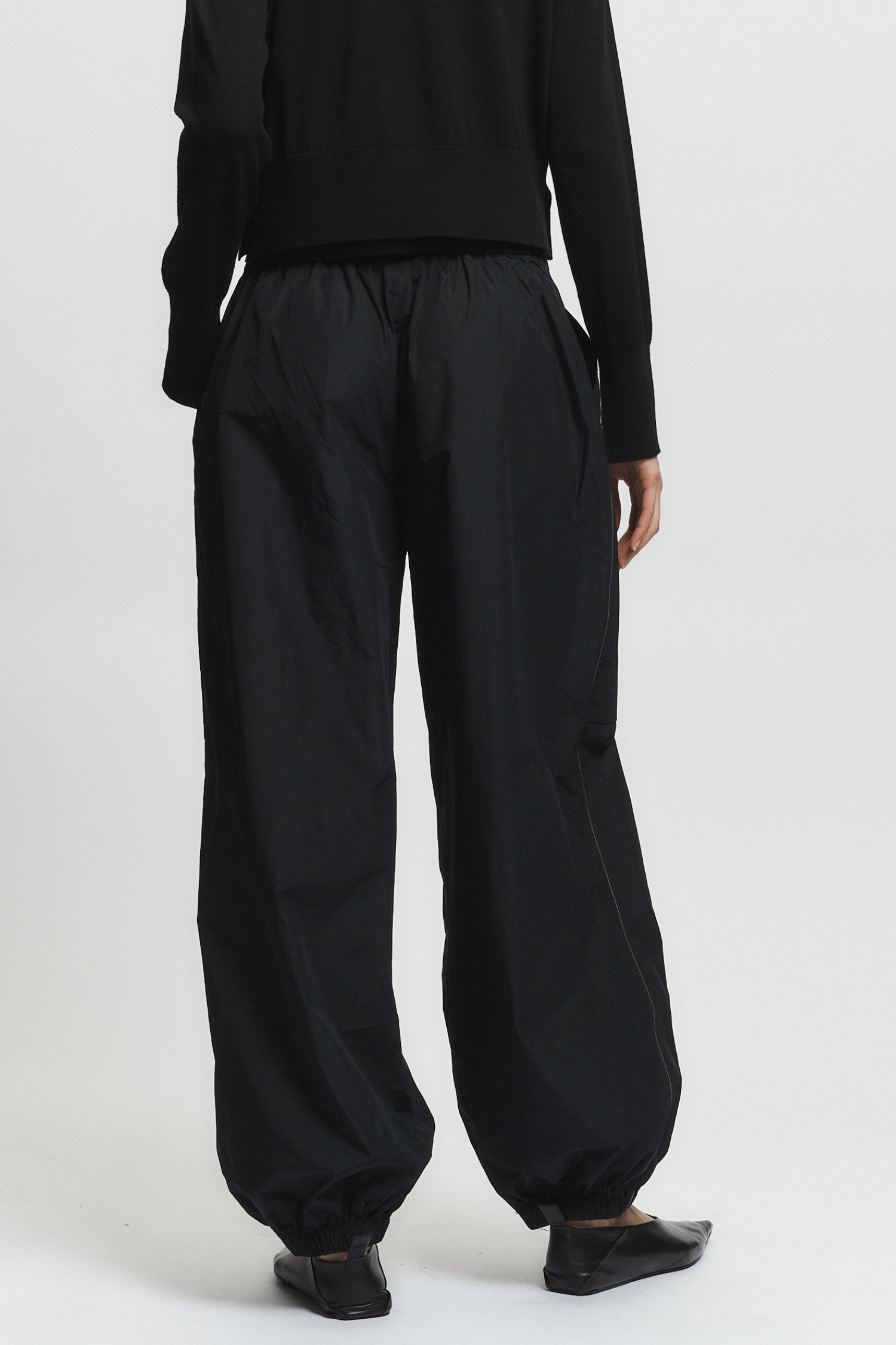 The Clyde Oversized Taffeta Pant in black offers a refined silhouette with a tailored fit at the ankle, combining comfort with a modern edge. Crafted from luxurious taffeta, these pants provide subtle sheen and structure, ideal for elevating your wardrobe. Pair them with the Elijah oversized vest for a sophisticated, layered look that balances volume and precision. Perfect for those seeking a polished yet contemporary style.