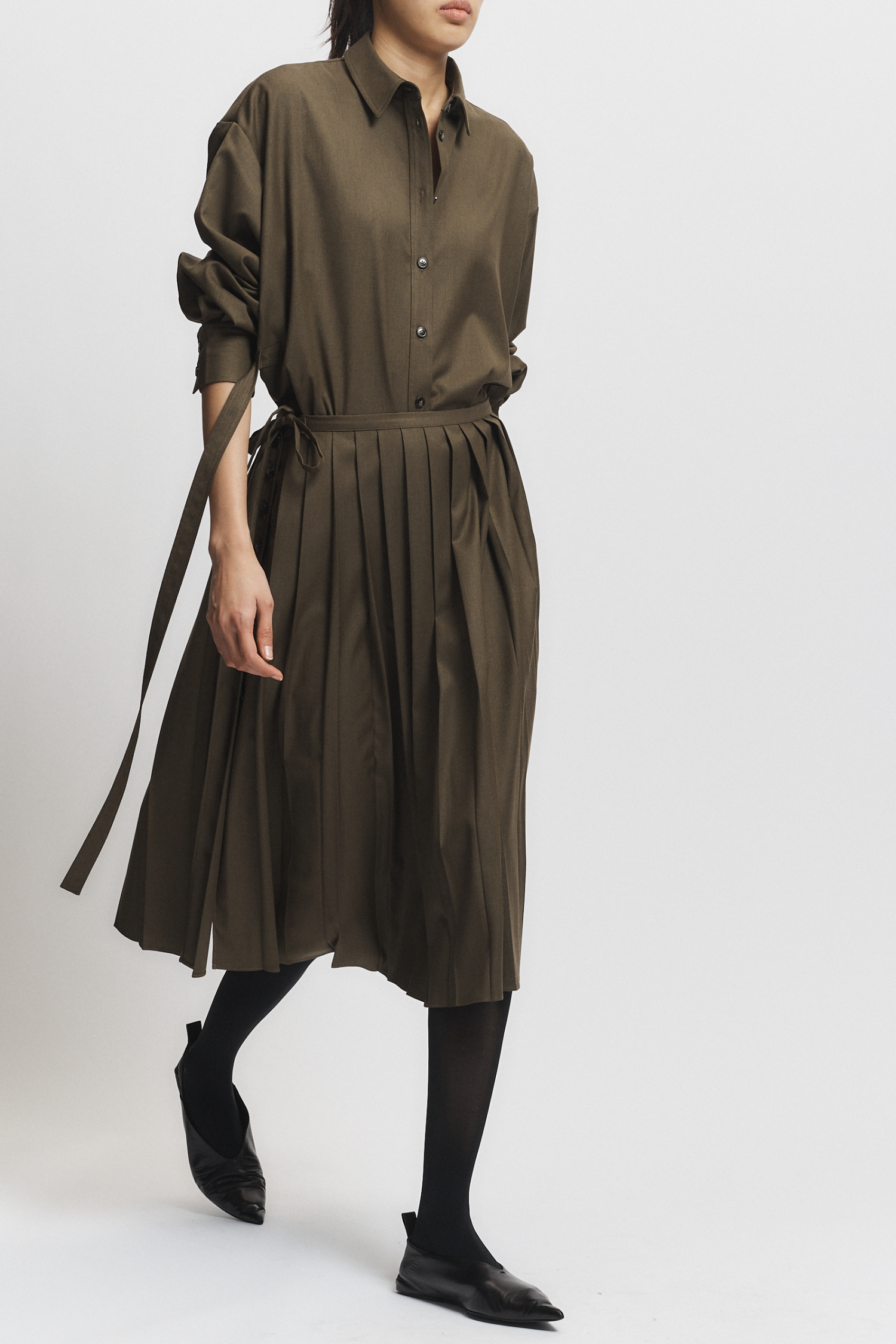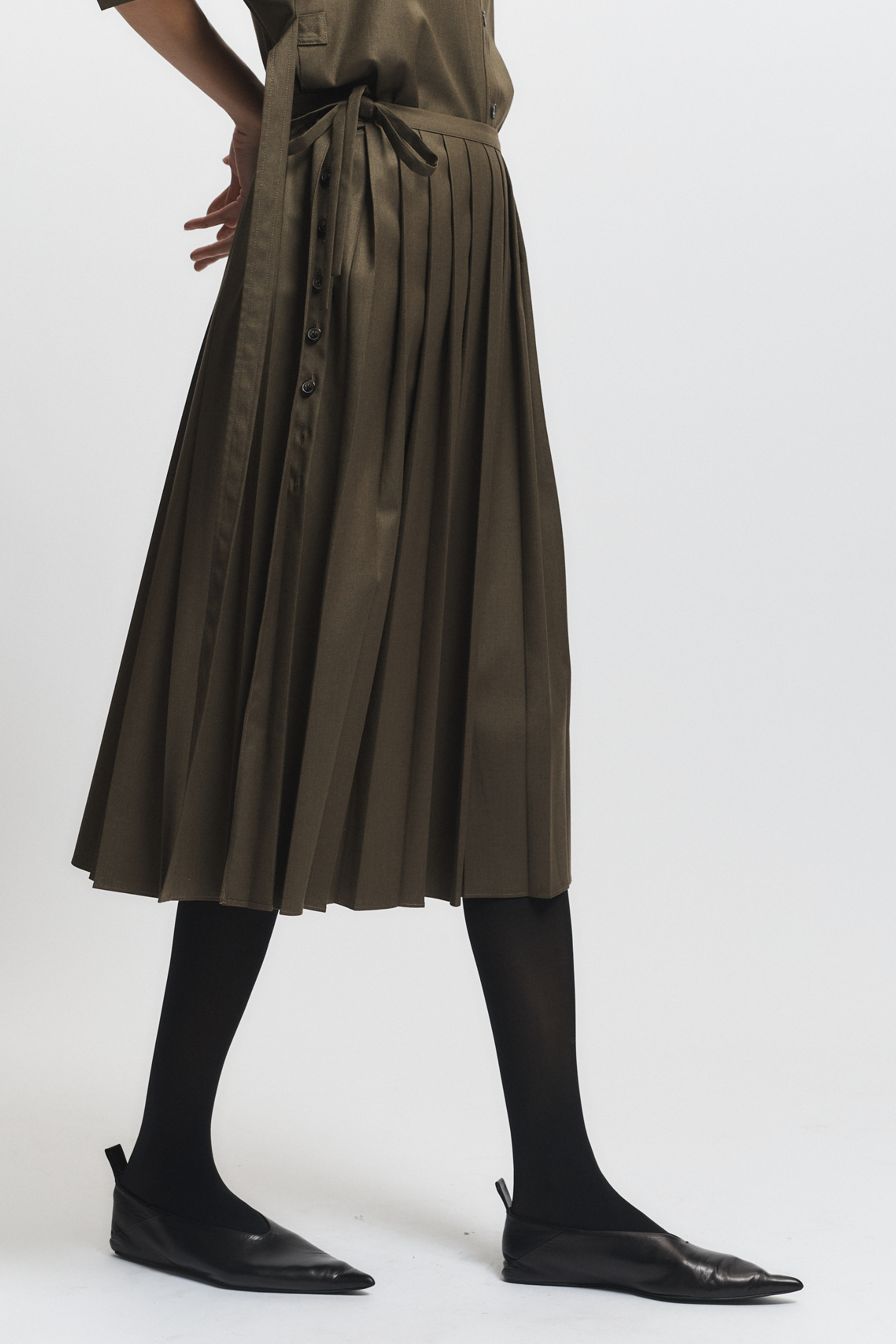 This Fabian Pleated Skirt in olive offers a refined silhouette with its carefully crafted pleats and midi length. The olive hue provides a versatile, sophisticated touch suitable for both professional and casual settings. Designed to drape elegantly, it enhances movement while maintaining structure, making it a timeless addition to any wardrobe.