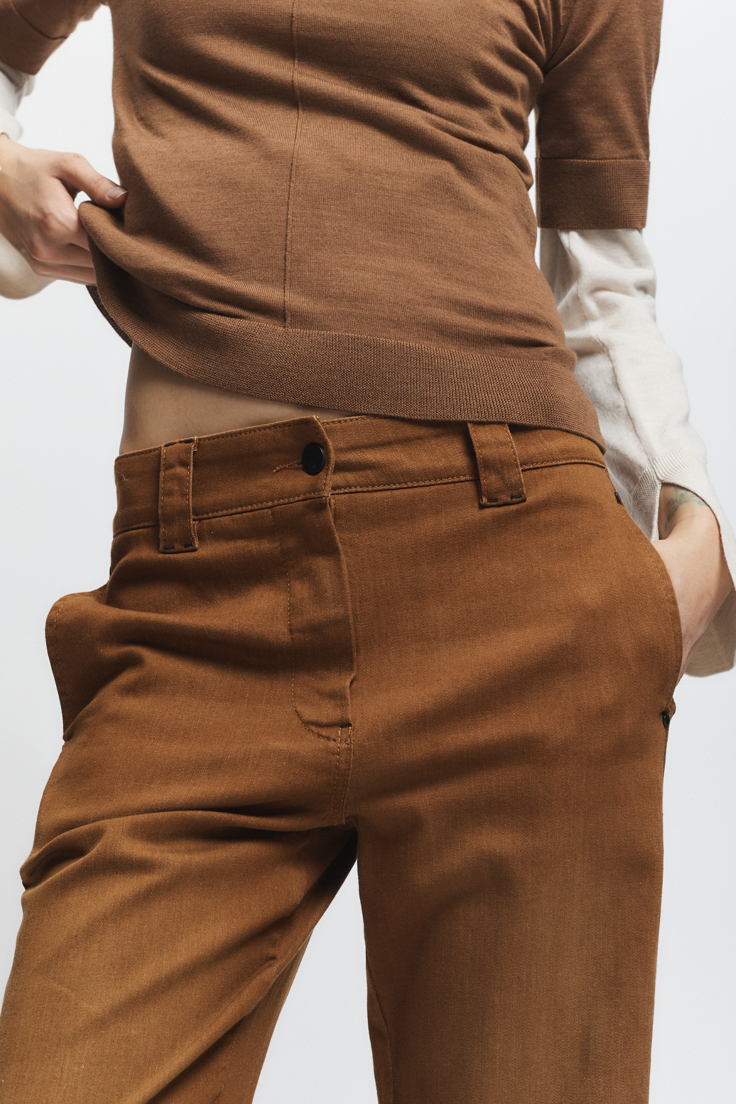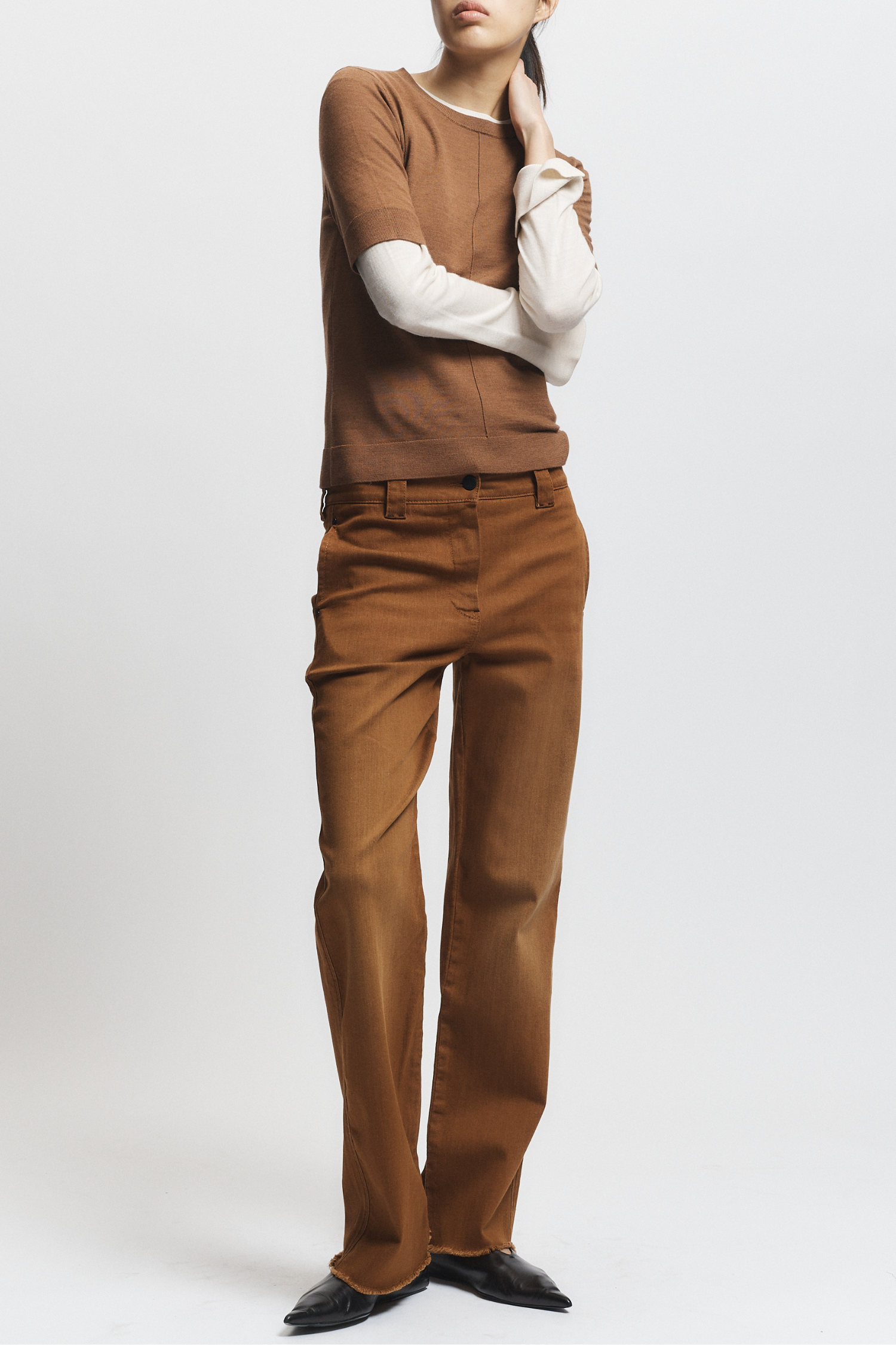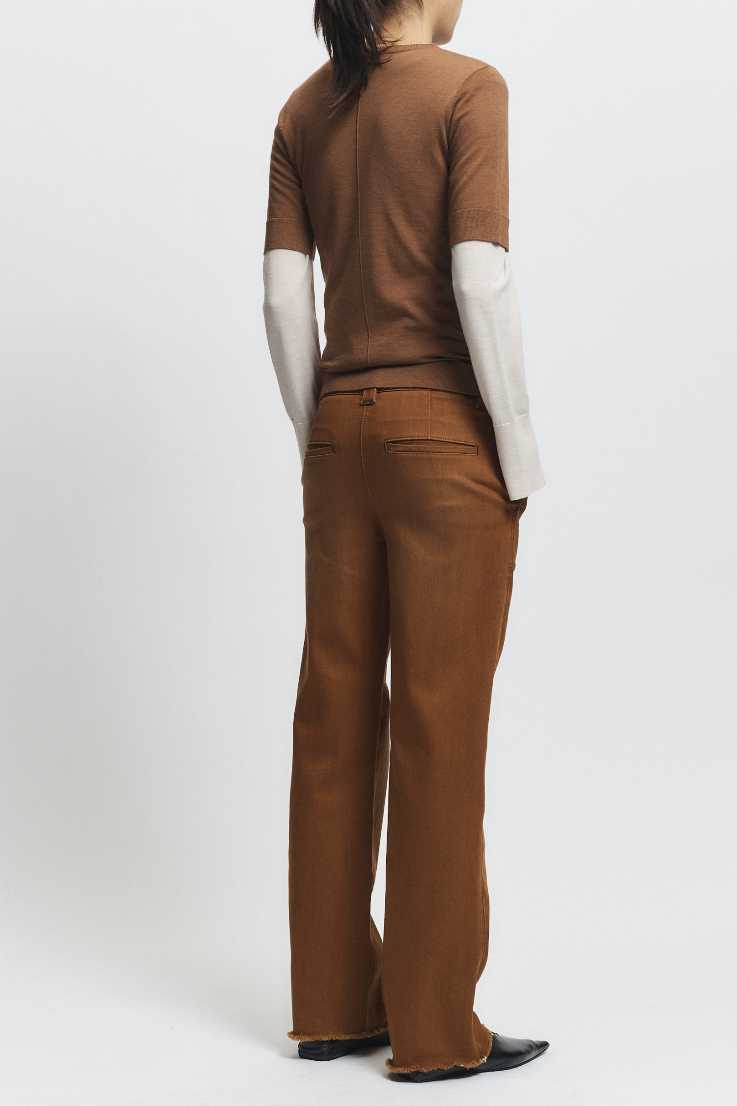 The Nessa Denim Pant in Tobacco Wash features a slim silhouette crafted from soft cotton for comfort and durability. Its rich tobacco color adds warmth and versatility, making it an ideal match for the Lucia short sleeve sweater. This combination delivers a polished, expert look suitable for both casual and refined settings.