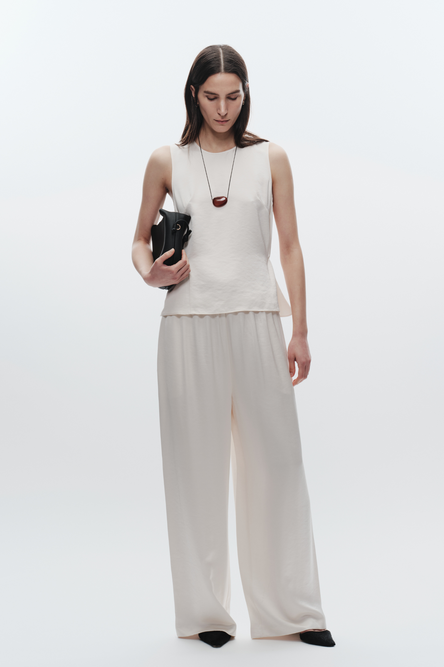 Introducing the Paige Pull-On Pant in Ivory. Made from our signature wrinkle-resistant charmeuse fabric, these pants are both comfortable and elevated with ruched detailing at the waist. Perfect for day to evening wear and travel, these machine washable pants are a bestseller. Upgrade your wardrobe with ease and style.