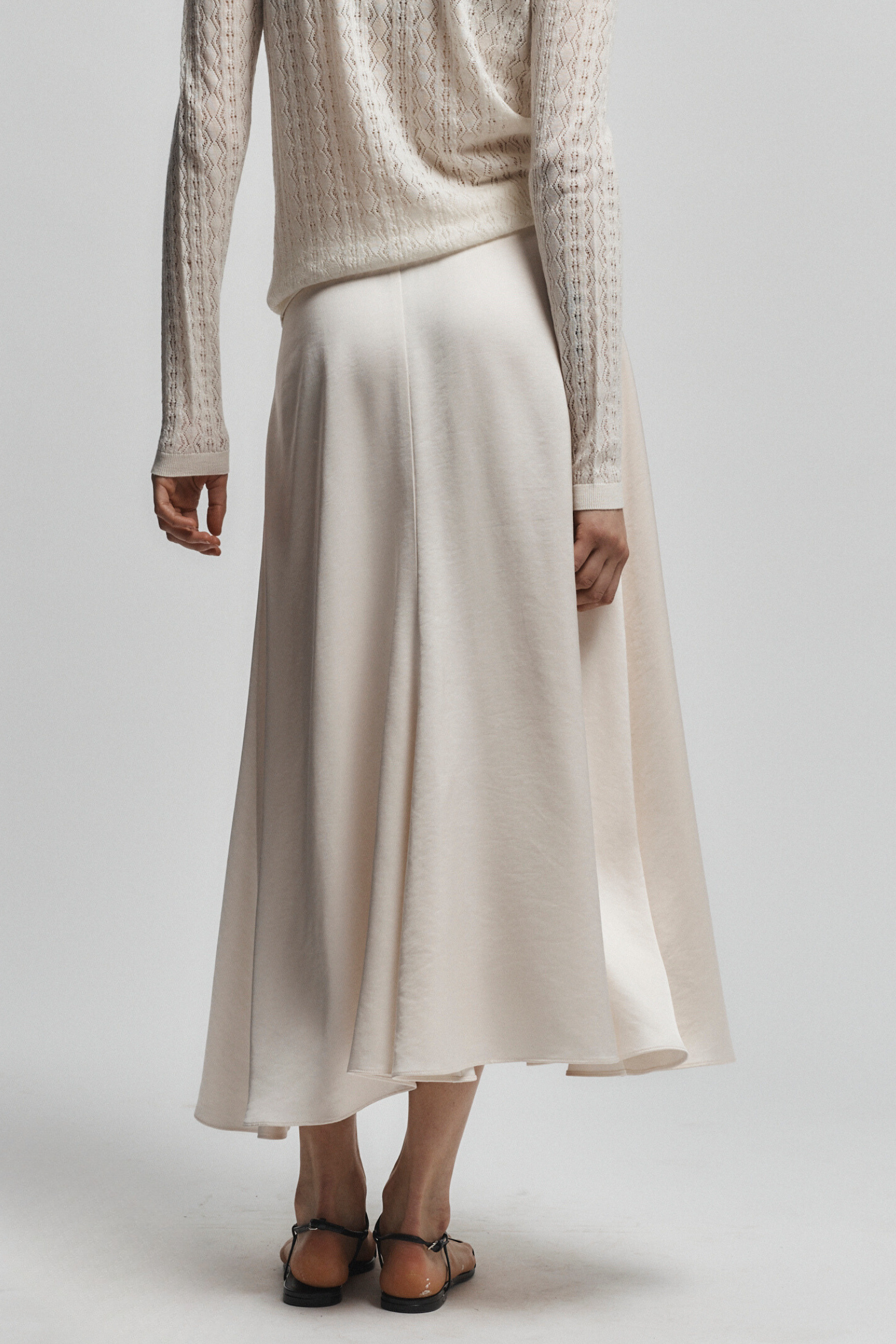 The Frieda A-Line Skirt in Ivory is a versatile and elegant option for any occasion. Made with heavy charmeuse fabric, this midi skirt is durable and easy to care for with its machine washability. Pair it with the Danielle bustier top for a chic and put-together look.
