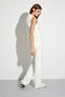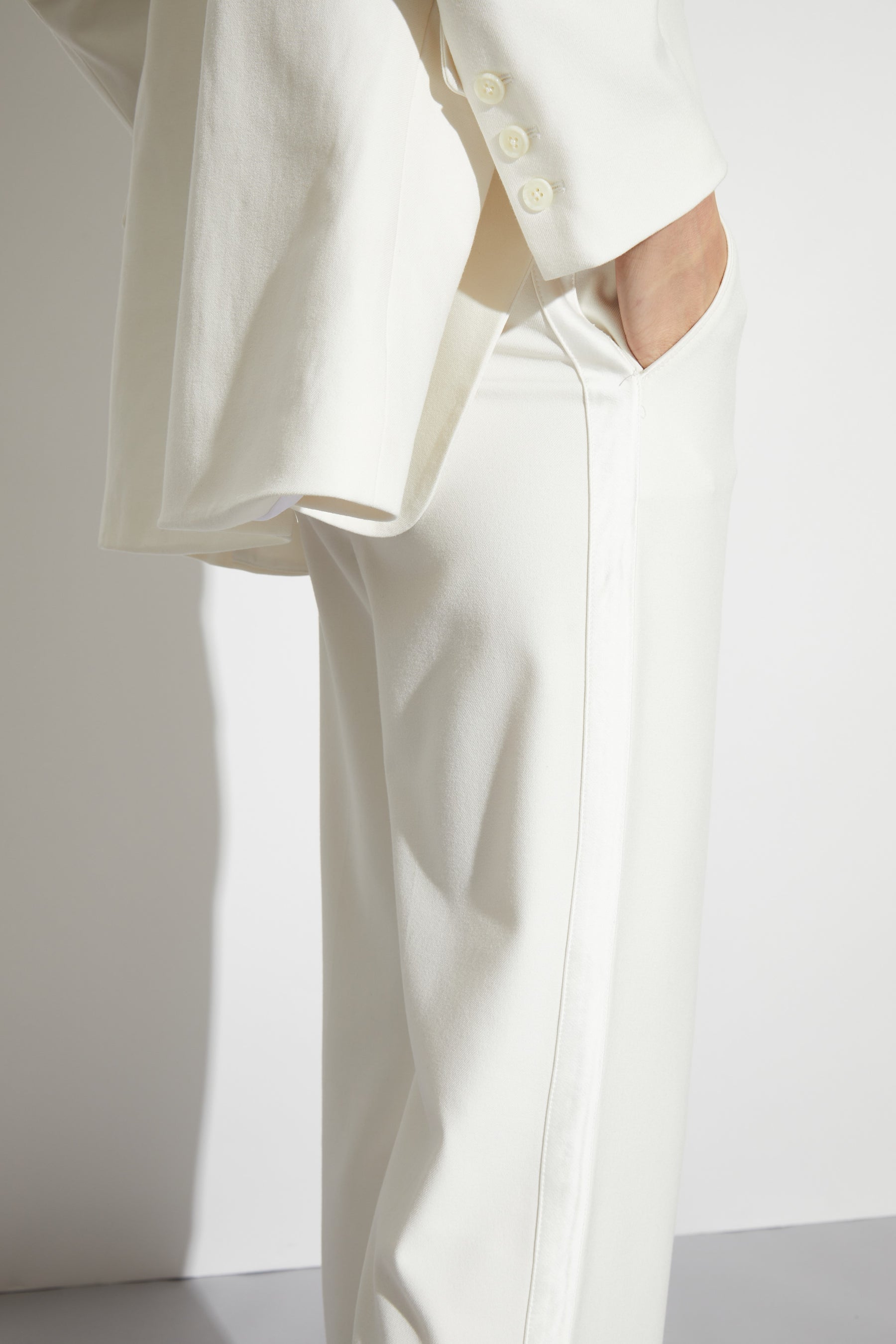 Your most comfortable mid-rise straight leg trouser pants, in bright white for a clean statement look. White charmeuse stripe detail down the leg for a classic detail. Saint Art signature wide belt loops, internal closure, and small back welt pockets.