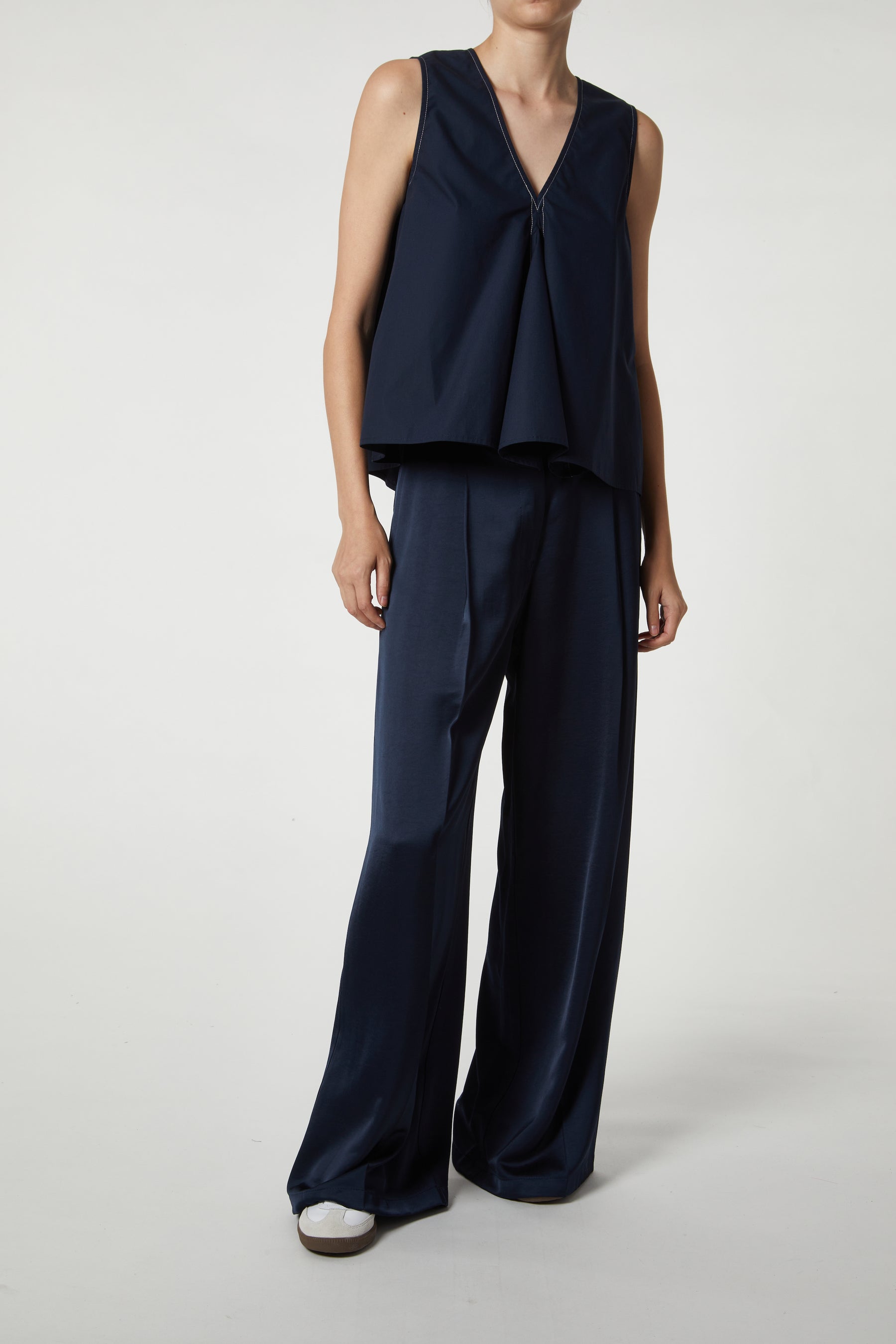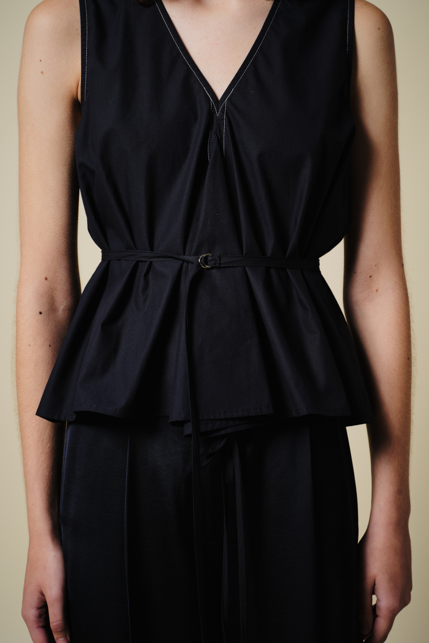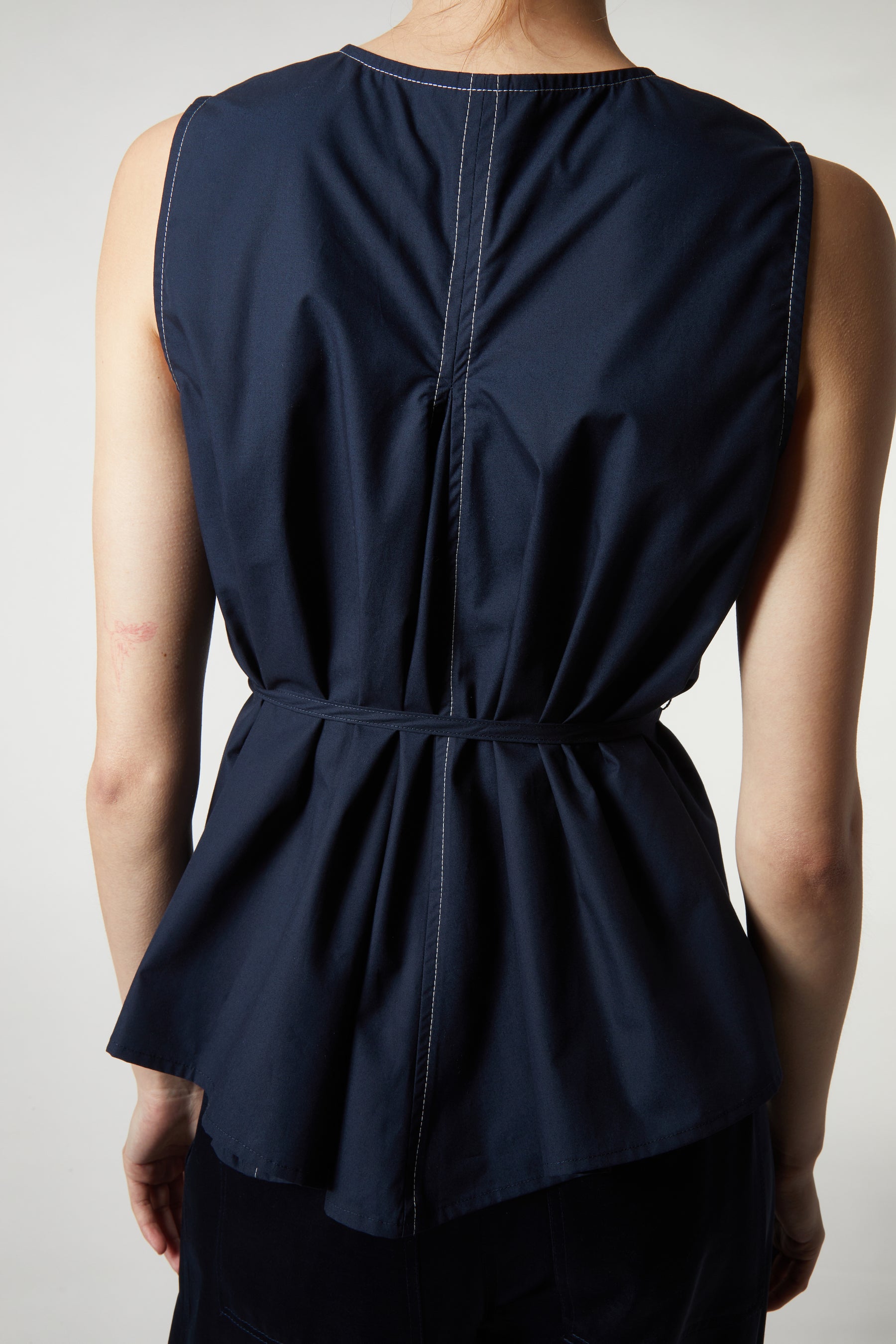 This top is versatile addition to your seasonless wardrobe. Crafted from breathable poplin fabric with a detachable small d-ring tie belt, this top is comfortable and light feel, making it an ideal and easy choice. The navy hue, complemented by contrast white stitching, adds a contemporary flair to the classic design. The swing shape brings a playful element to the top, allowing for ease of movement and an elevated silhouette. With a V-neckline offering a touch of sophistication, this top is perfect for both casual outings and more polished occasions. Embrace the understated elegance of this poplin swing top, effortlessly combining comfort and style for a fresh and modern spring look.