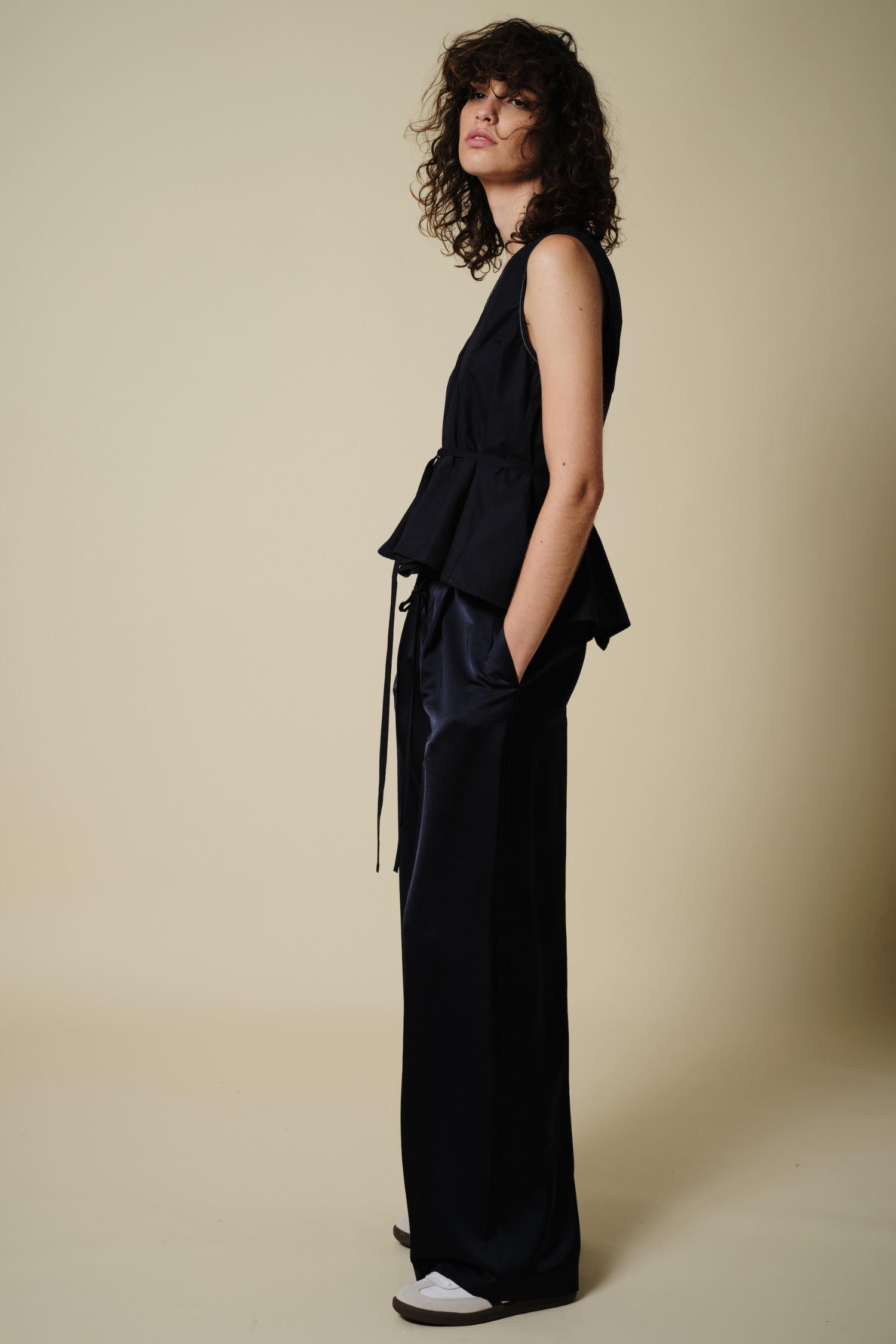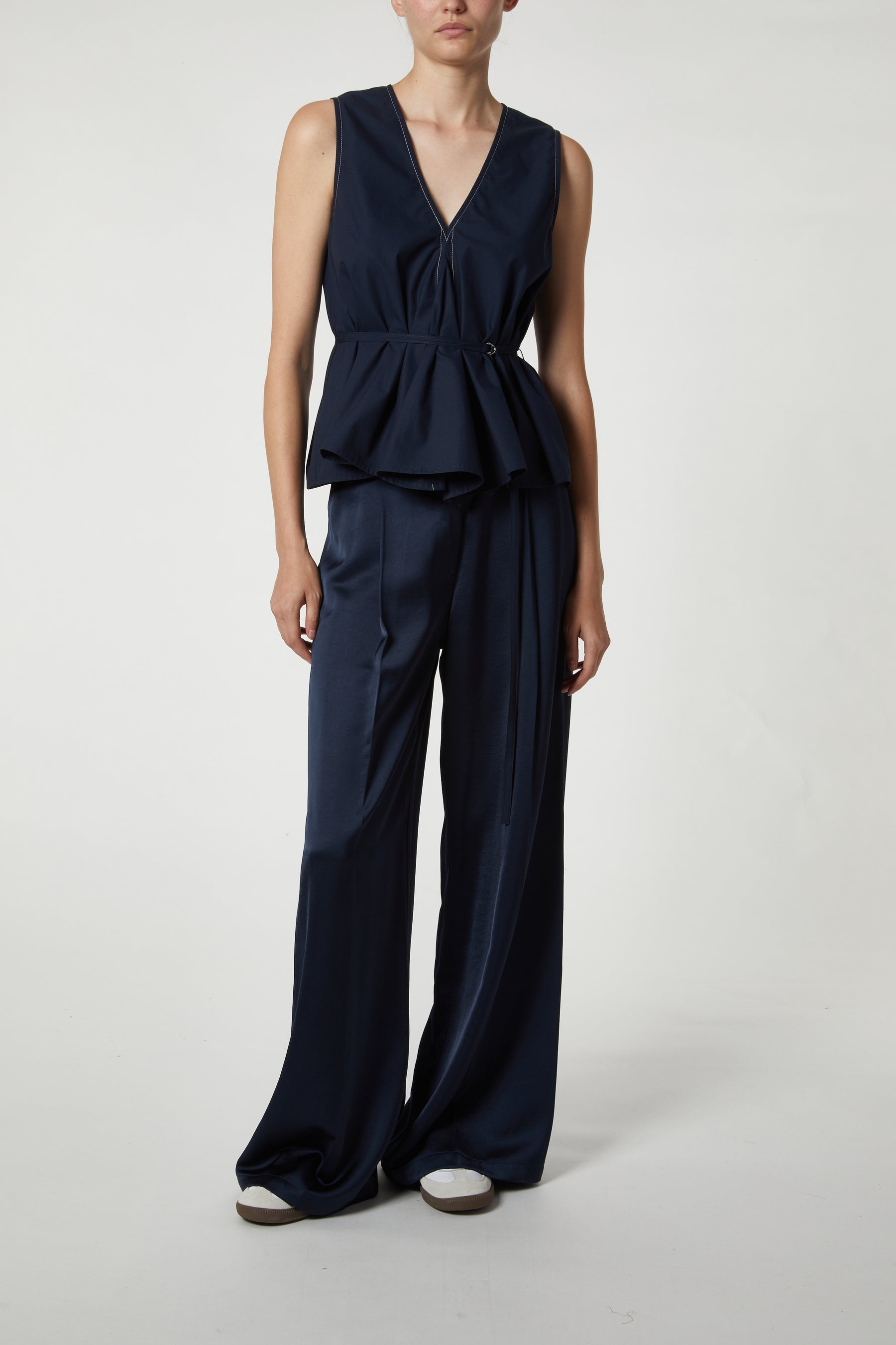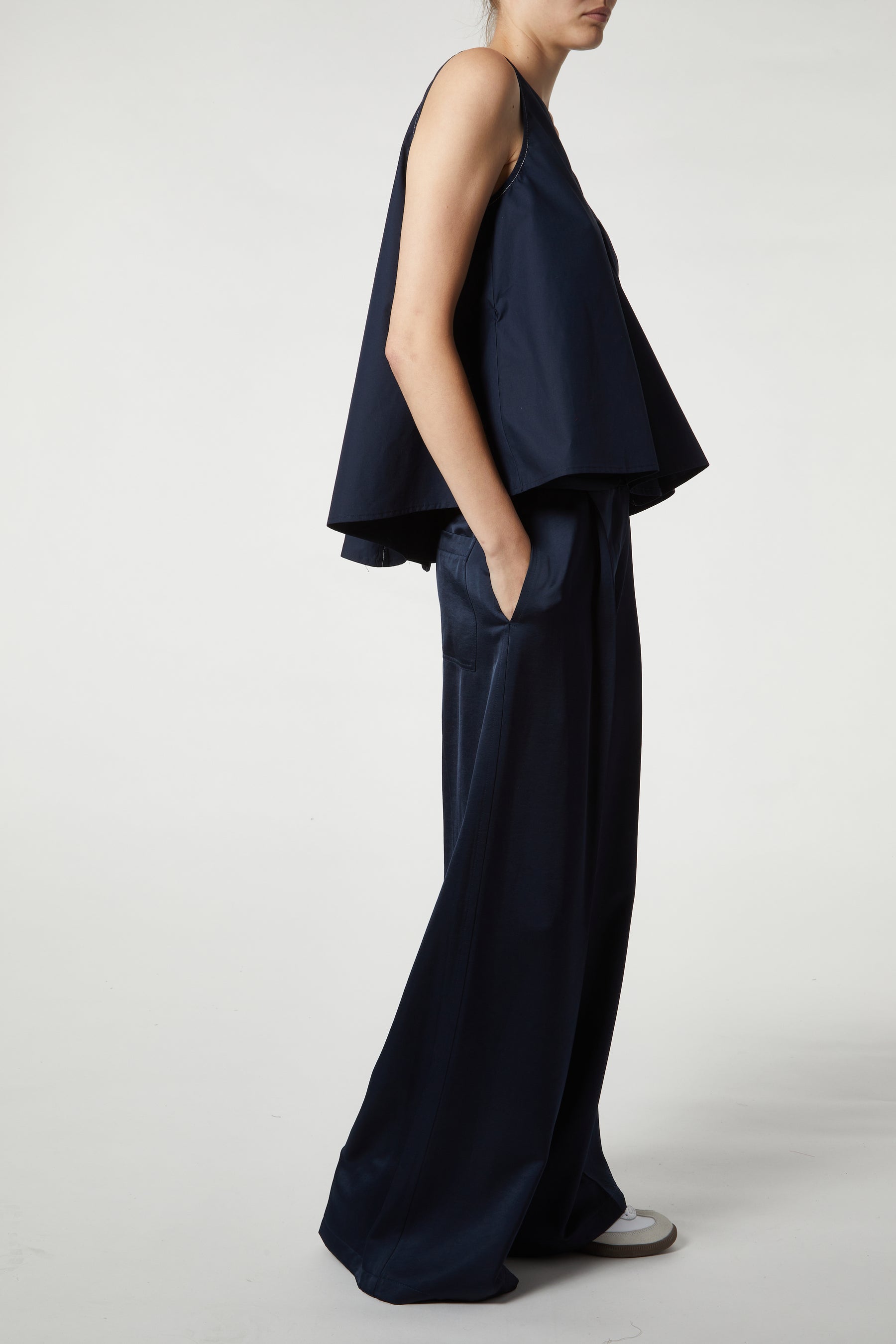 This top is versatile addition to your seasonless wardrobe. Crafted from breathable poplin fabric with a detachable small d-ring tie belt, this top is comfortable and light feel, making it an ideal and easy choice. The navy hue, complemented by contrast white stitching, adds a contemporary flair to the classic design. The swing shape brings a playful element to the top, allowing for ease of movement and an elevated silhouette. With a V-neckline offering a touch of sophistication, this top is perfect for both casual outings and more polished occasions. Embrace the understated elegance of this poplin swing top, effortlessly combining comfort and style for a fresh and modern spring look.