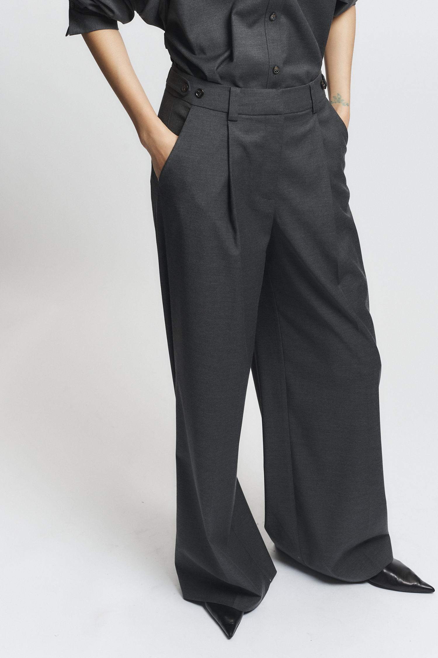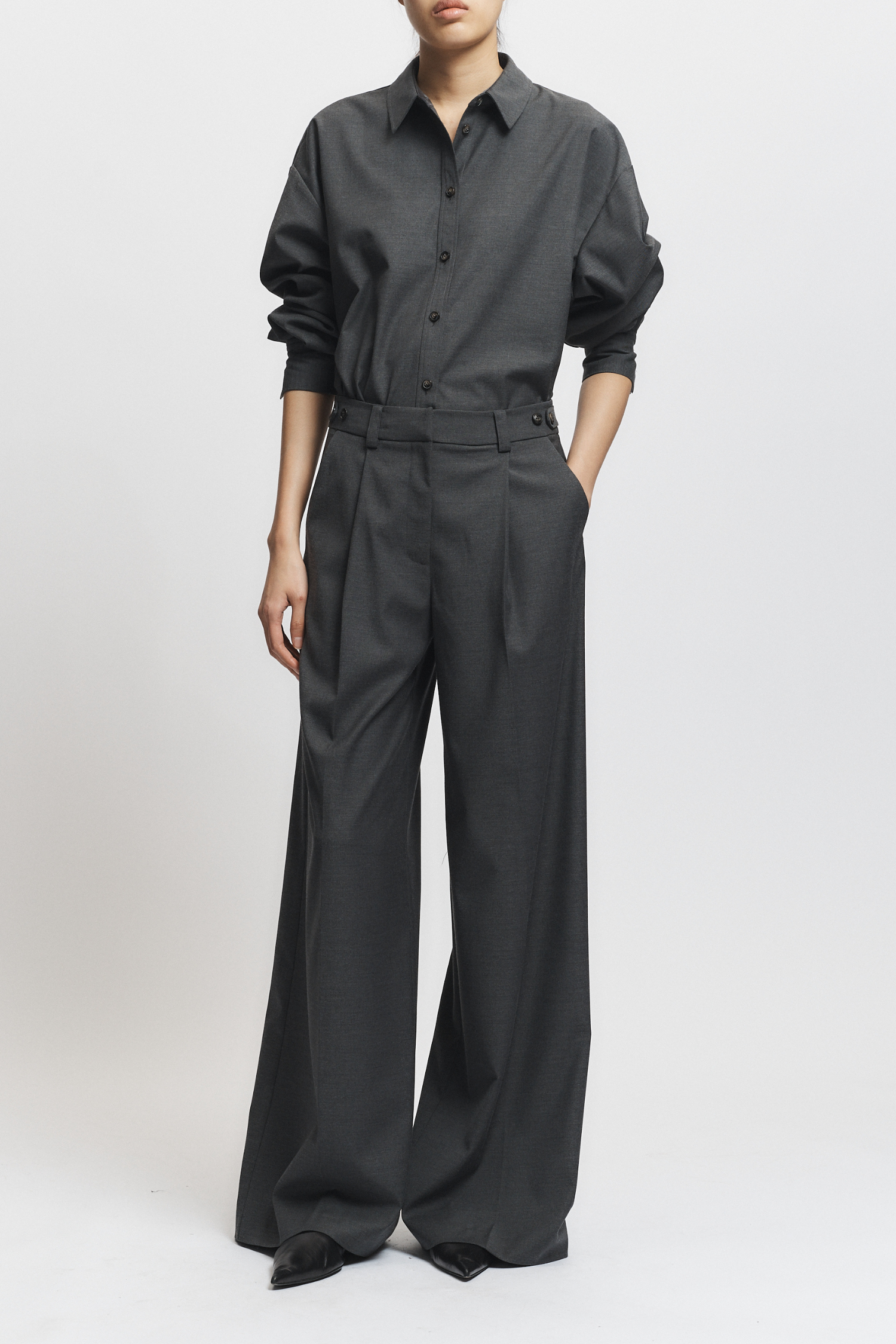 The Eliam Wideleg Trouser in dark grey offers a sophisticated silhouette with its wide-leg cut and practical pockets. Crafted for both style and comfort, it pairs seamlessly with the Kinn oversized shirt, creating a balanced, contemporary look ideal for professional or casual settings.