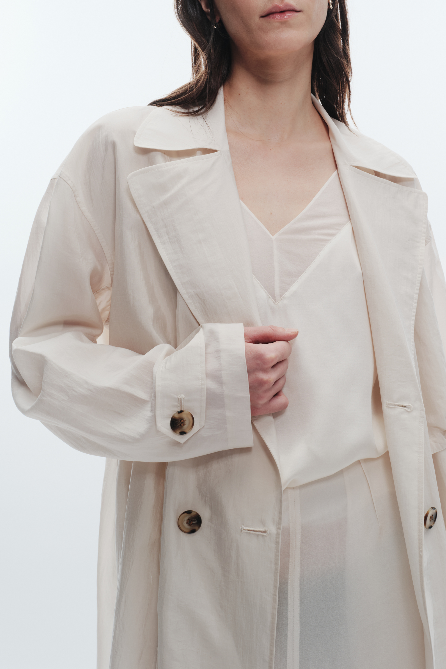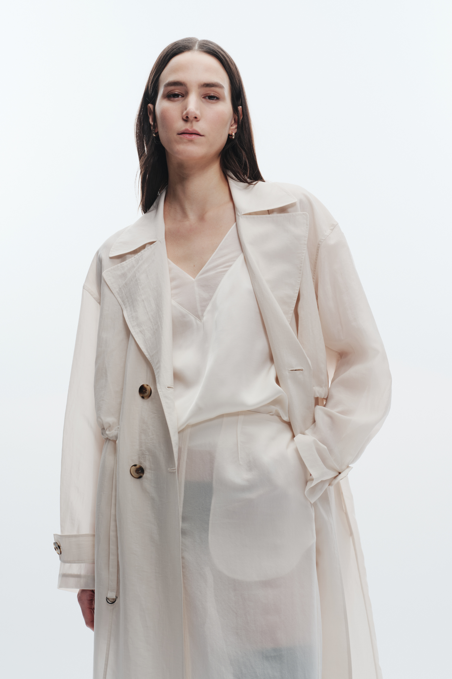 The Osman Sheer Oversized Trench in straw offers a lightweight, translucent layer that enhances any outfit with effortless sophistication. Its oversized fit provides comfort and a modern silhouette, making it ideal for layering. Pair it with the Odin Slip Top and Idris Semi Sheer Skirt for a cohesive, fashion-forward look that balances texture and transparency with refined ease.