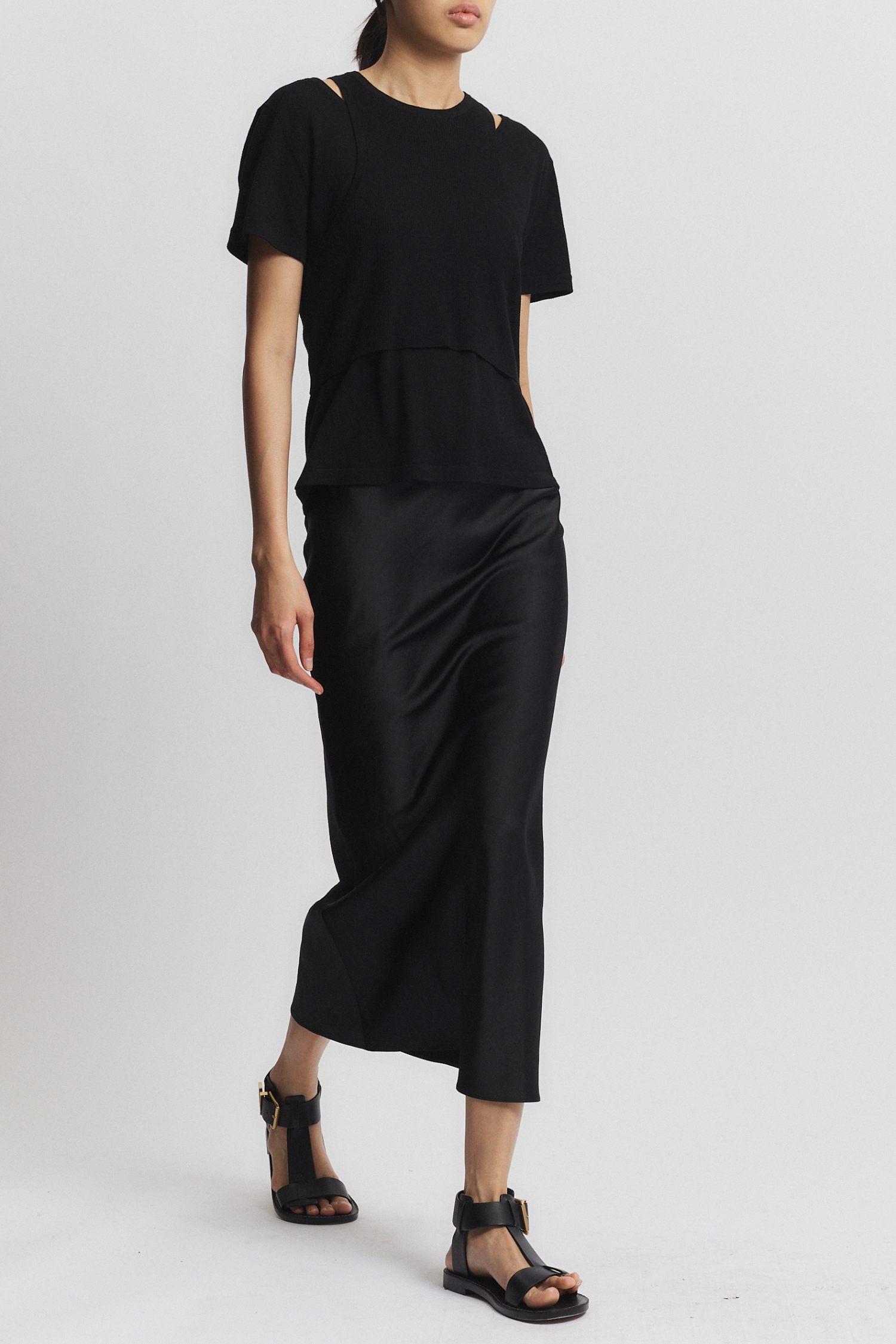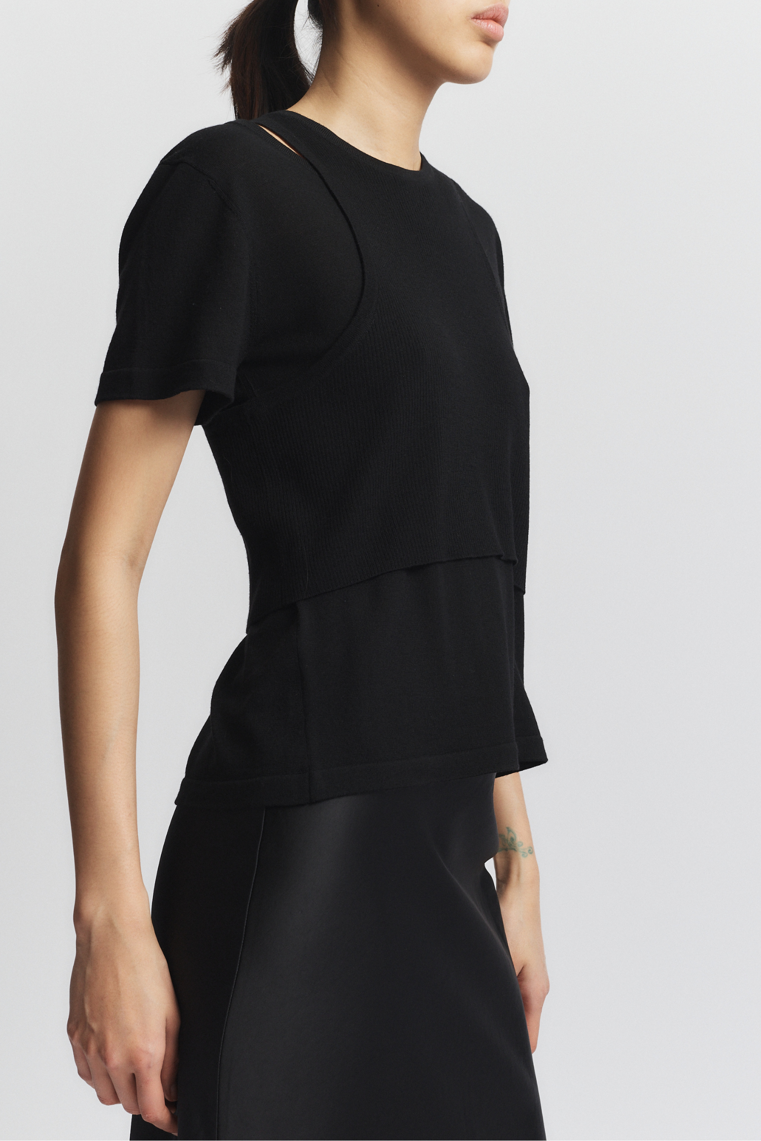 The Steph 2-Piece Knit in black is a versatile and stylish addition to any wardrobe. Made with fine gauge merino, this sporty racer top offers double layering and ribbing for a modern twist on a classic tee or sweater. Its easy and cool design will elevate any outfit.