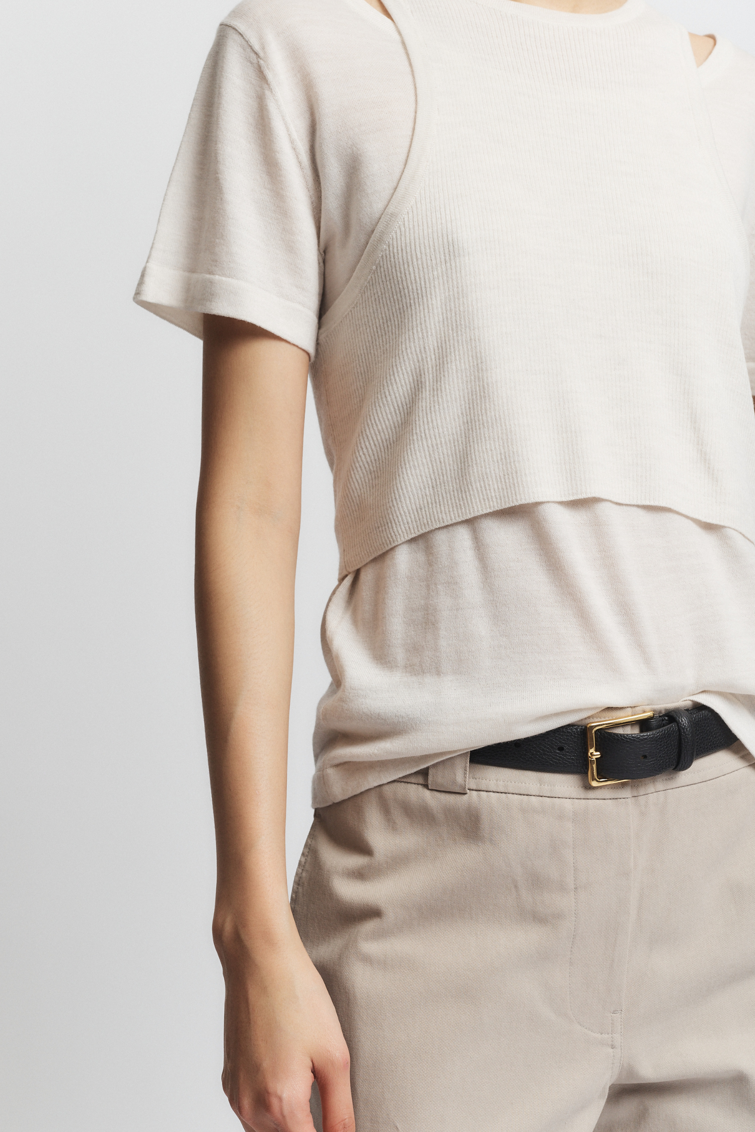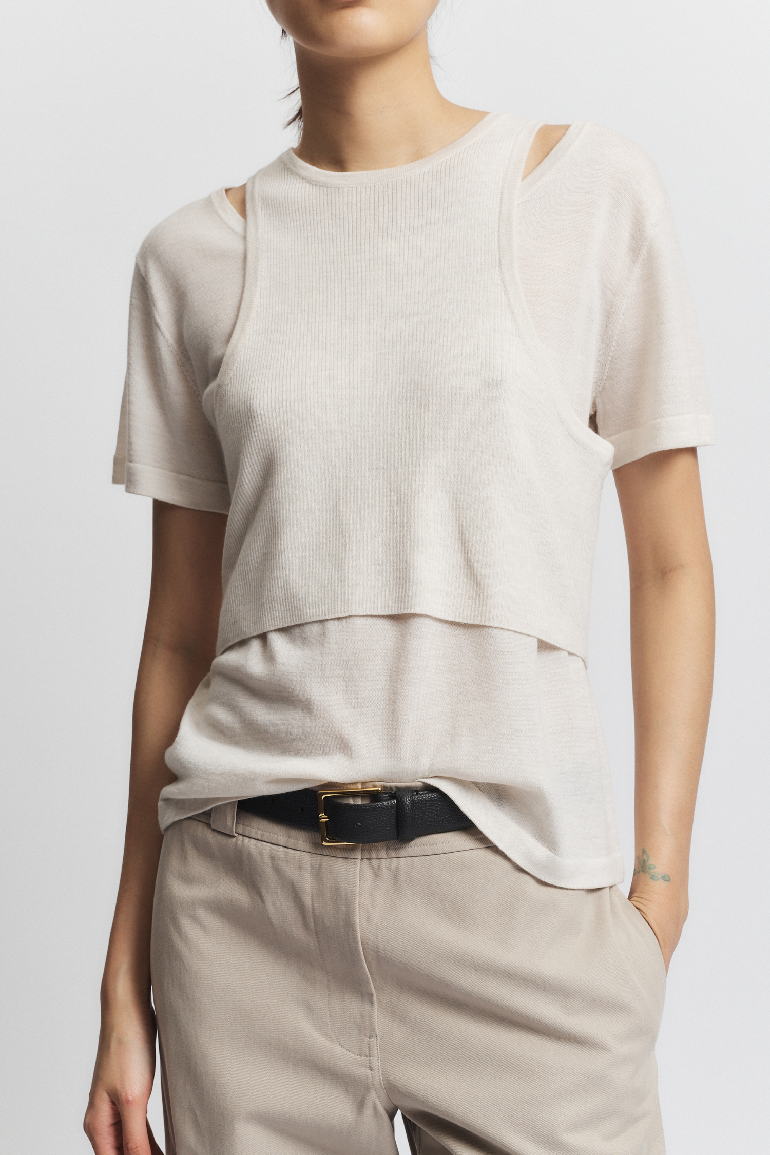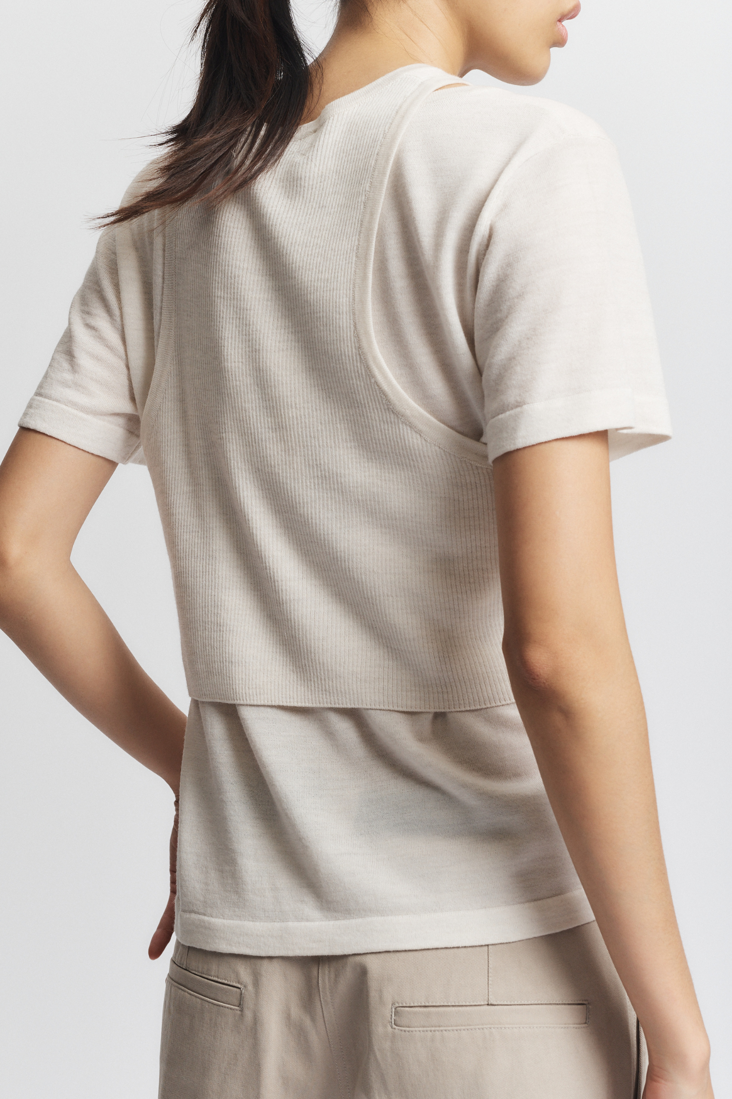The Steph 2-Piece Knit in ivory is a versatile and stylish addition to any wardrobe. Made with fine gauge merino, this sporty racer top offers double layering and ribbing for a modern twist on a classic tee or sweater. Its easy and cool design will elevate any outfit.