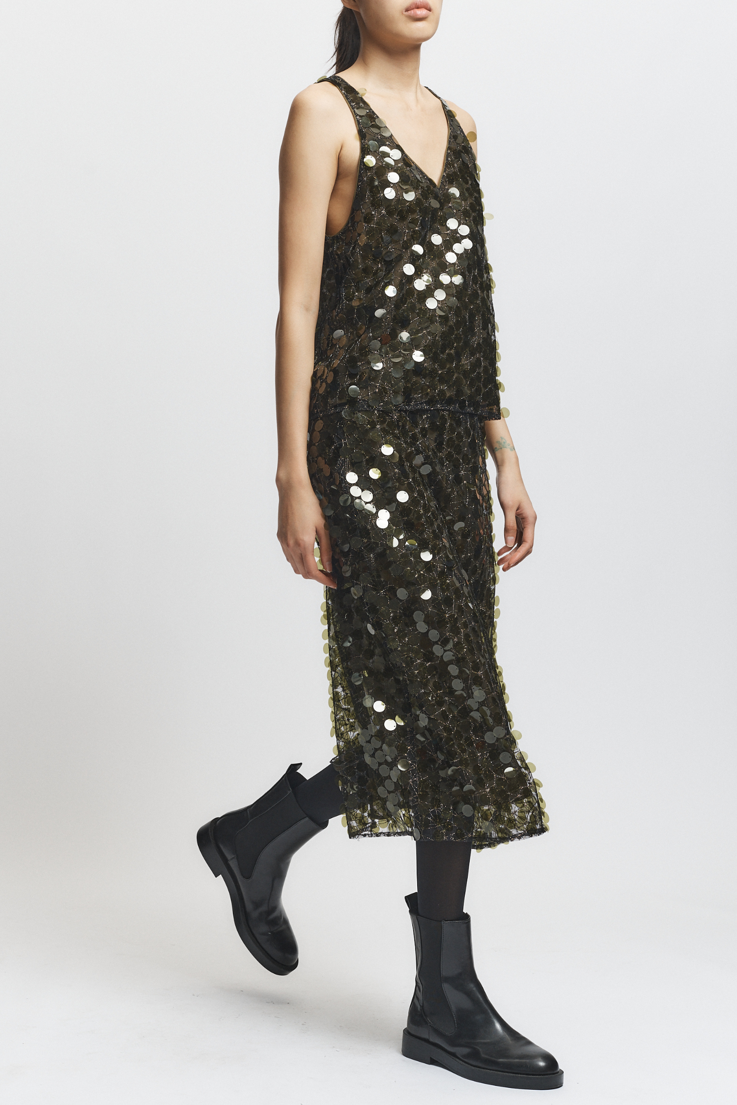 Elevate your wardrobe with the Zyon Mesh Sequin Skirt in olive. This midi-length skirt features shimmering sequins on a delicate mesh fabric, offering a sophisticated blend of texture and shine. Perfectly designed to pair with the Sol Sequin top, it creates a cohesive, polished look ideal for evening events or special occasions. The olive hue adds a unique, refined touch that complements a variety of styles.