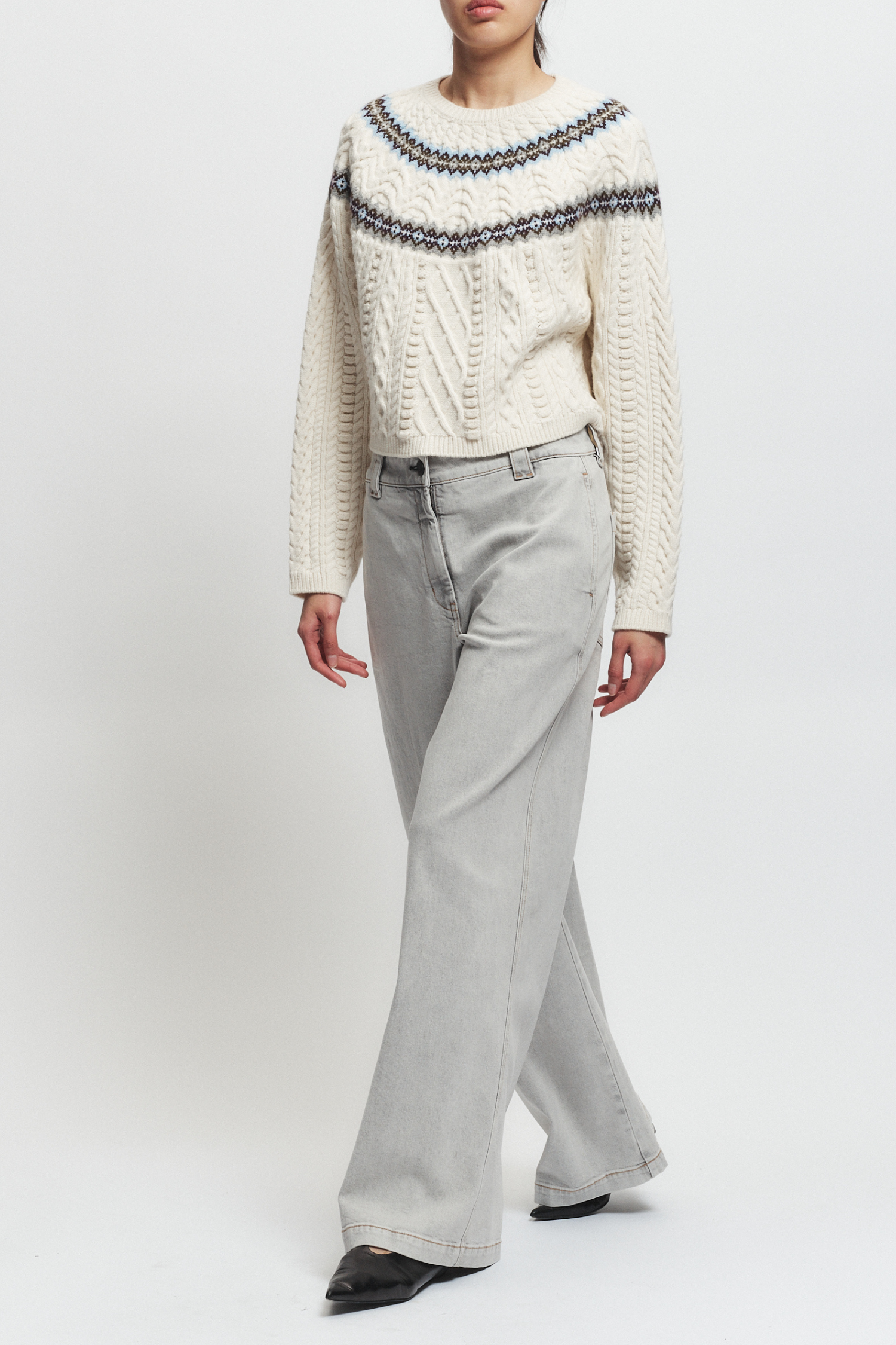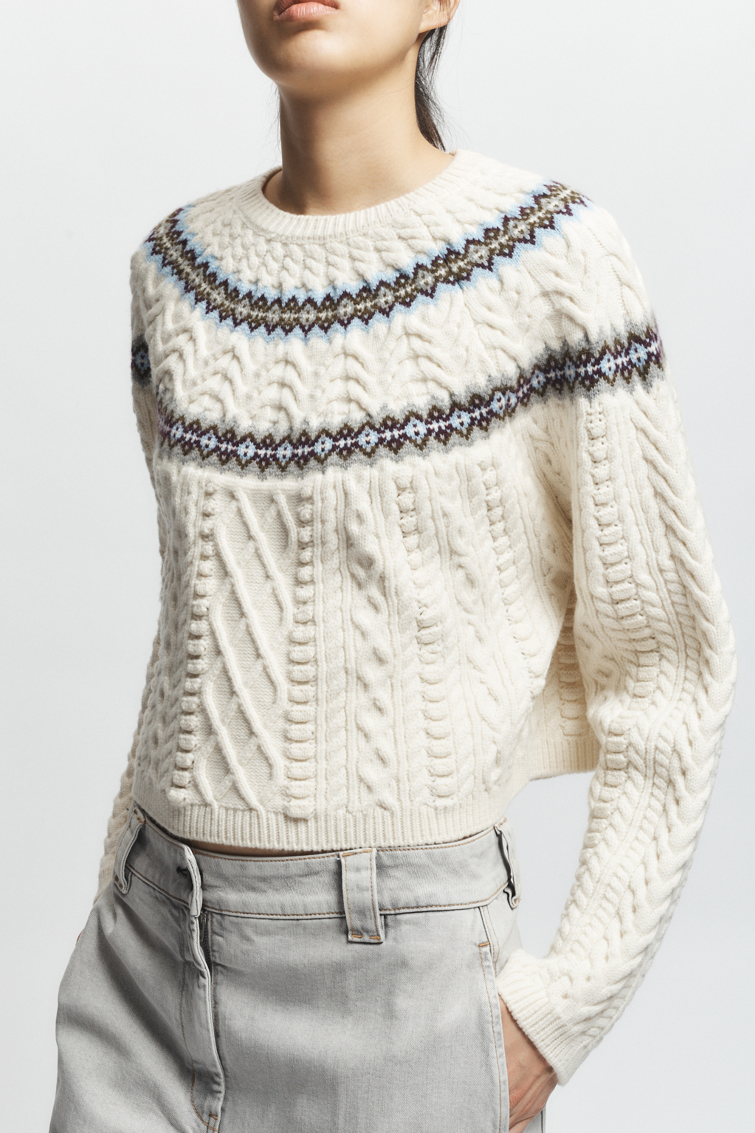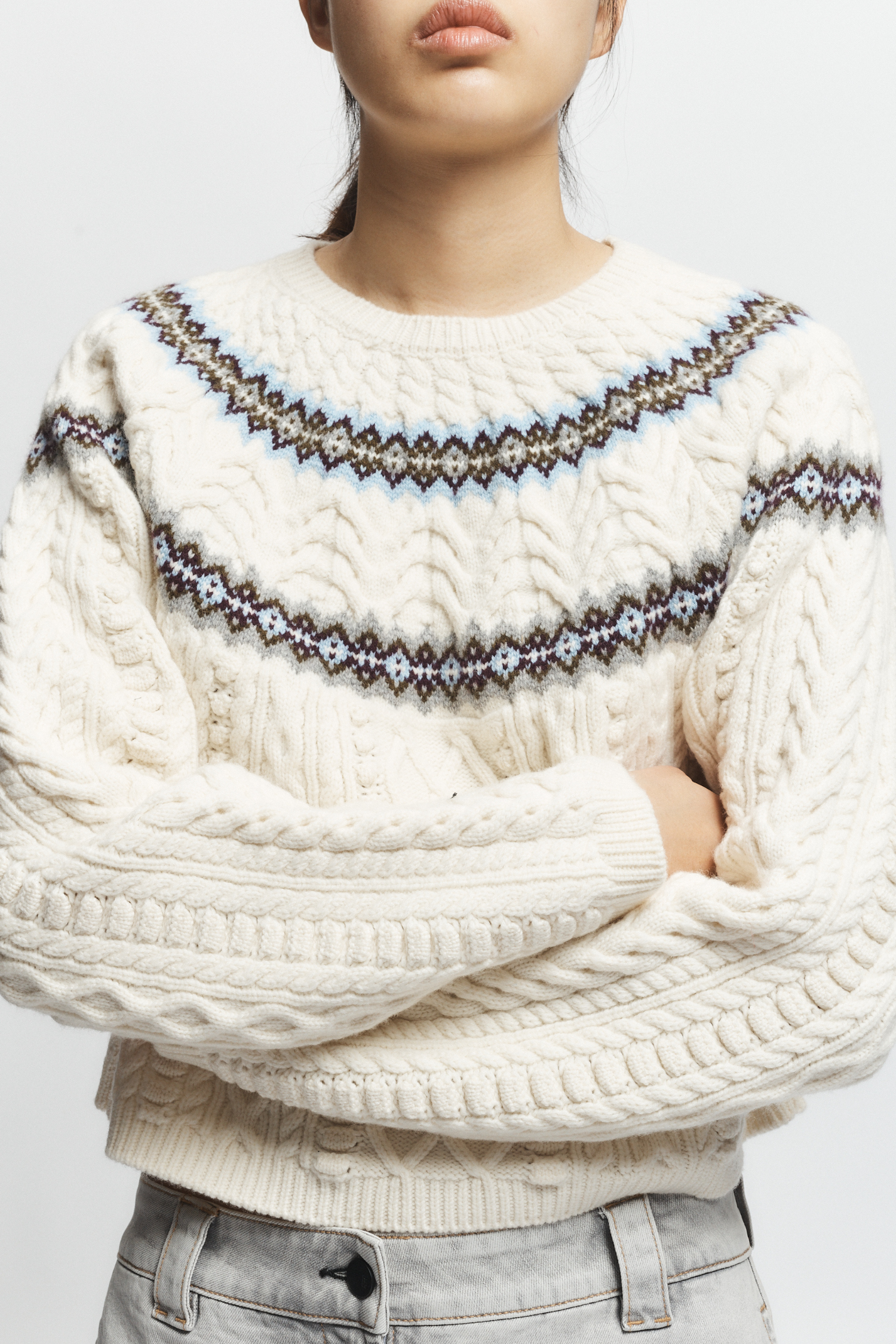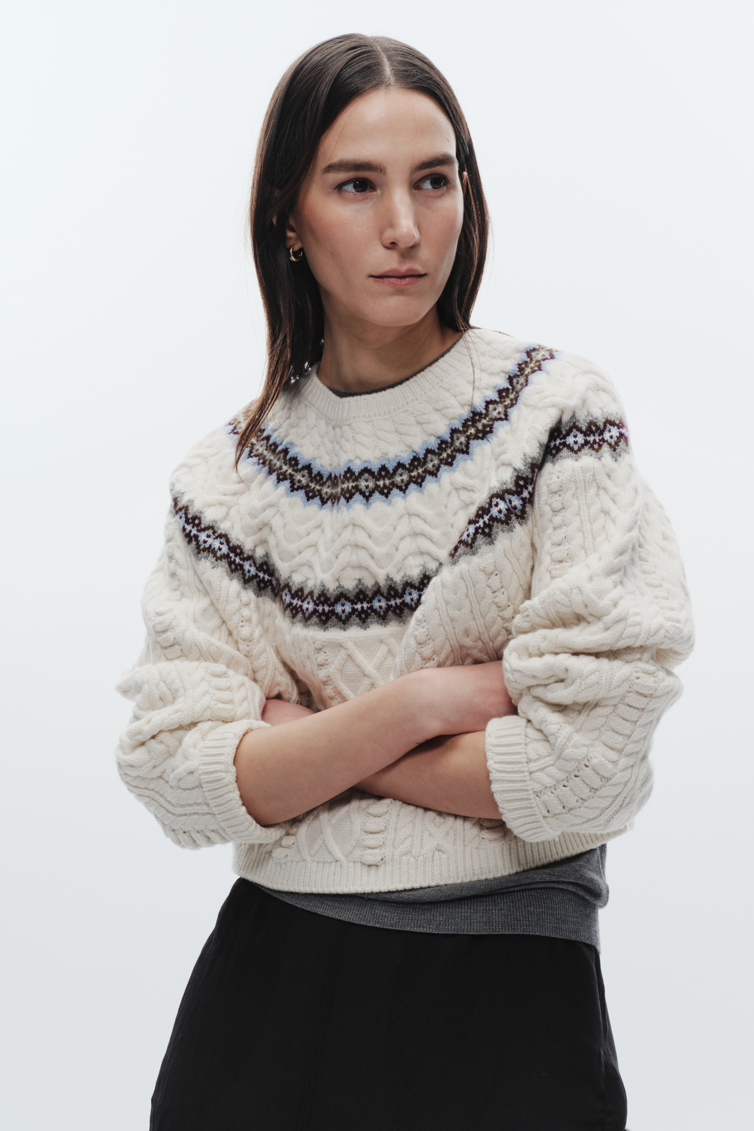Crafted from premium wool, the Ainsley Fair Isle Sweater in ivory showcases a timeless knit design that combines traditional craftsmanship with modern elegance. Its intricate patterning offers both warmth and refined texture, making it an essential piece for sophisticated layering in cooler seasons. The natural ivory hue enhances versatility, allowing seamless integration into a curated wardrobe.