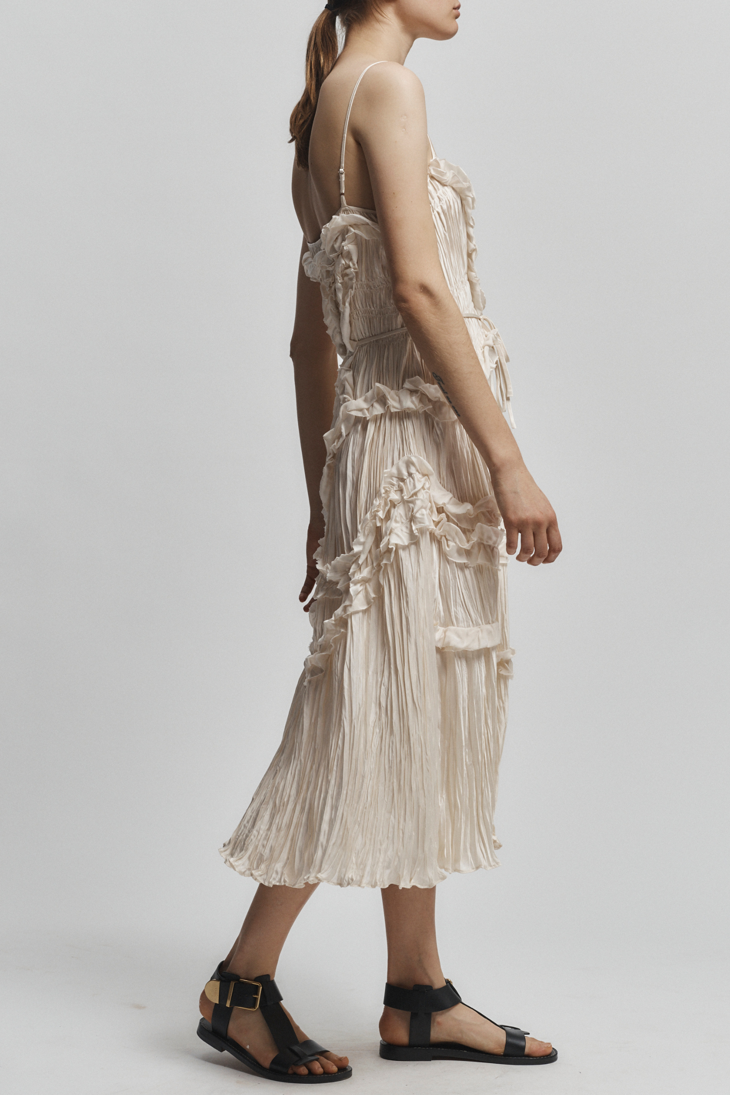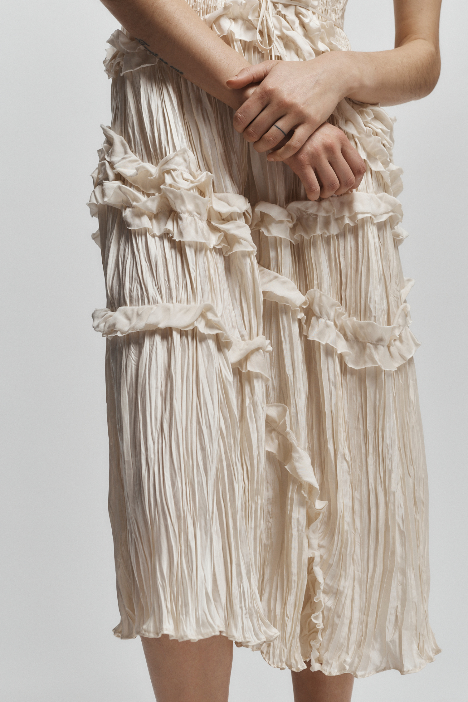 Elevate your style with our Bella Ruched Midi Dress in Ivory. The ruched and ruffled viscose fabric adds a feminine touch to this dress, while the sweetheart neckline and adjustable straps allow for a customizable fit. Complete with a removable tie at the waist, this dress is girly, sophisticated, and sure to make a statement.