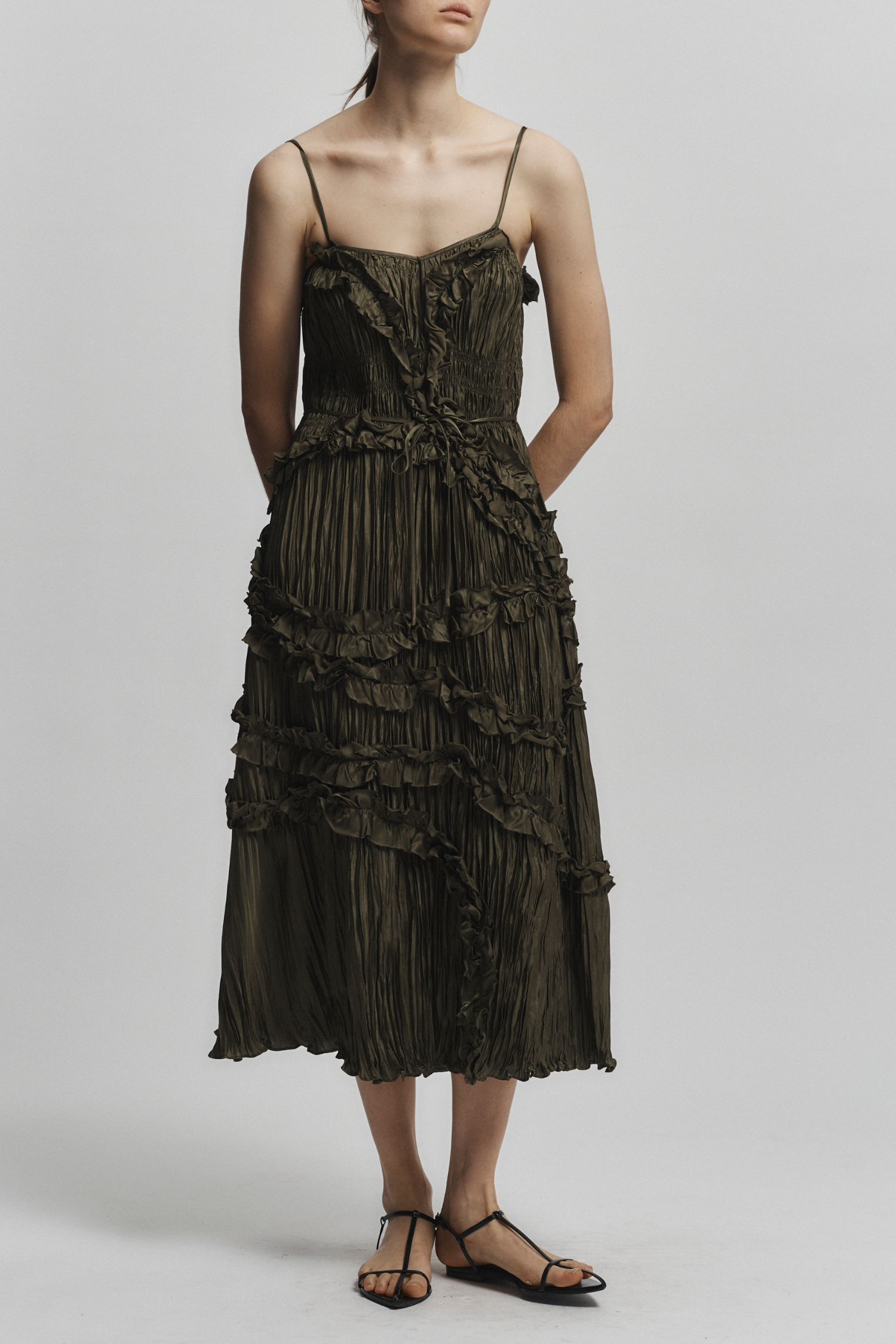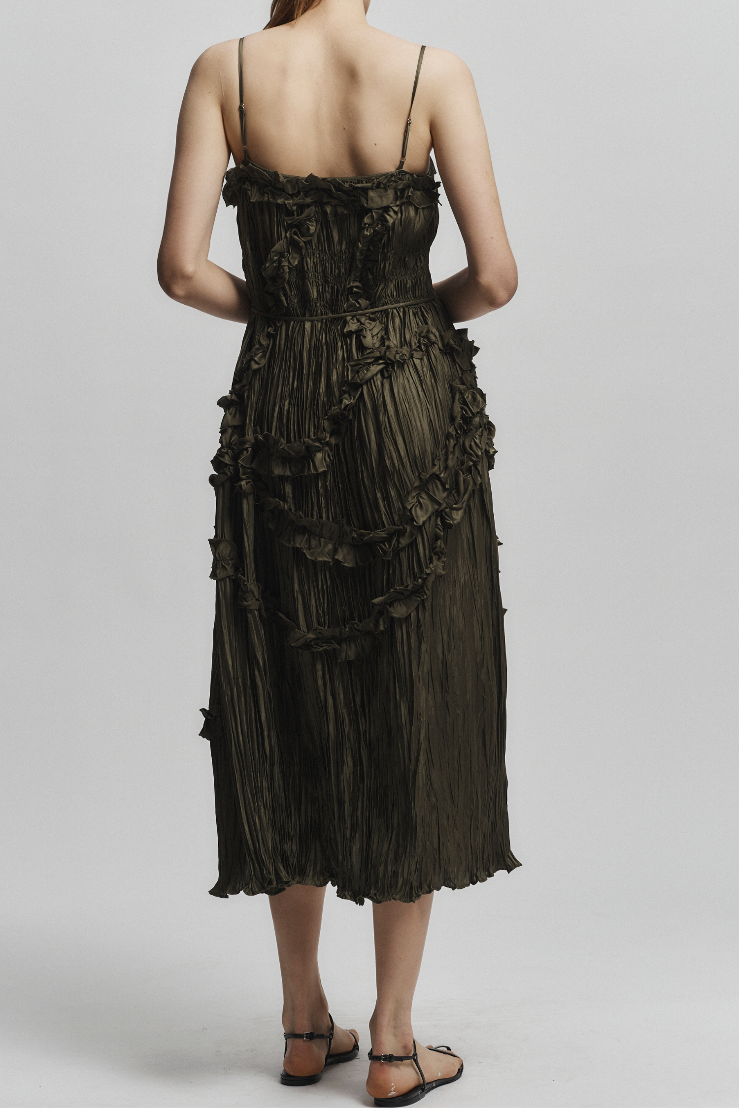 Elevate your style with our Bella Ruched Midi Dress in Olive. The ruched and ruffled viscose fabric adds a feminine touch to this dress, while the sweetheart neckline and adjustable straps allow for a customizable fit. Complete with a removable tie at the waist, this dress is girly, sophisticated, and sure to make a statement.