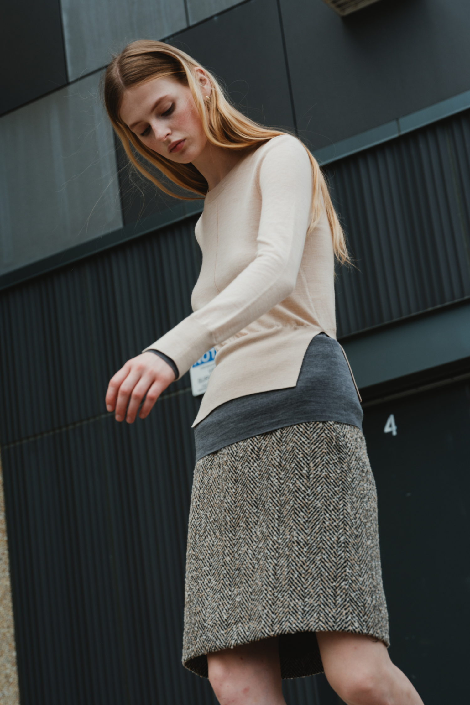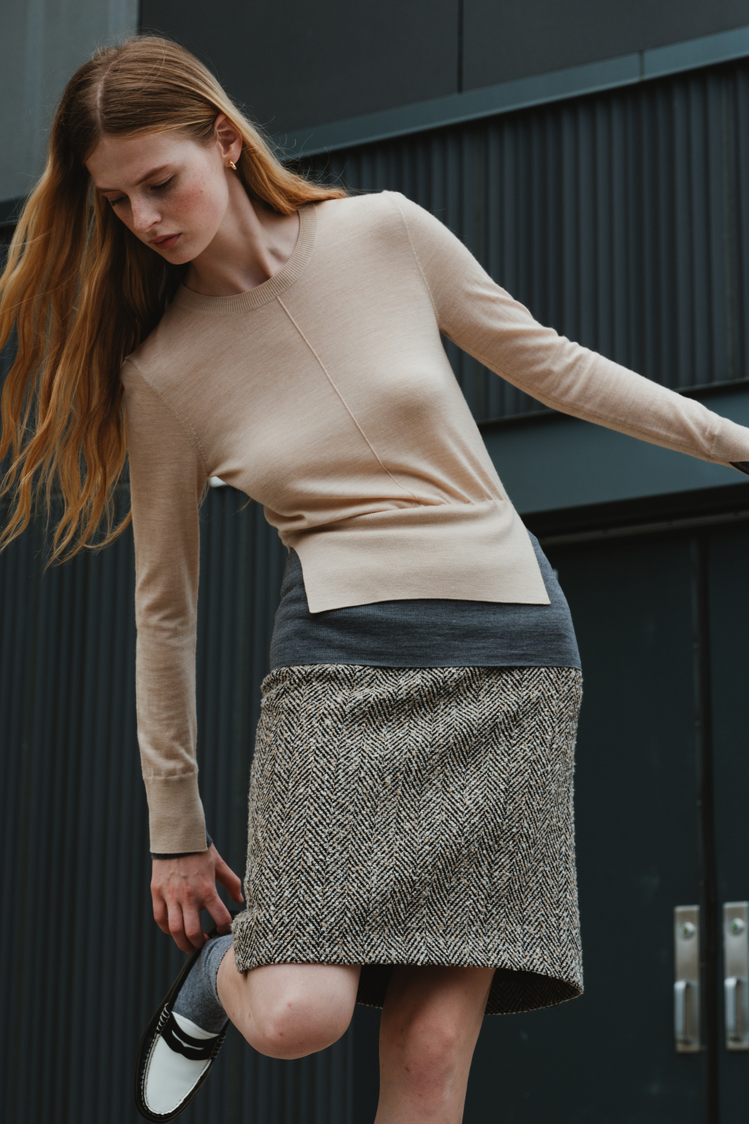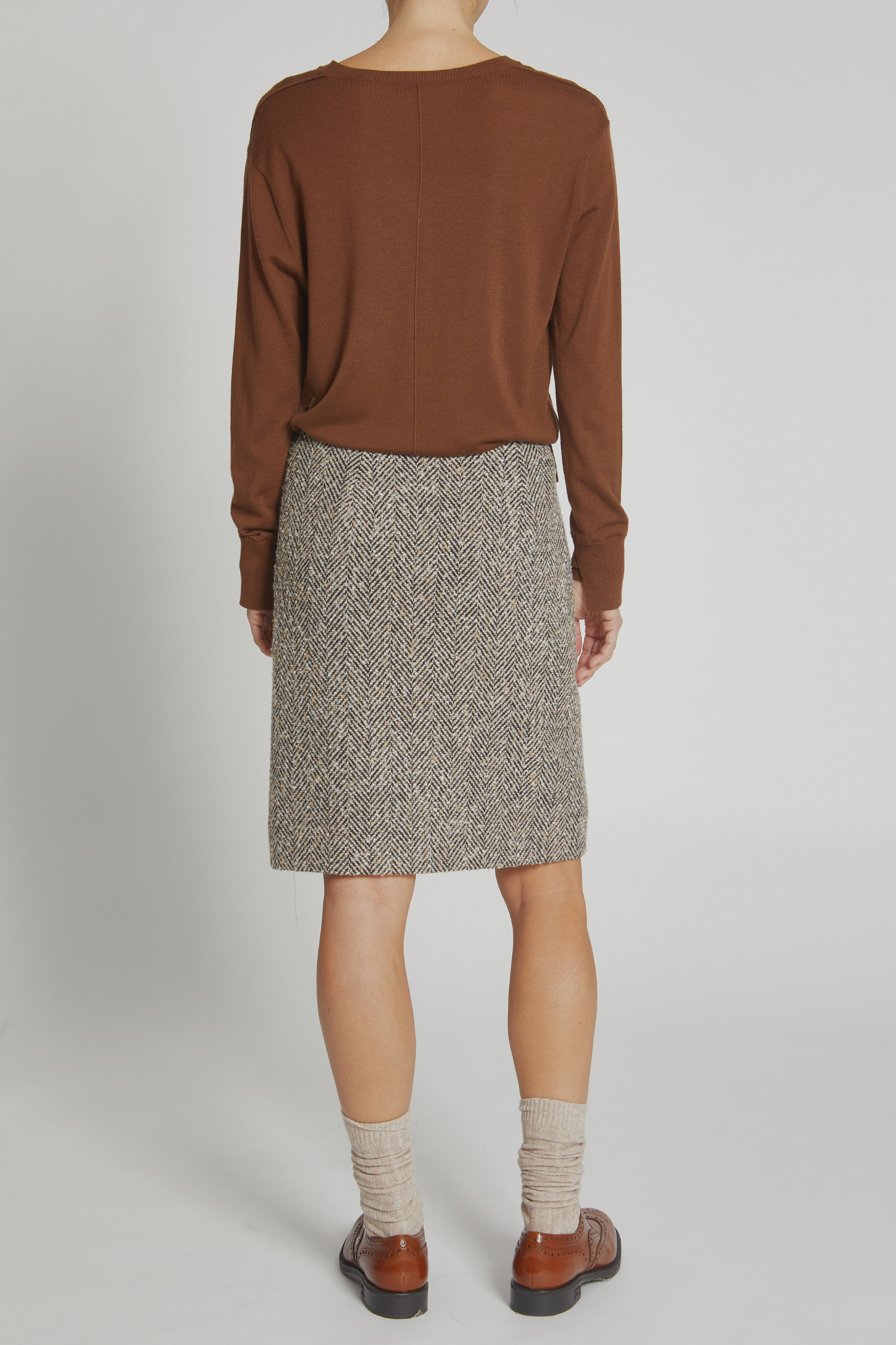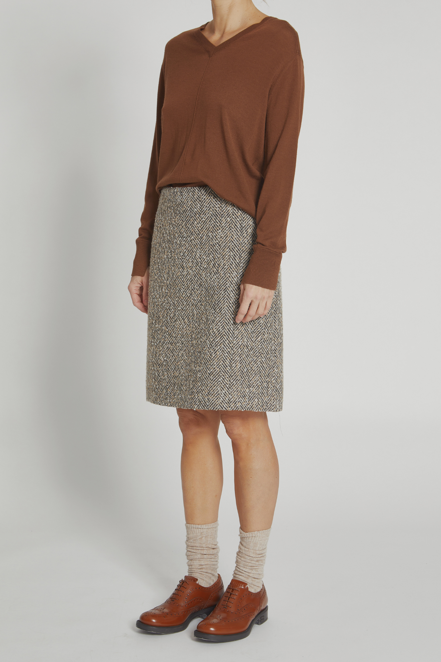 Expertly crafted from a luxurious wool blend, the Demi Boucle Skirt in herringbone is both timeless and on-trend with its classic prep-inspired style. The above-knee length and back zipper add convenience, while the lining provides all-day comfort. Elevate your wardrobe with this chic and versatile piece.
