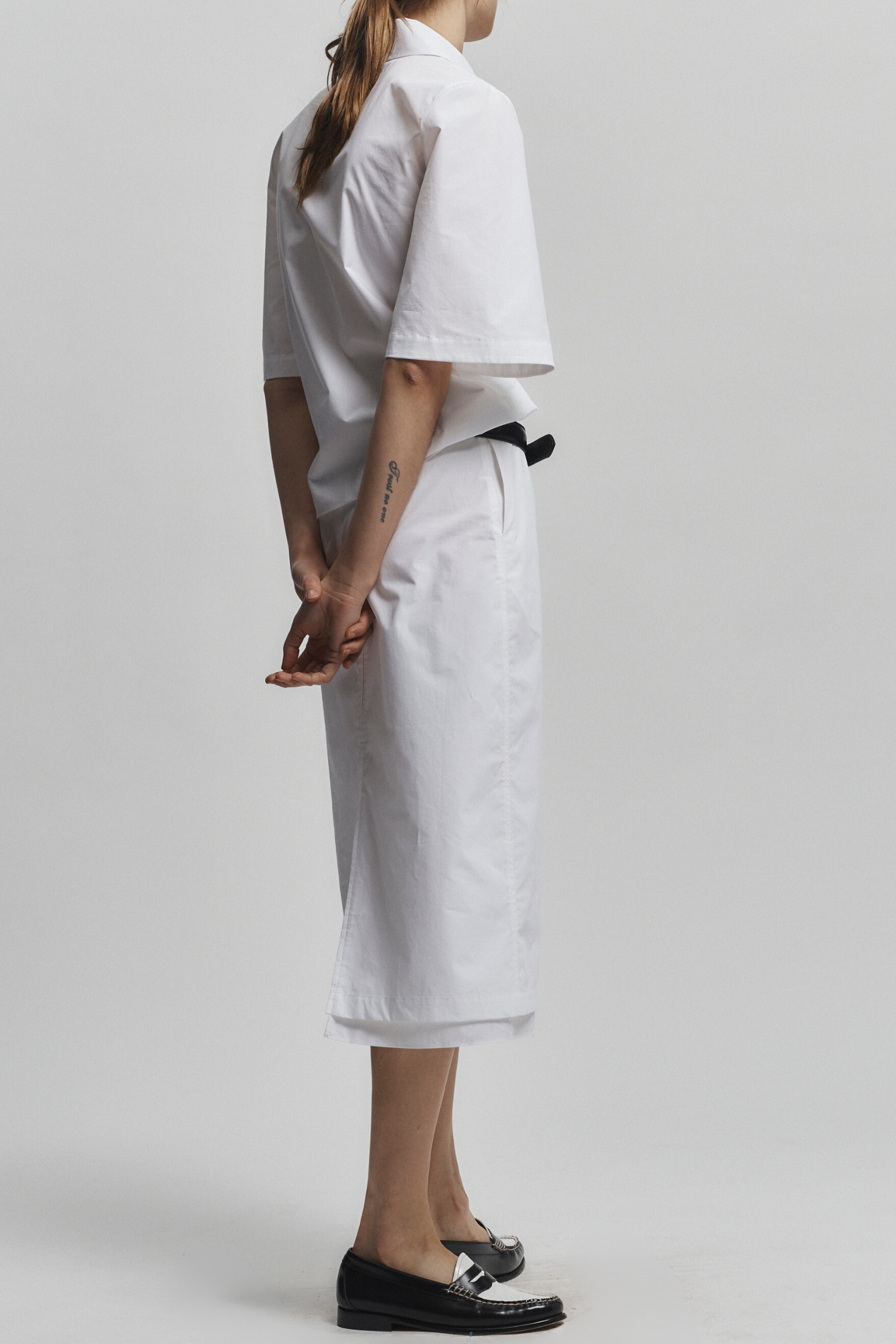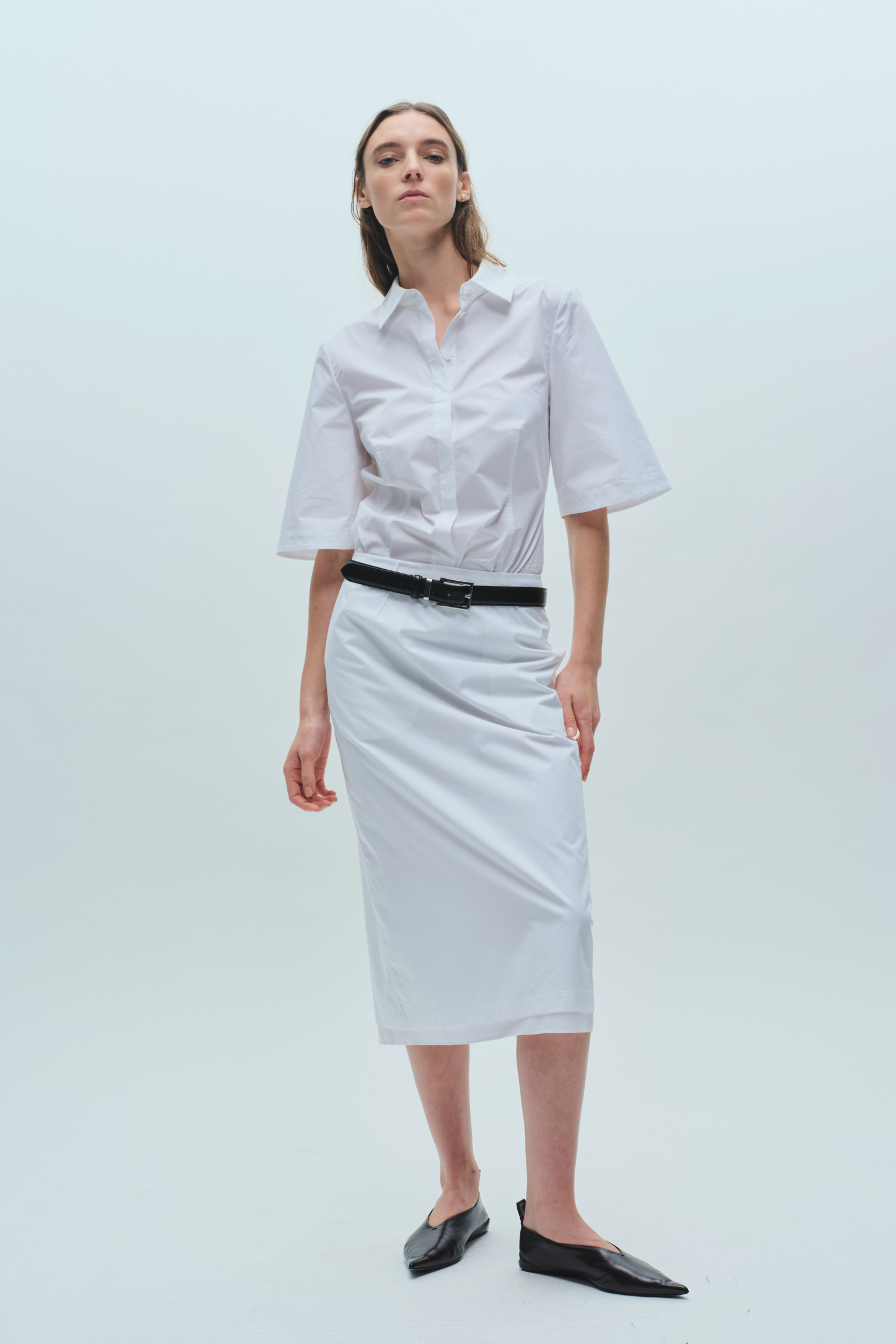 Crafted from soft, crisp poplin, the Dion Short Sleeve Buttondown in White offers both comfort and style. The elbow length sleeve adds a touch of sophistication, making it the perfect pairing for the Dutton skirt. Elevate your look with this versatile, timeless piece.