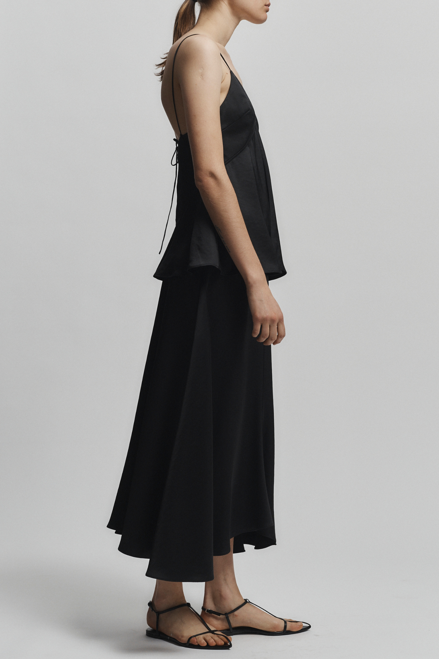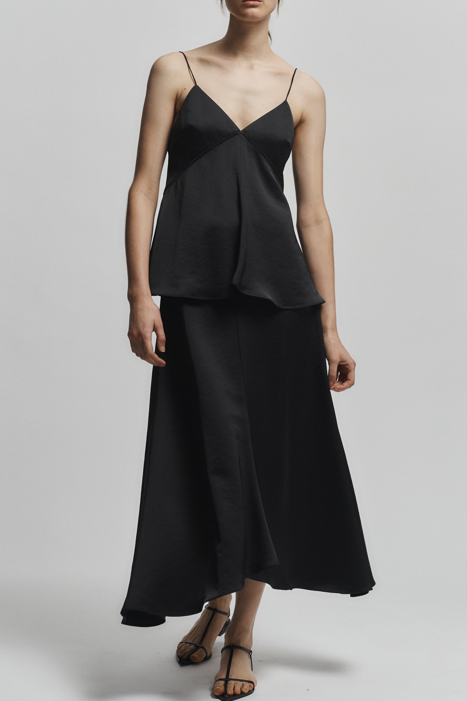 Expertly designed for style and comfort, the Frieda A-Line Skirt in Black is a must-have piece for any wardrobe. Made with heavy charmeuse fabric, this midi skirt boasts a flattering a-line silhouette and is machine washable for easy care. Pair it with our Elise top for a sophisticated ensemble.
