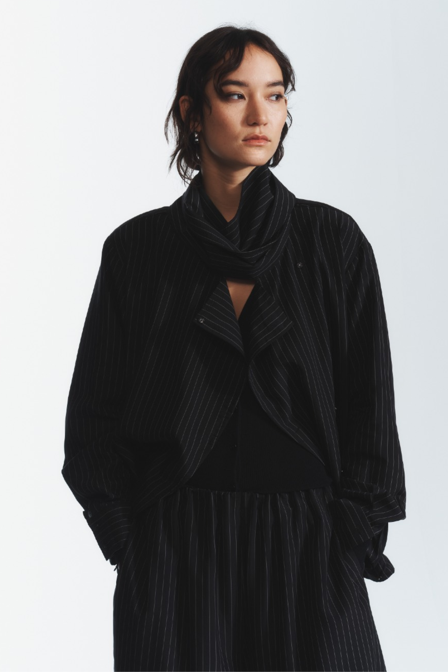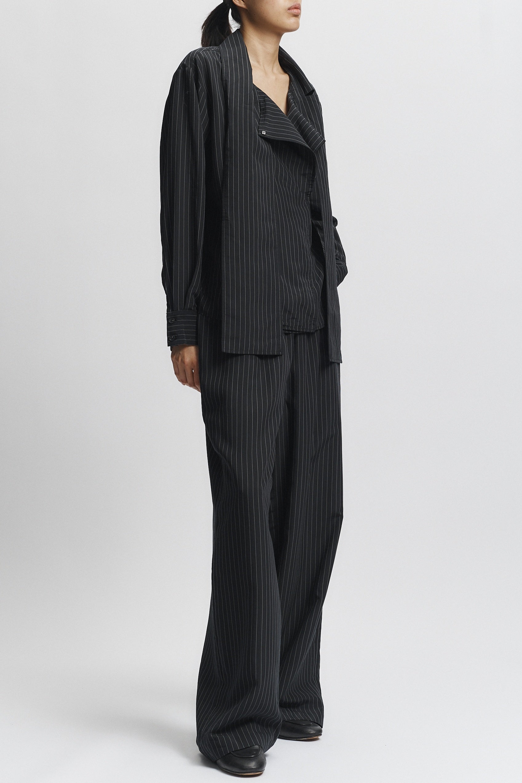 The Ivan Pinstripe Blouse in black features a refined pinstripe pattern that adds subtle sophistication to your wardrobe. Designed to coordinate seamlessly, it pairs perfectly with the Houston Pinstripe pant in black for a polished, professional look. Crafted with attention to detail, this blouse offers a sleek silhouette ideal for both office settings and formal occasions. Elevate your ensemble with this expertly tailored piece that balances classic style and modern elegance.