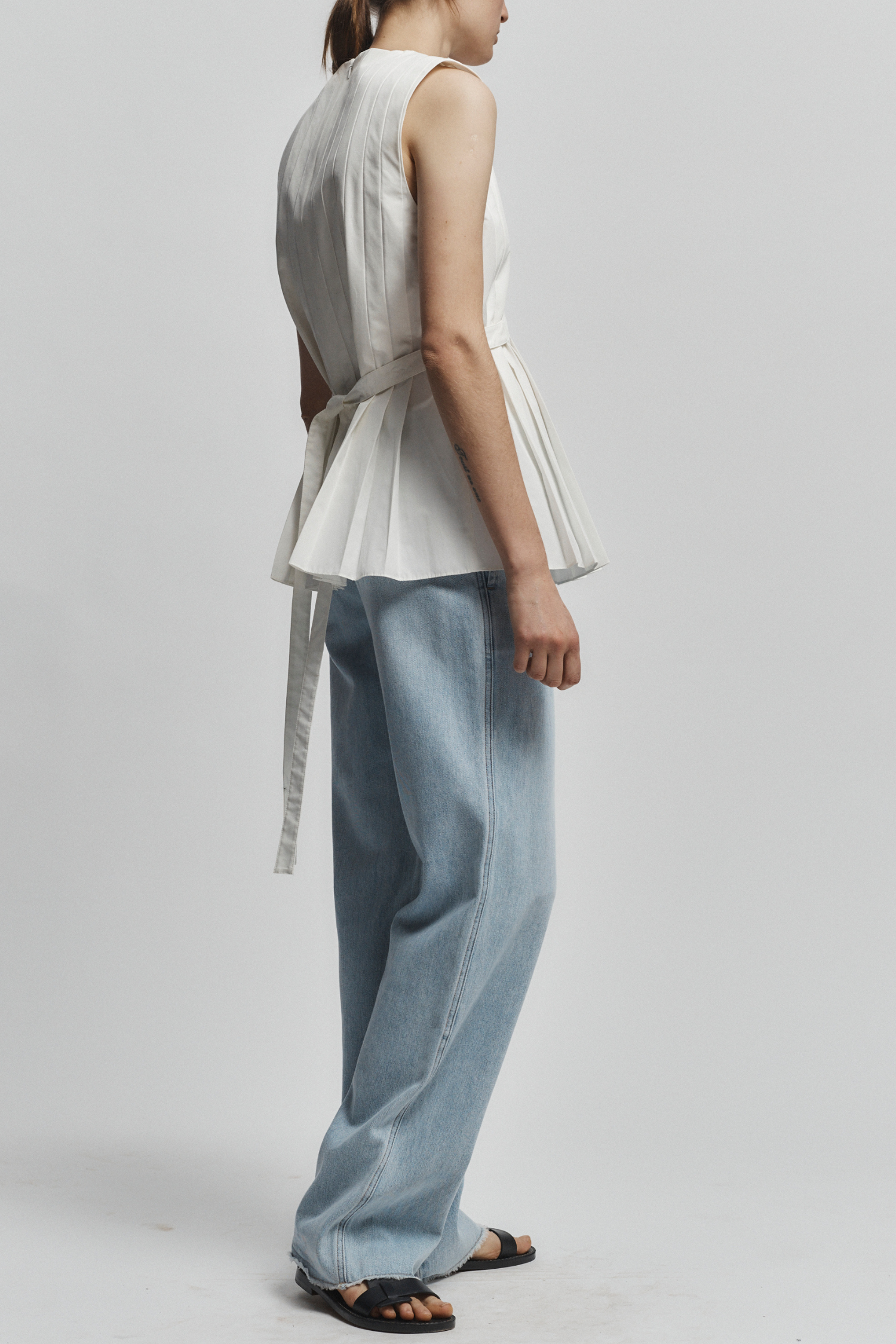 The Kallie Pleated Top is a versatile and sophisticated addition to your wardrobe. Made from a blend of cotton and poly poplin, it features delicate pleats and a flattering belt to accentuate your figure. In a crisp white color, this top pairs perfectly with the Nessa denim pant in 80s pale wash for a timeless and polished look.