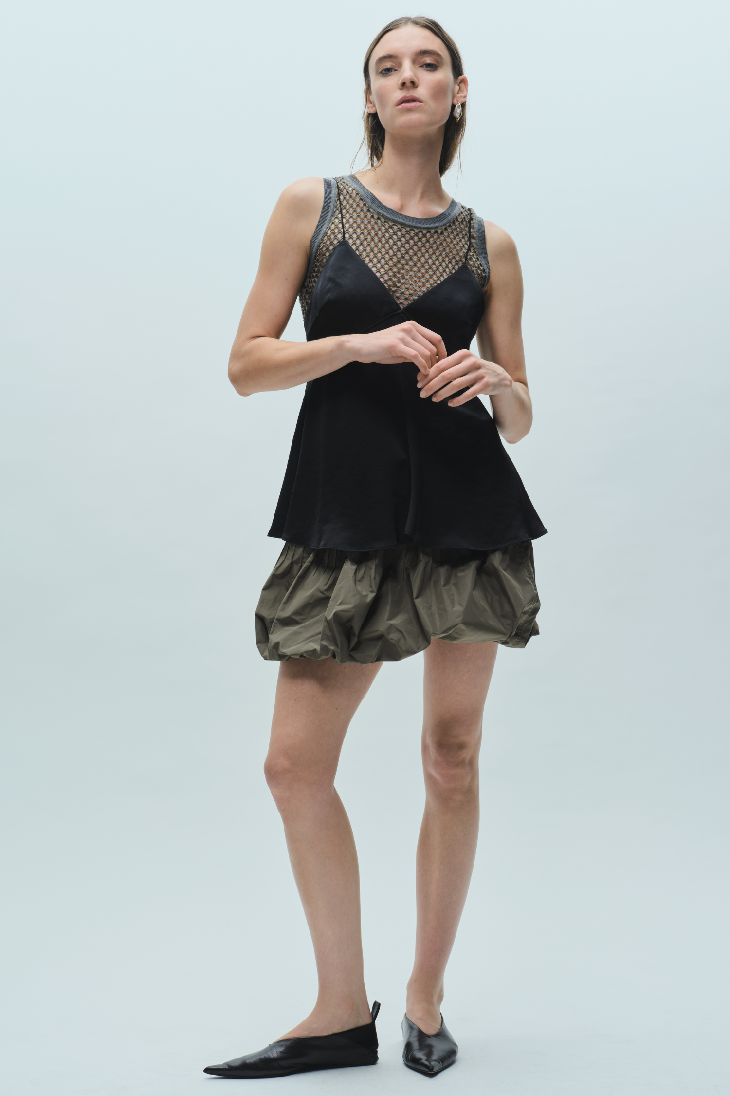 The Katie Bubble Skirt, available in Olive, is a must-have addition to any wardrobe. Crafted from taffeta, this bubble mini skirt features pin tuck pleats and convenient side pockets. When paired with the Perla tank, this skirt creates a chic and timeless look. Elevate your style with this versatile piece.