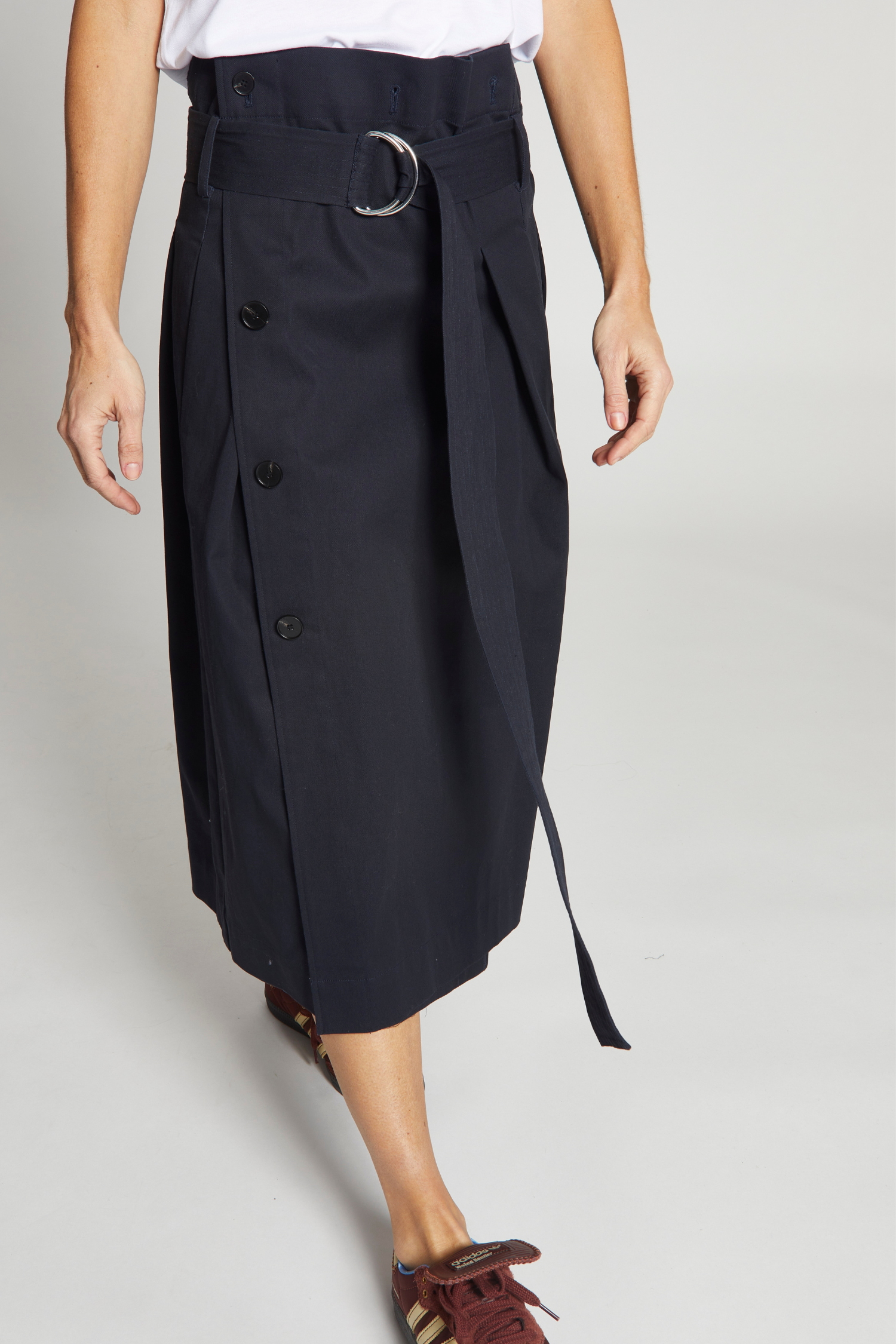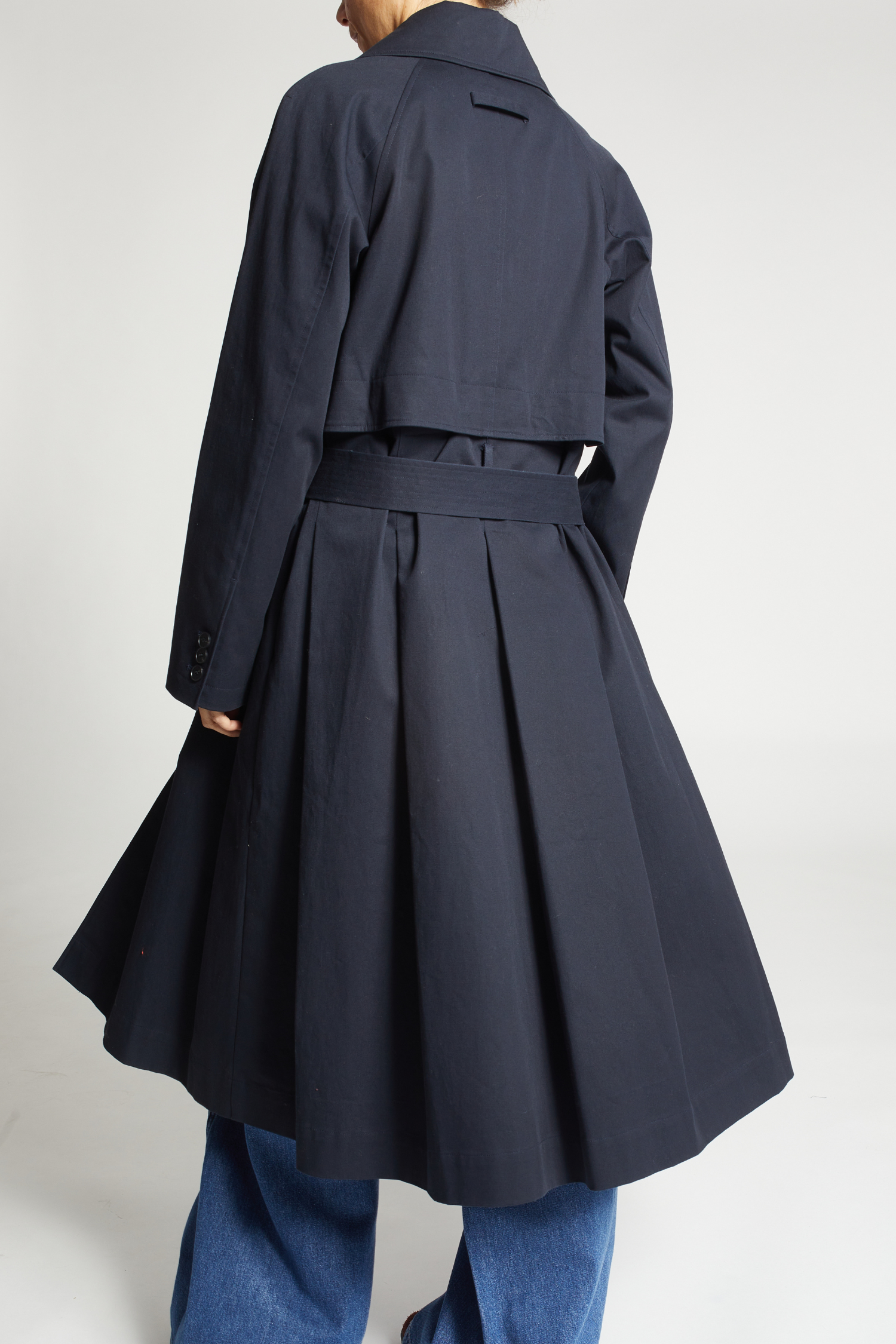 The London Trench Coat in khaki twill, your go-to outerwear for transitional seasons and versatile temperatures. This coat offers functionality and style, designed to be worn in three distinct ways: as a jacket, trench, or skirt. With interior buttons that allow for effortless transformation into a skirt or jacket, and a removable tie waist with a d-ring for customizable silhouette, this coat combines practicality with fashion-forward design. Complete with a collar, horn buttons, and two front pockets, it seamlessly blends classic elements with modern flair. The pleated back adds a touch of sophistication and femininity, making the London Trench Coat a must-have for navigating transitional weather in style.