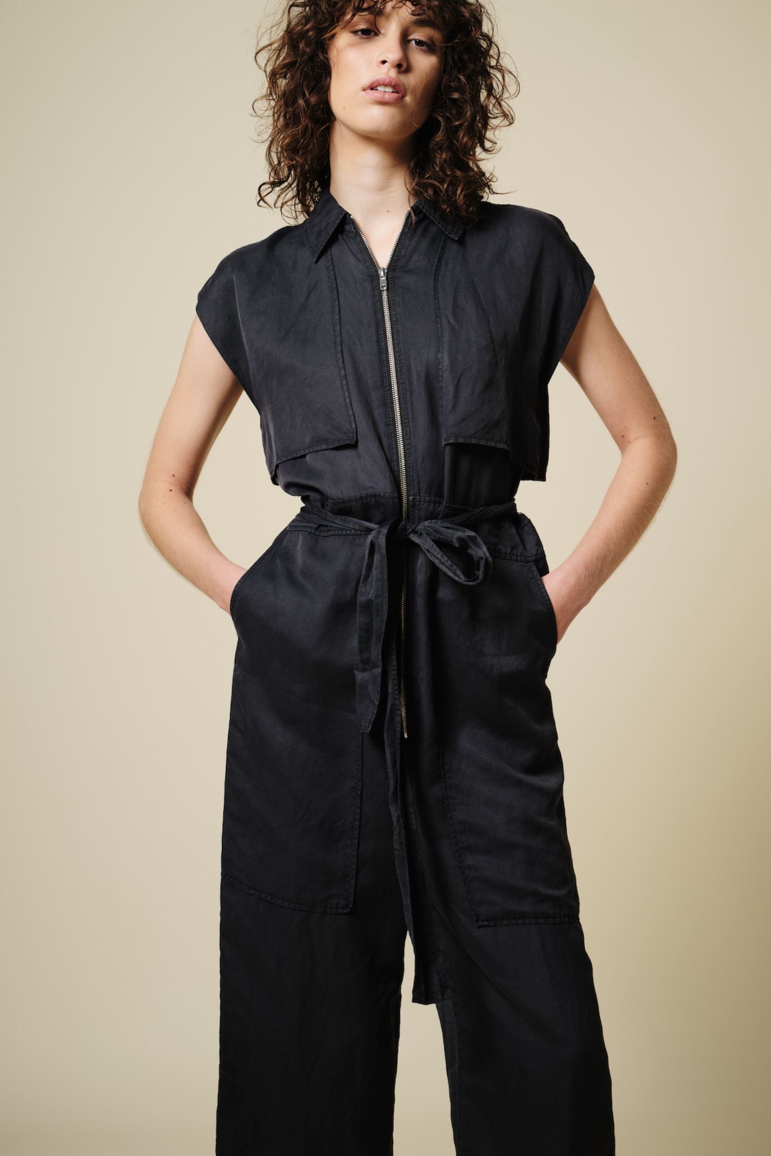 The Maxine Short Sleeve Cargo Jumpsuit in Licorice Black is a versatile and stylish addition to your wardrobe. Made with a super soft blend of cotton and tencel, this jumpsuit features a garment dye wash that creates a beautiful tone of licorice black. The exposed zipper front and utility details with pockets add a touch of functional charm. Complete with a removable tie at the waist, this jumpsuit is perfect for effortless and comfortable everyday wear.