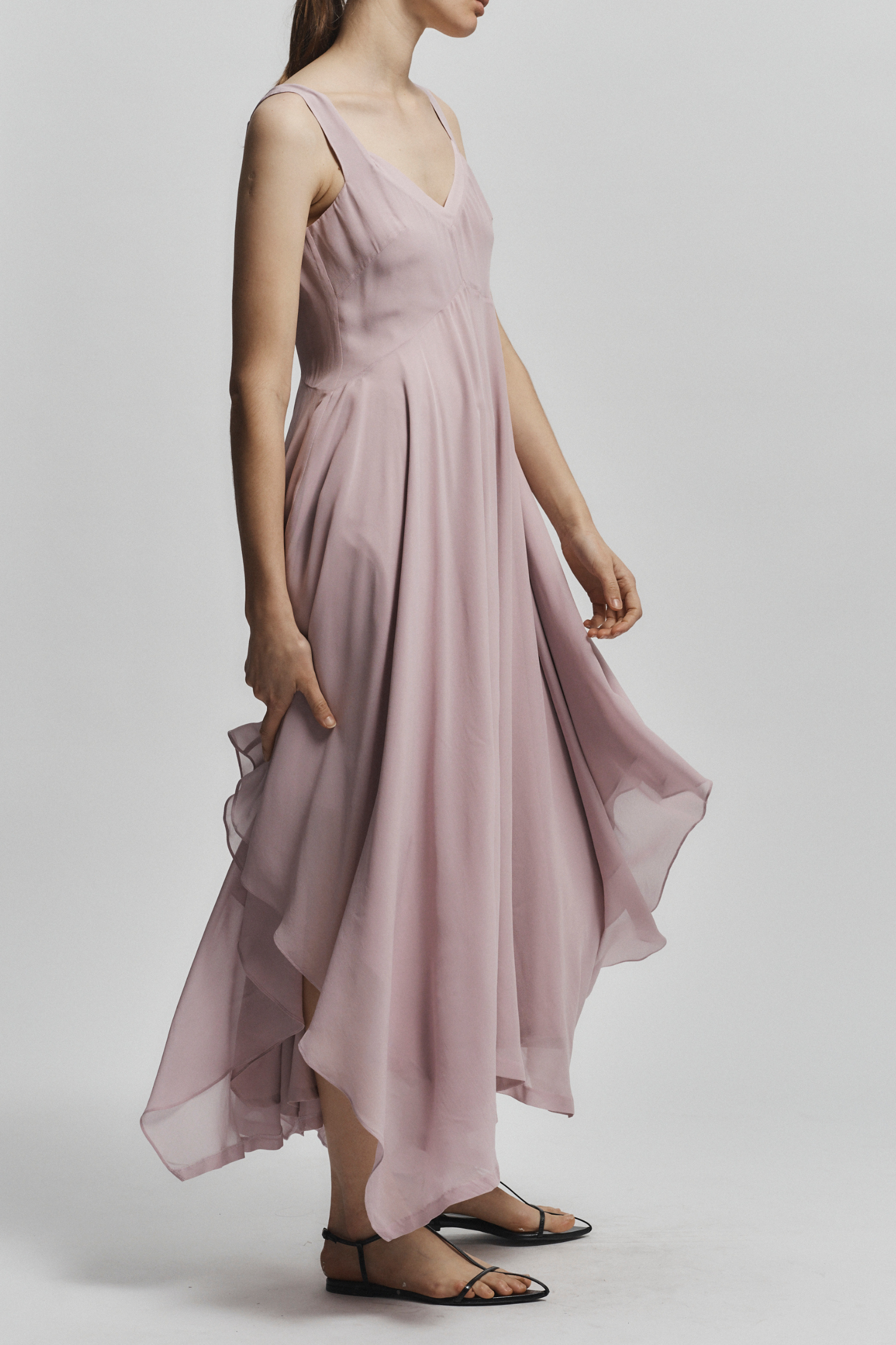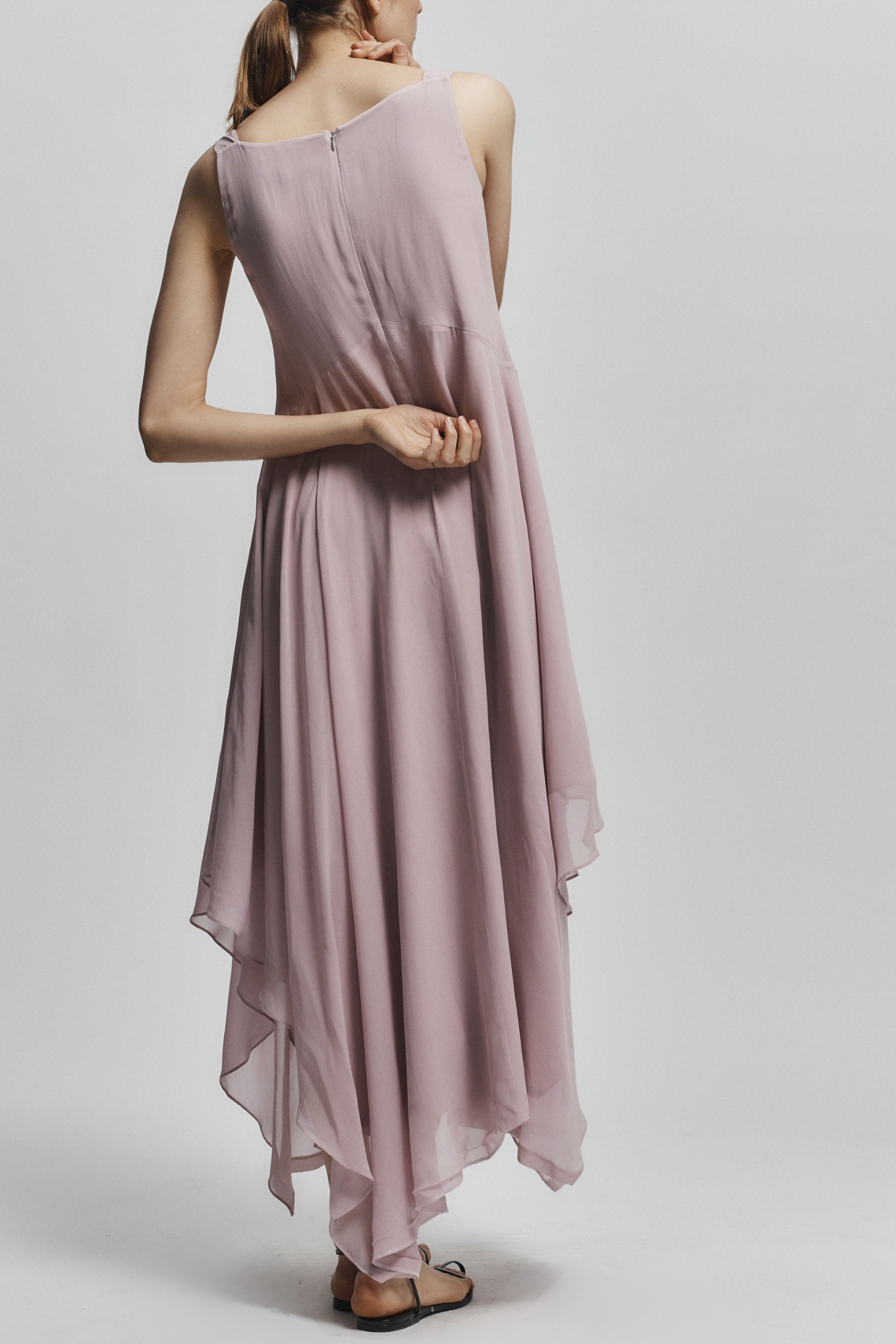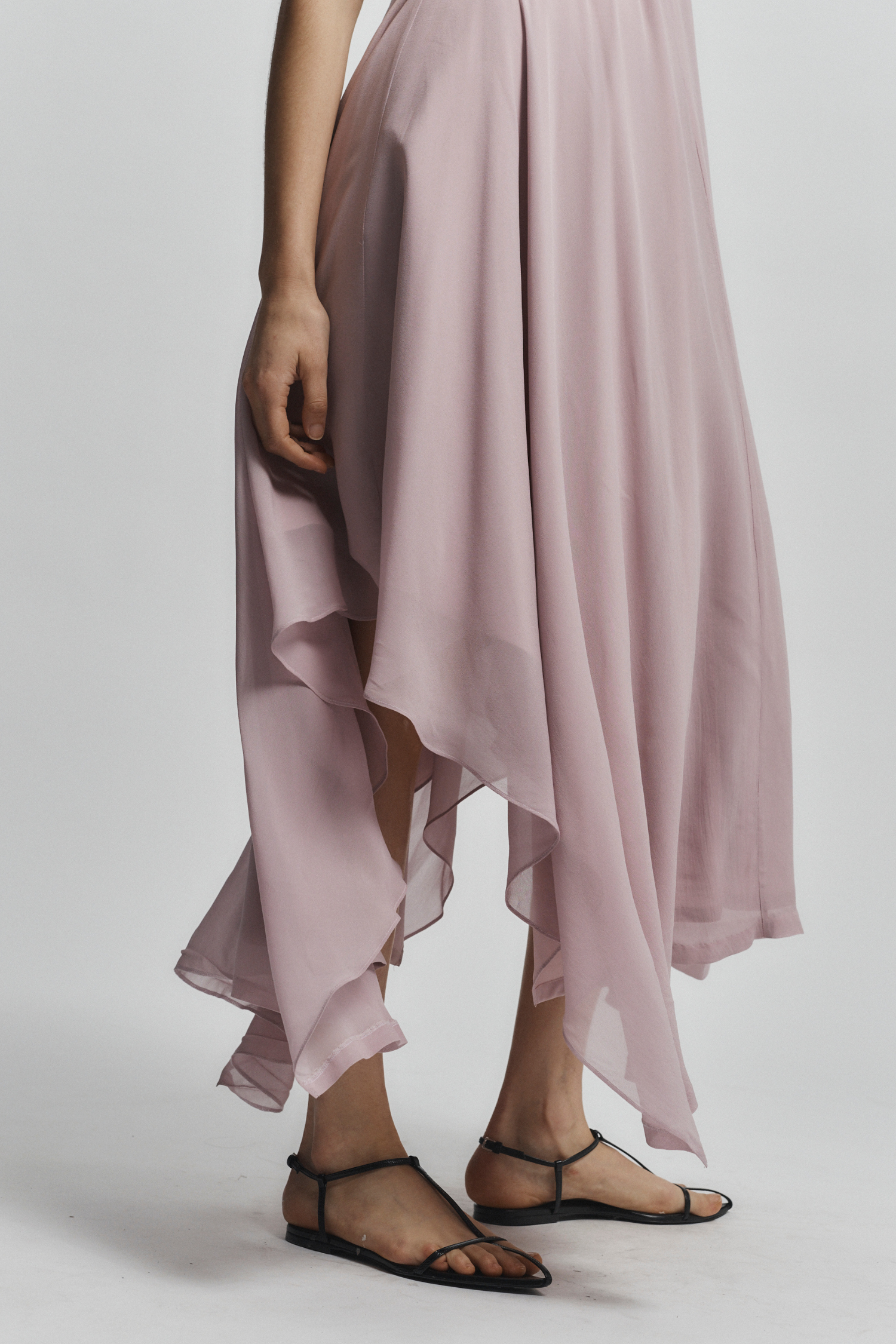 Expertly crafted from soft chiffon fabric, the Riley Handkerchief Dress features a flattering v-neck and elegant draping. The dusty pink color adds a touch of romantic charm to this versatile maxi dress.