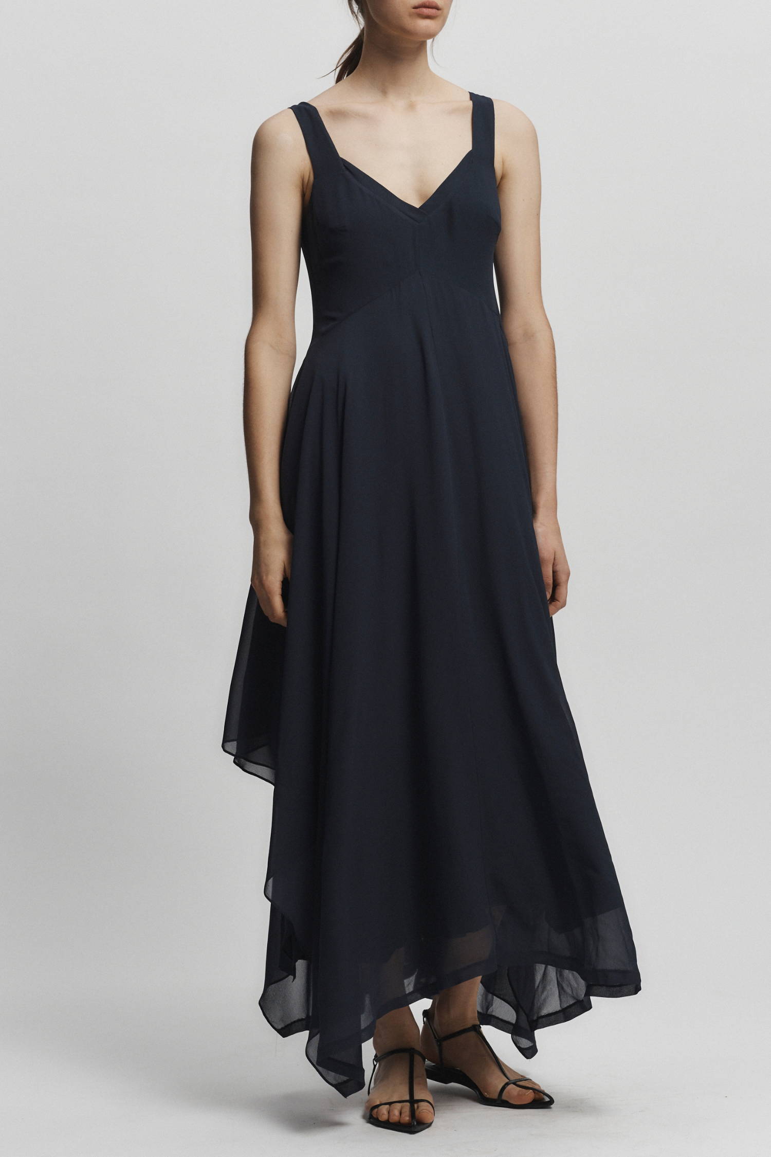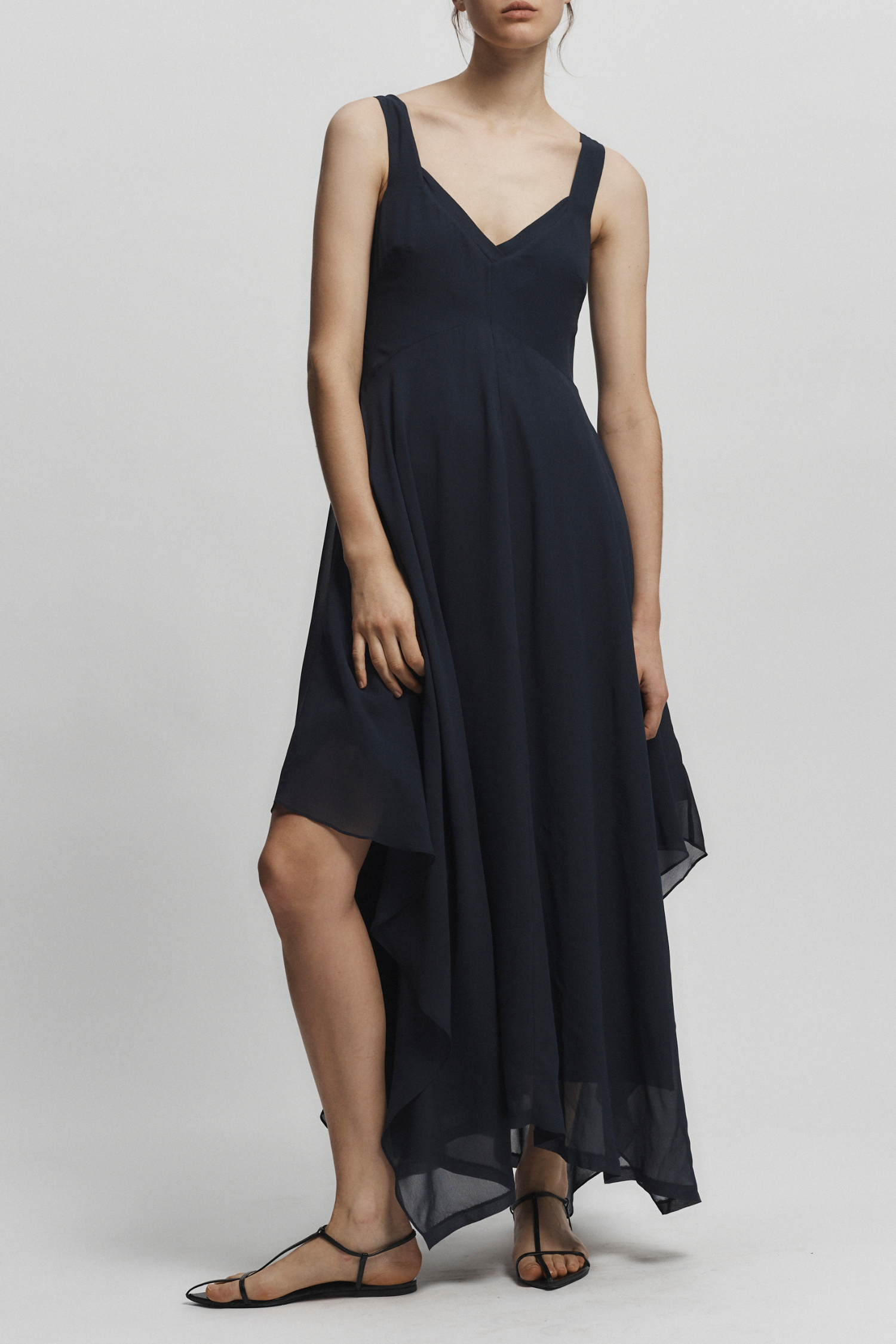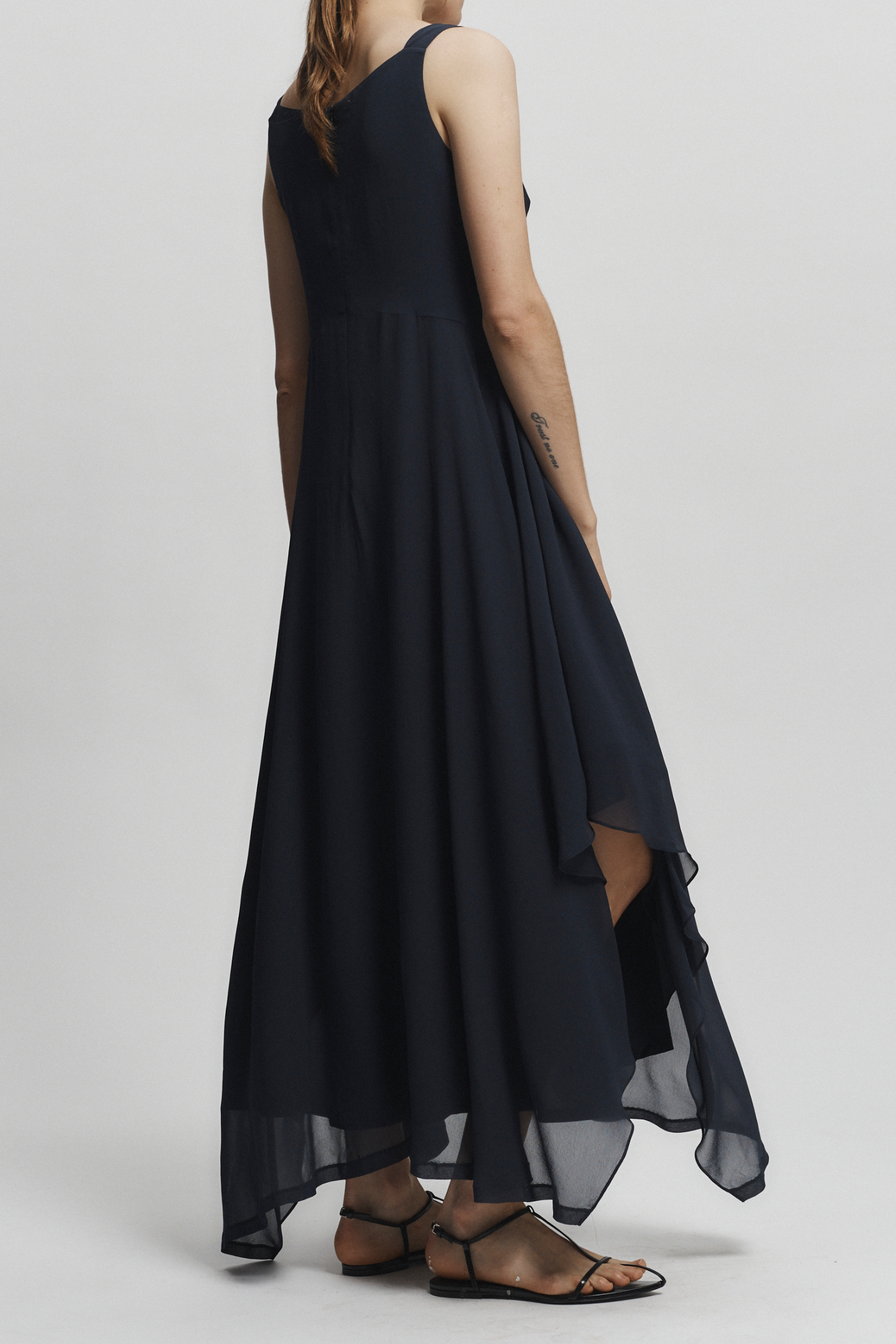 Expertly designed with soft chiffon fabric, the Riley Handkerchief Dress in navy is a must-have addition to your wardrobe. The draped v-neck offers a touch of elegance, while the maxi length provides effortless style. Perfect for any occasion, this dress is a versatile and comfortable choice.