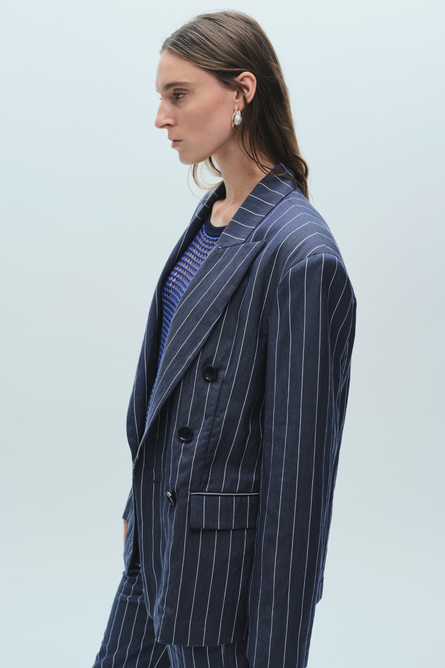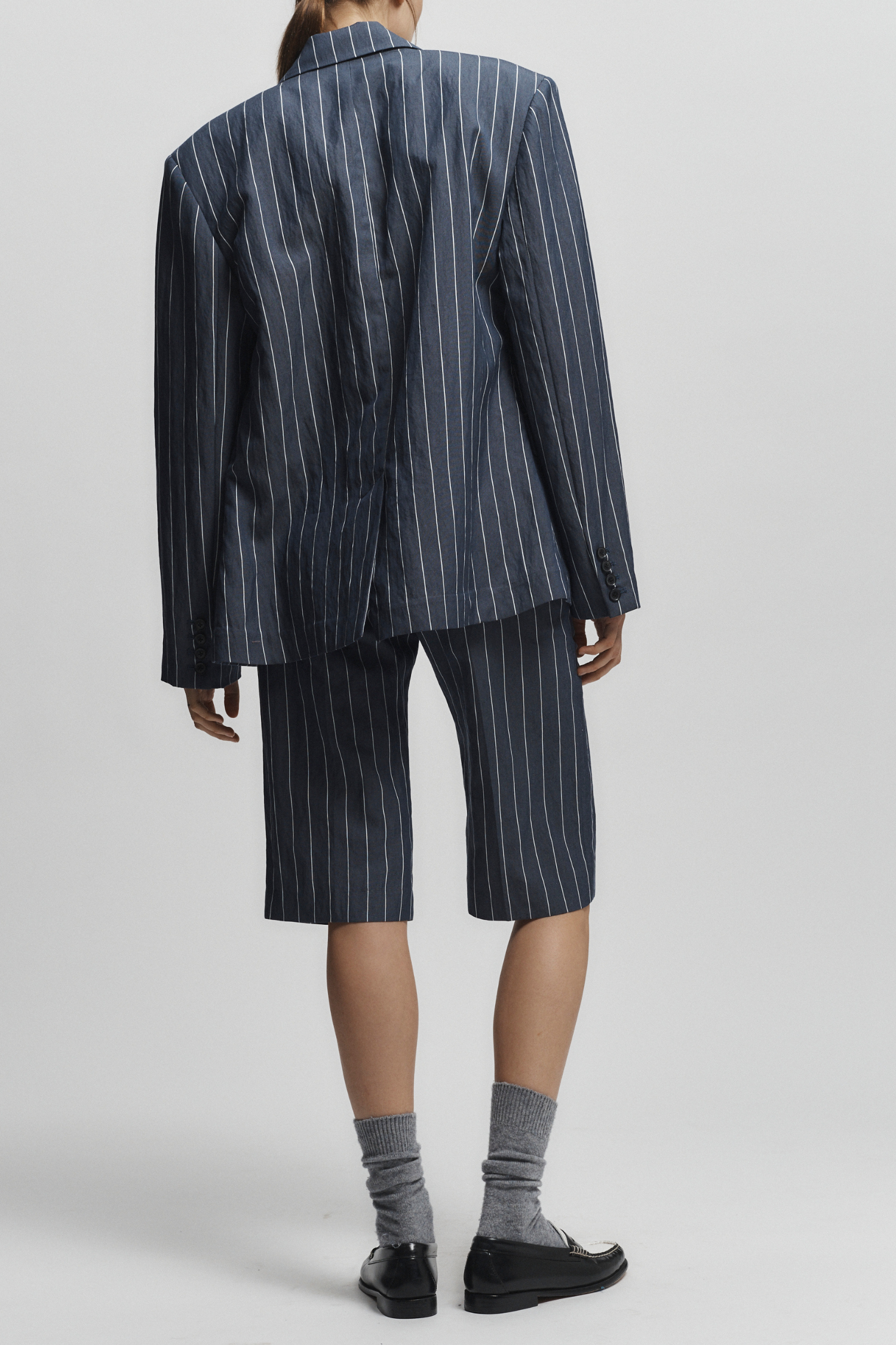 Expertly crafted with crinkle suiting fabric, the Santos Pinstripe Blazer in Navy is a versatile addition to your wardrobe. Designed to be paired with the Perla and Lucian short, this blazer offers a timeless and sophisticated look. Add a touch of elegance to any outfit with this must-have piece.