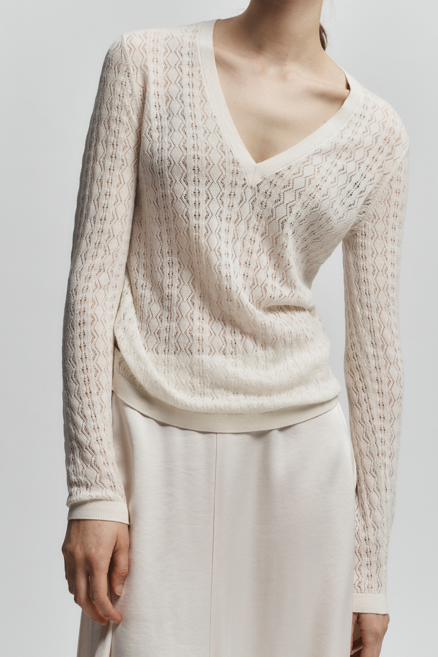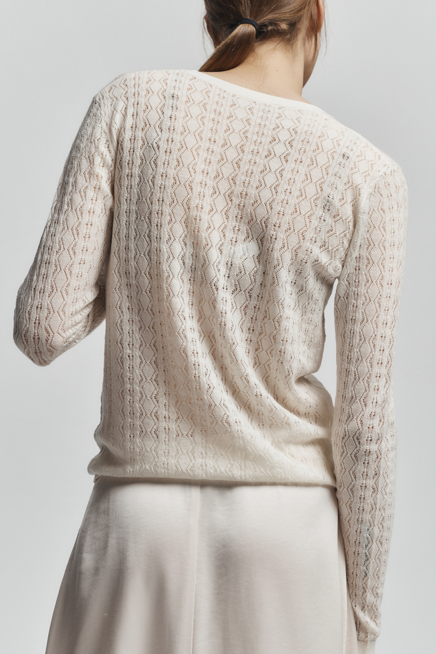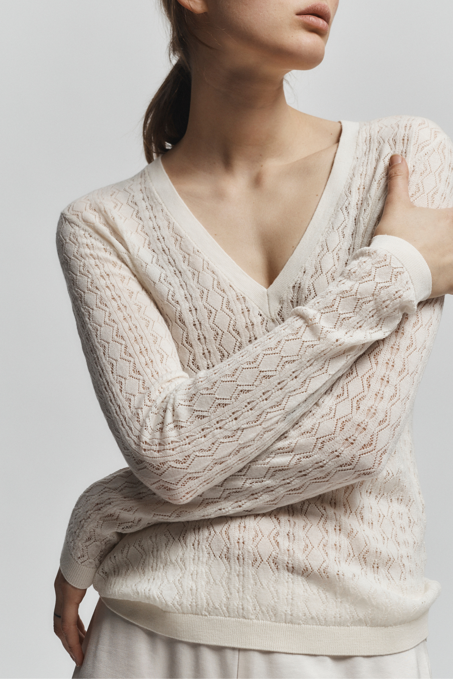Expertly crafted with merino wool, the Wren Pointelle Knit in Ivory offers a delicate pointelle knit and a flattering v-neck design. The semi-sheer fabric adds a touch of elegance and can be effortlessly paired with the Frieda skirt for a sophisticated ensemble.