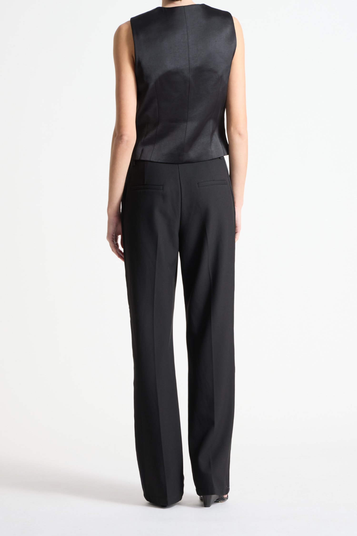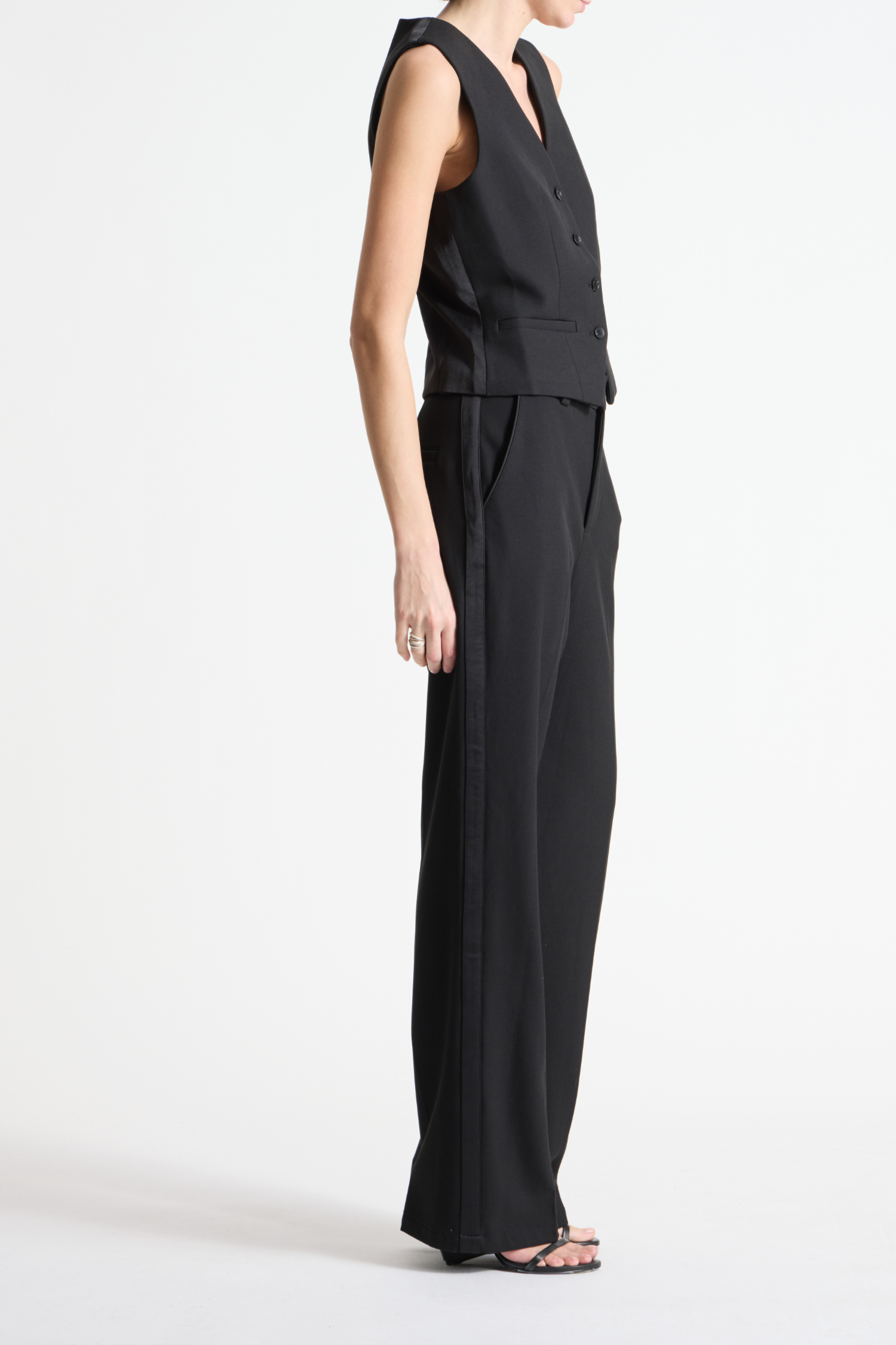 The Isla Waistcoat is crafted from a signature stretch suiting fabric, ensuring comfort and mobility. Its satin charmeuse back and satin binding on pockets enhance the garment's sophisticated appearance, making it suitable for both elevated daytime and evening occasions. This versatile piece seamlessly integrates into a classic wardrobe, providing a refined option.