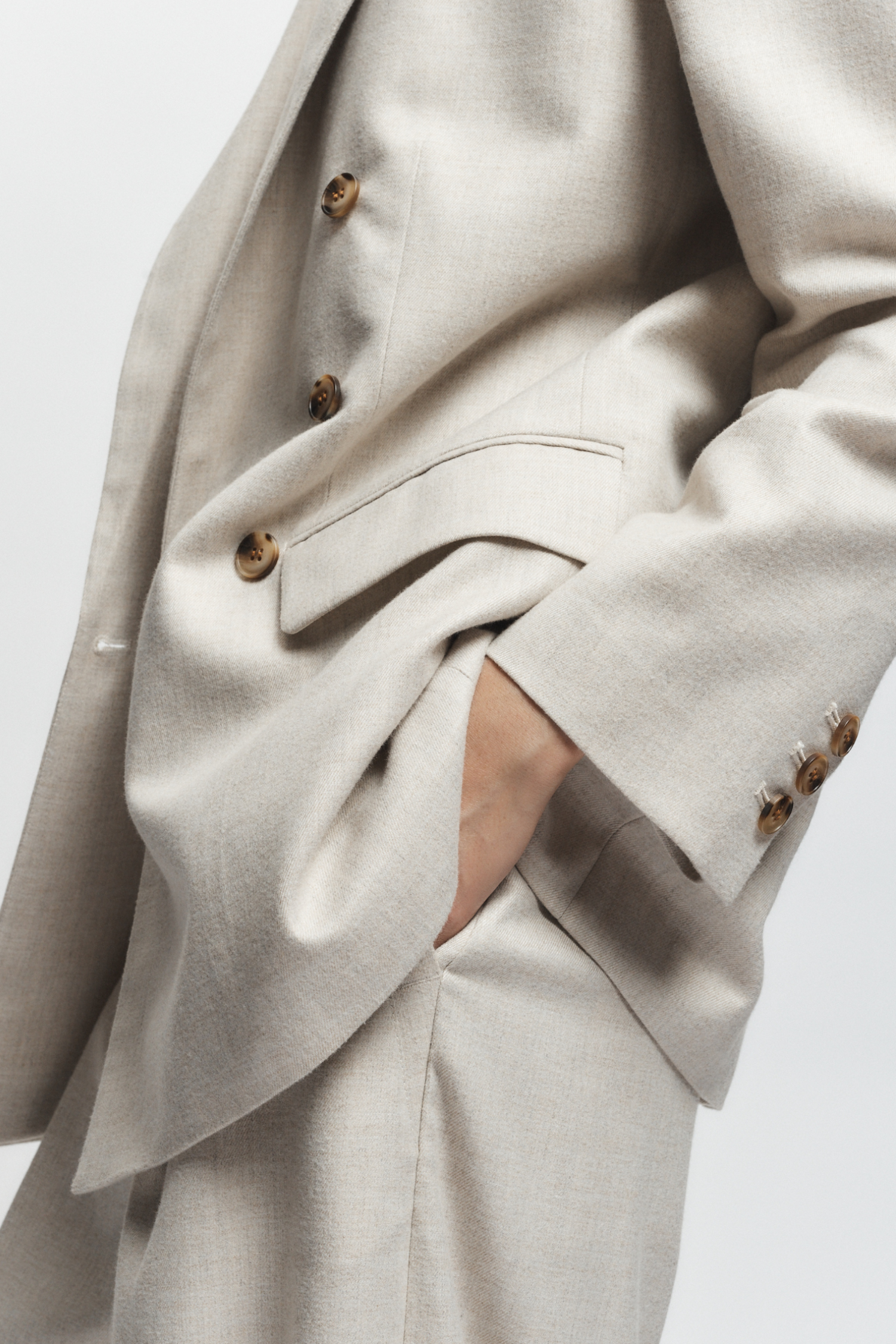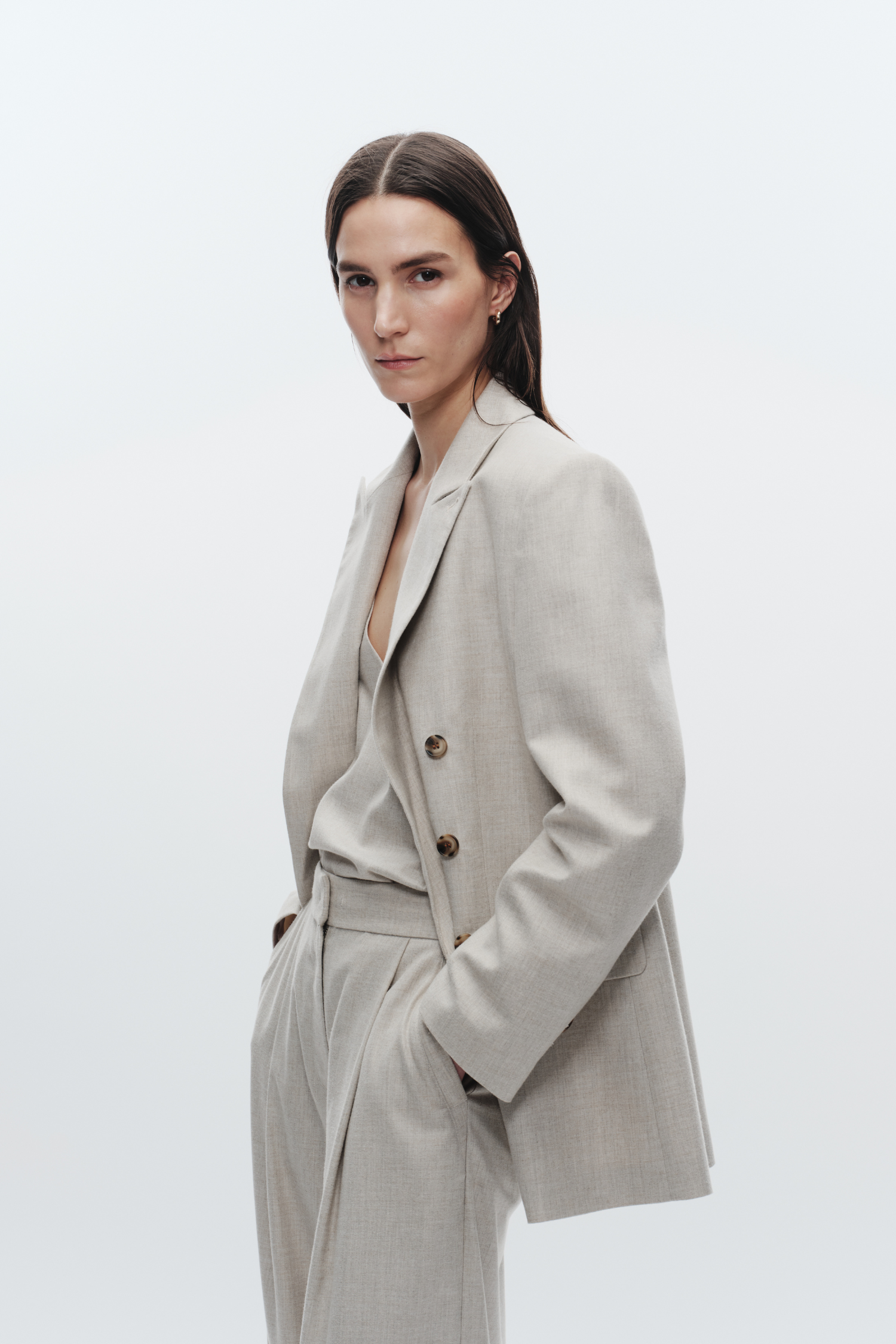 The Sullivan Double-Breasted Blazer in oatmeal features a longline cut and a relaxed fit throughout the body, offering a sophisticated yet comfortable silhouette. Its versatile design allows you to dress it up or down for any occasion. Pair it with the Nevin mid-waisted Ultra-soft trousers to create a polished, expert look that combines effortless style with refined tailoring.