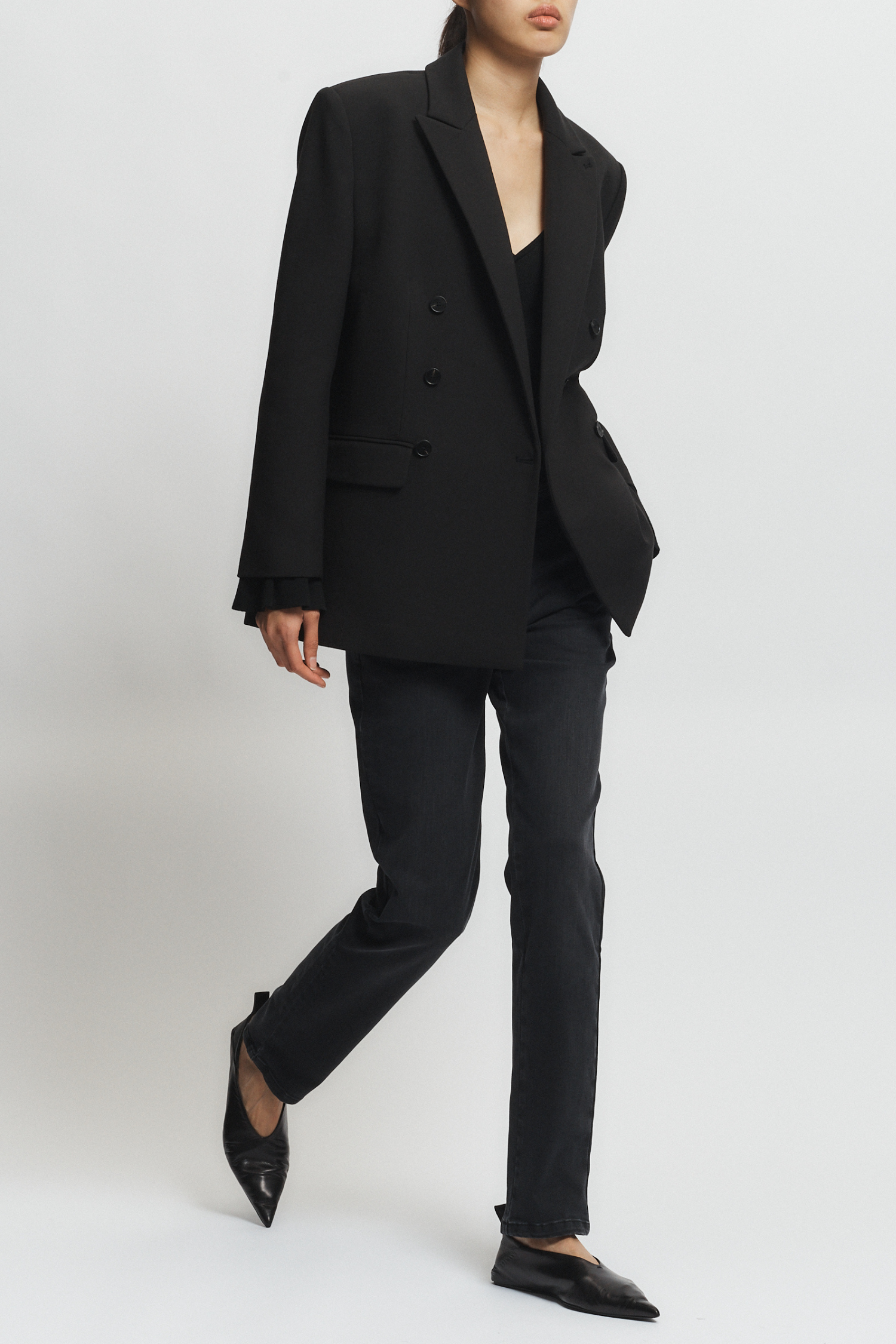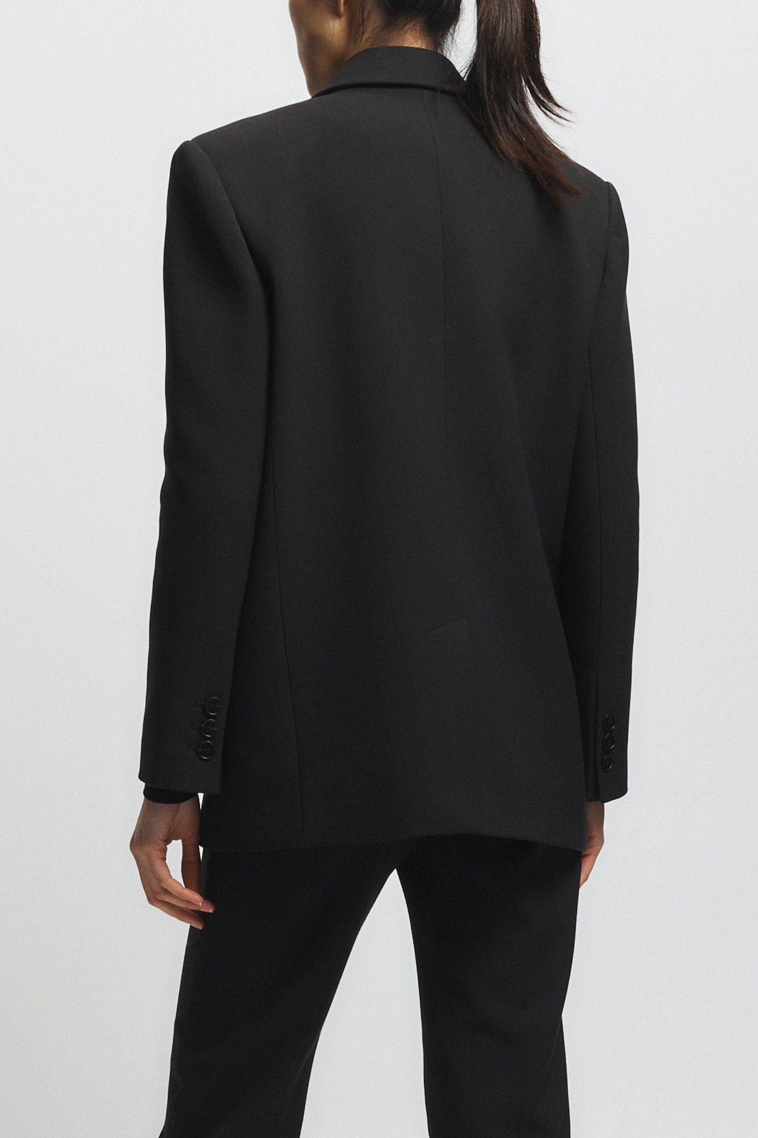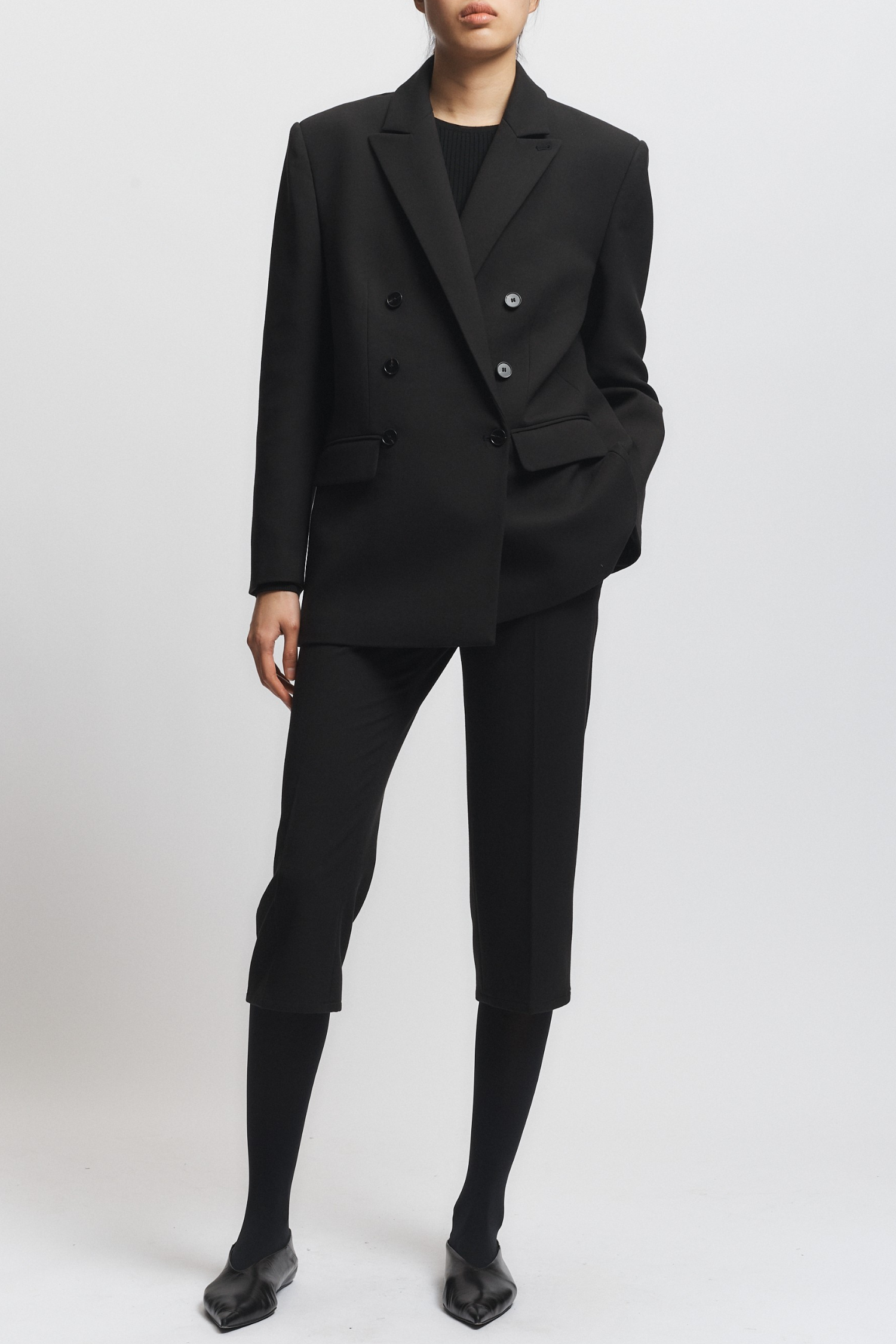 The Tanner Double-Breasted Blazer in black offers a sleek, elongated silhouette that enhances your professional wardrobe with a modern edge. Crafted for a tailored fit, its structured design pairs seamlessly with the Pedal Pusher for a cohesive, polished look. Ideal for those seeking refined style and versatility, this blazer elevates any ensemble with its timeless appeal and expert craftsmanship.