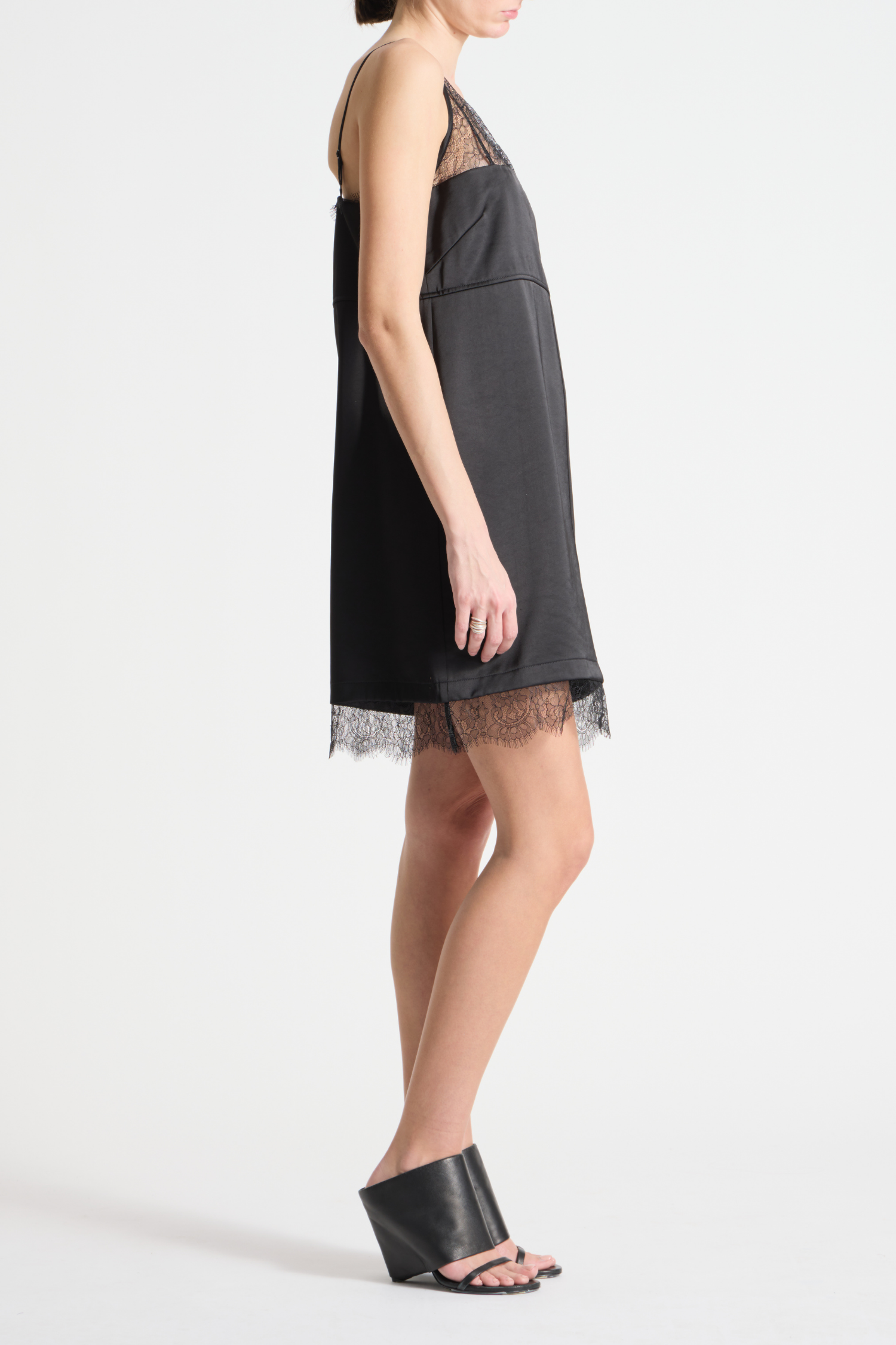Zanya Lace Charmeuse Dress in Black Luxurious charmeuse meets delicate lace in this refined mini dress. The fluid fabric drapes with understated elegance, while strategic lace detailing adds sensual dimension without compromising sophistication. A streamlined shift silhouette creates an effortless silhouette that transitions seamlessly from evening occasions to elevated casual moments. The interplay of soft textures and clean lines defines modern luxury dressing.