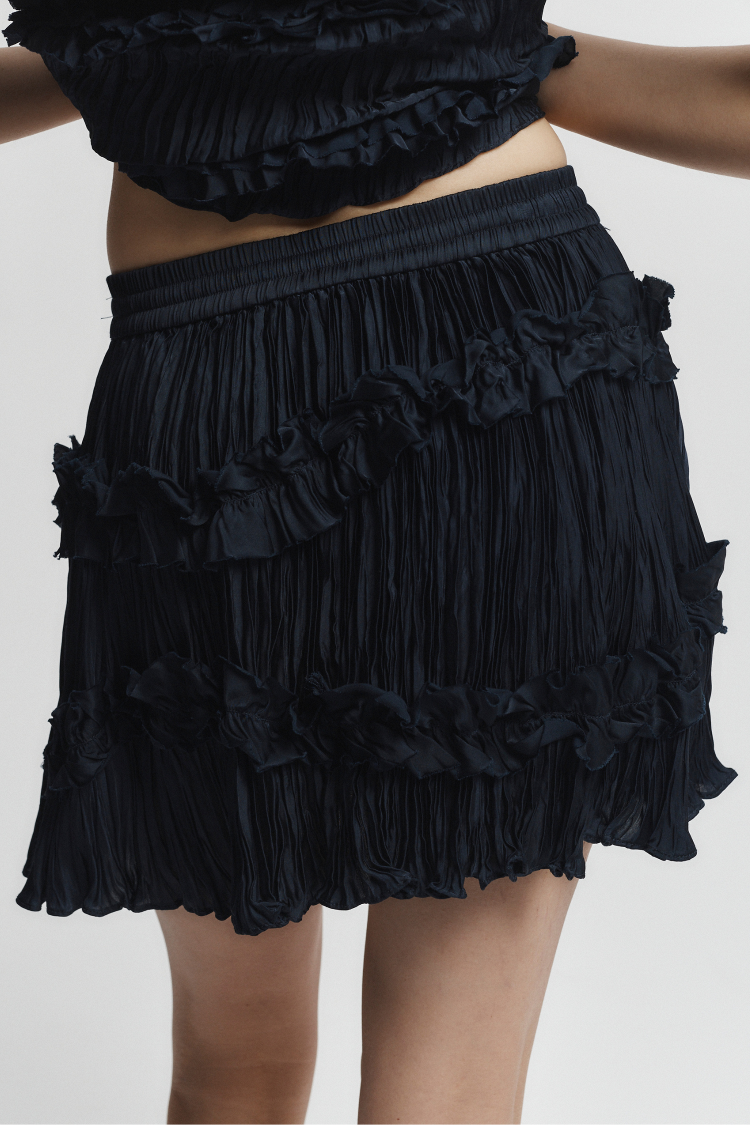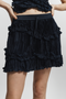 The Grace Ruched Mini Skirt is a feminine and versatile addition to your wardrobe. The ruched ruffles add a unique touch, while the adjustable tie waist allows for a comfortable and individualized fit. With its flouncy silhouette and slight sheen, this skirt is perfect for any occasion. Available in a beautiful deep navy color.