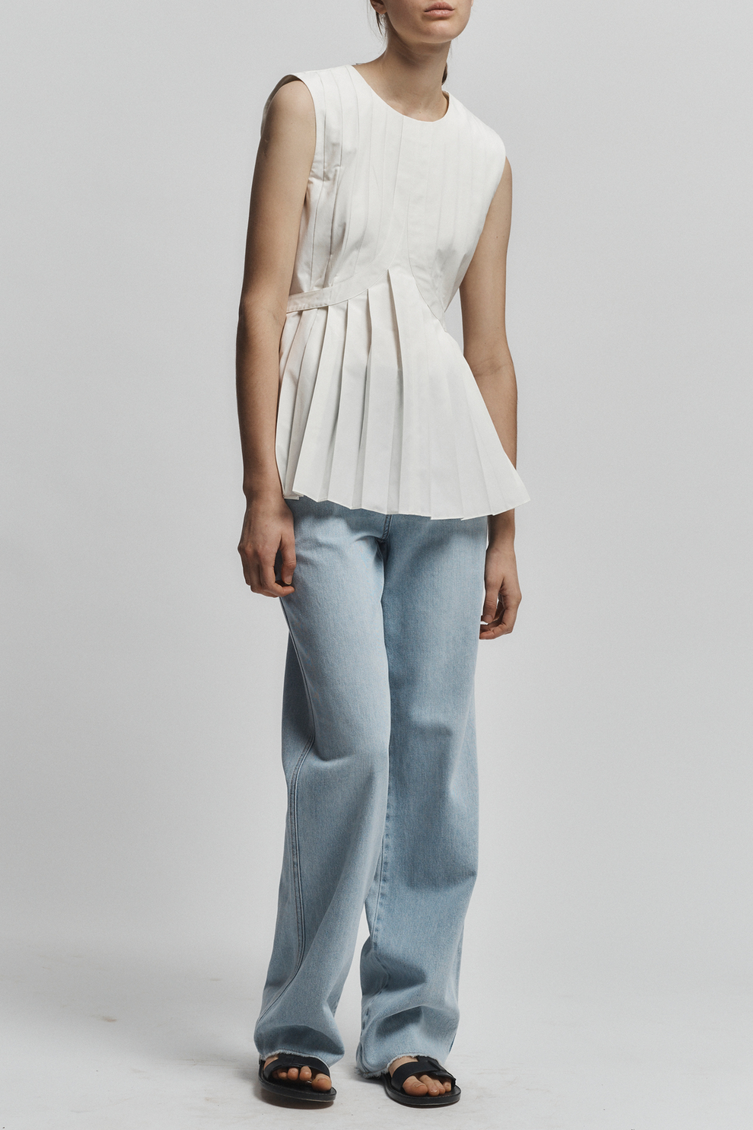 The Kallie Pleated Top is a versatile and sophisticated addition to your wardrobe. Made from a blend of cotton and poly poplin, it features delicate pleats and a flattering belt to accentuate your figure. In a crisp white color, this top pairs perfectly with the Nessa denim pant in 80s pale wash for a timeless and polished look.